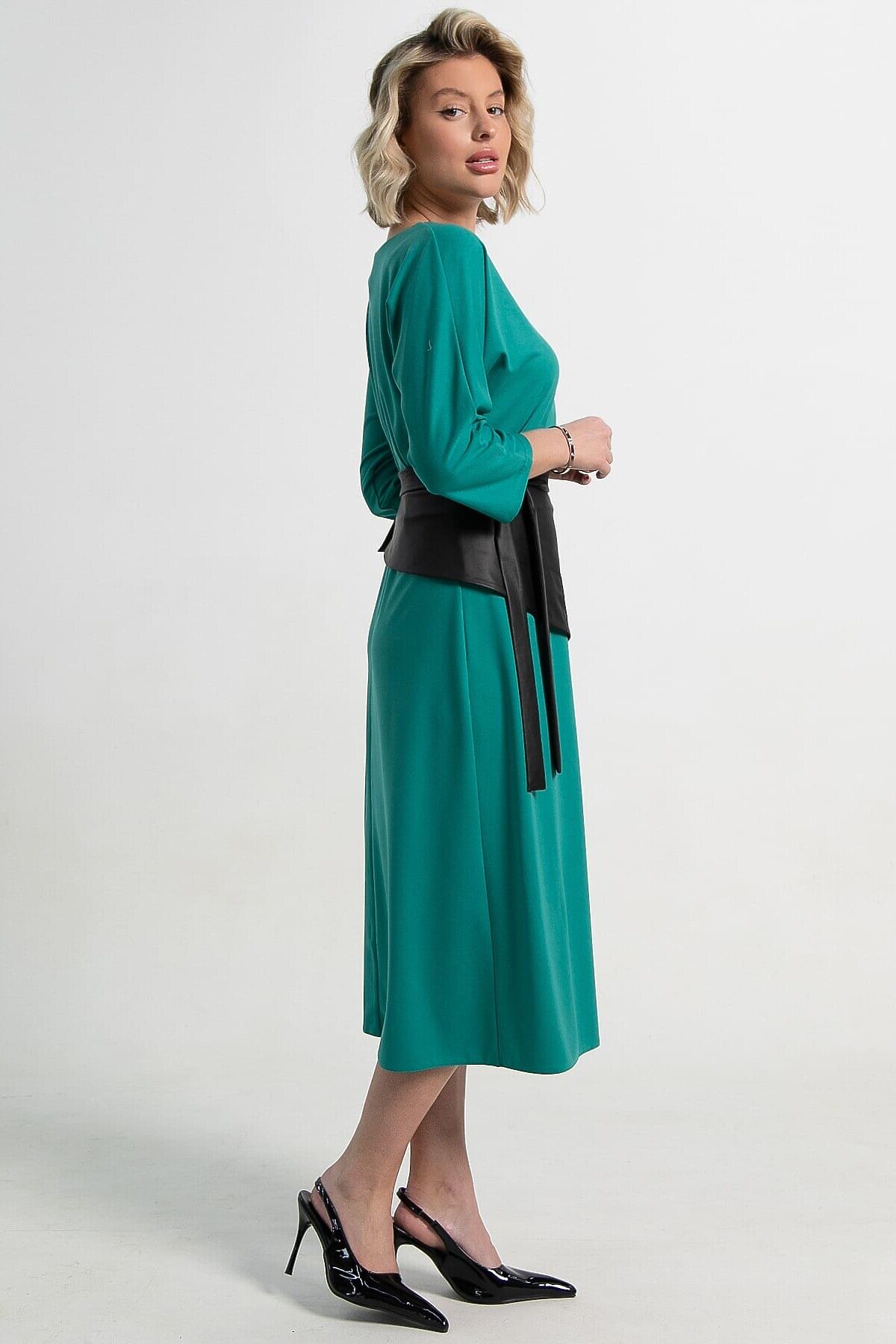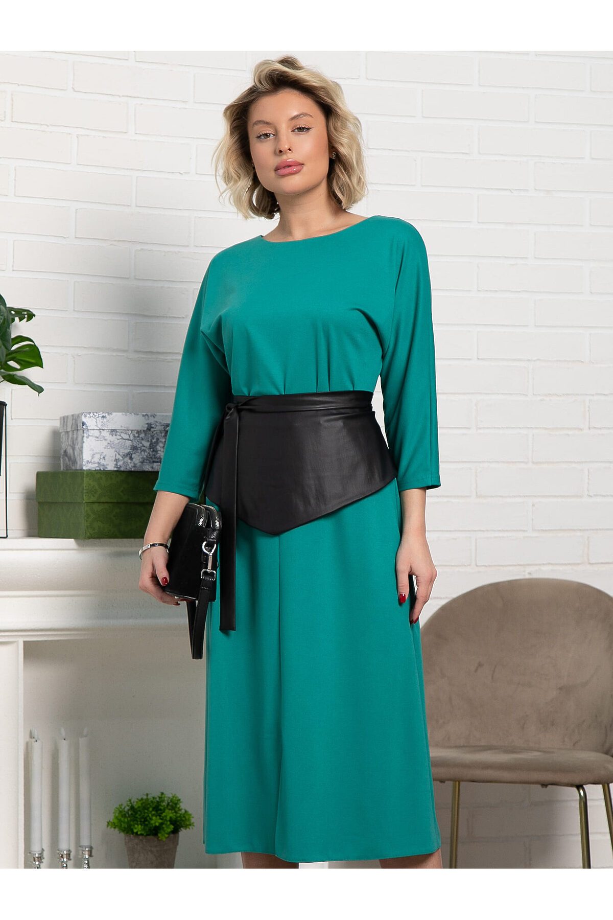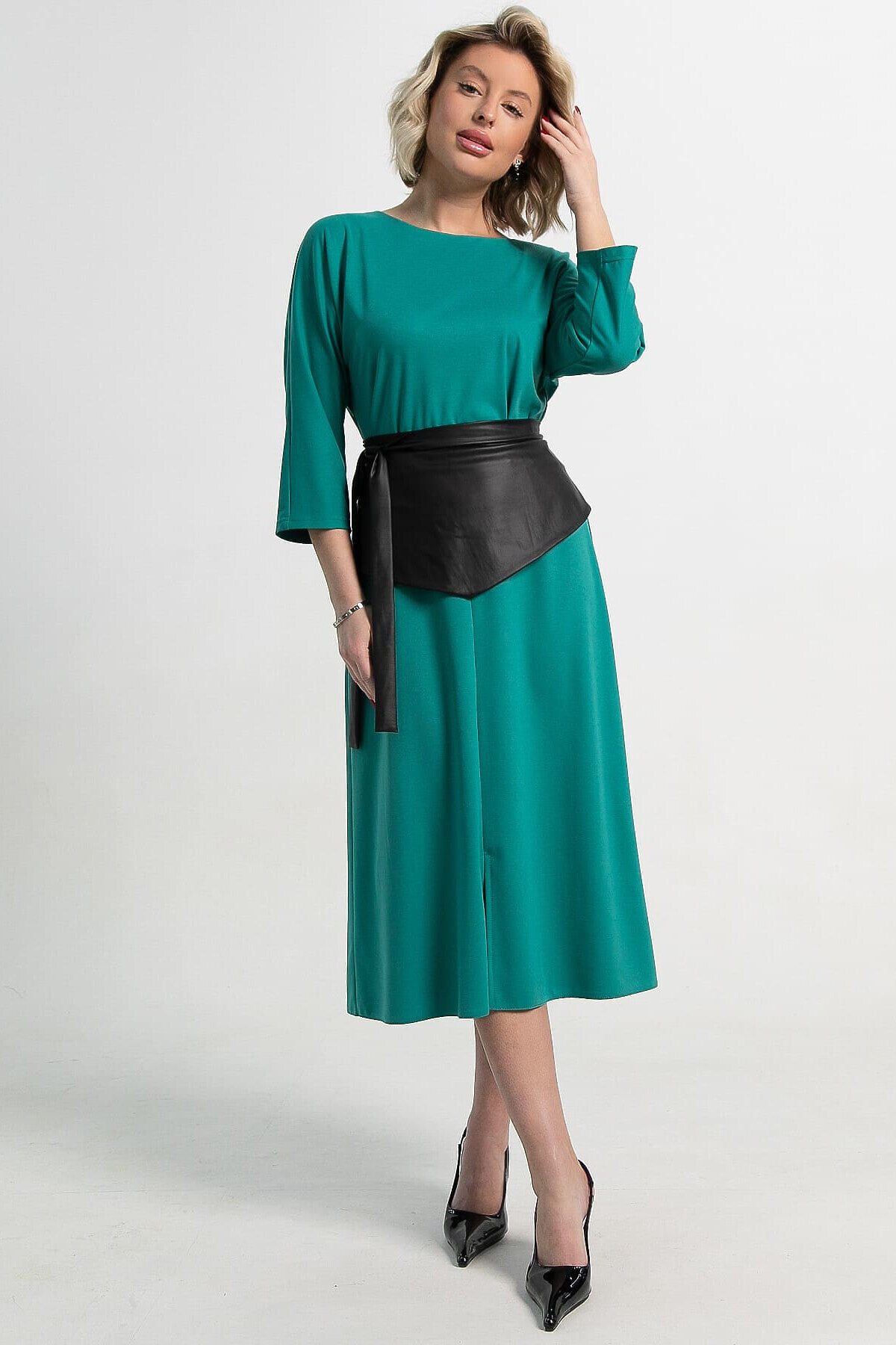 Элегантное полуприлегающее платье средней длины с отрезной линией талии и расширенной юбкой, которая красиво расширяется к низу. Передняя часть украшена стильным разрезом, добавляющим образу изящества. Модель выполнена с цельнокроеным рукавом длиной 3/4 и округлой горловиной, создавая комфортный и современный силуэт. Главной особенностью этого платья является оригинальный пояс-баска из экокожи, с удлинением на один уголок и длинными концами. Пояс можно завязывать по-разному: например, перехлестнуть сзади и оставить концы спереди, что позволяет создавать уникальные образы. Идеальный выбор для тех, кто ценит стиль и оригинальность.