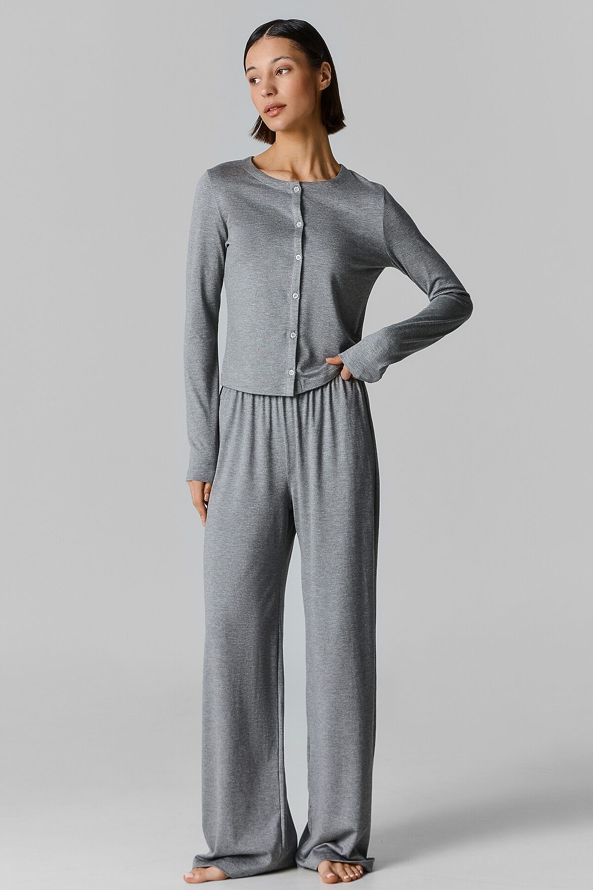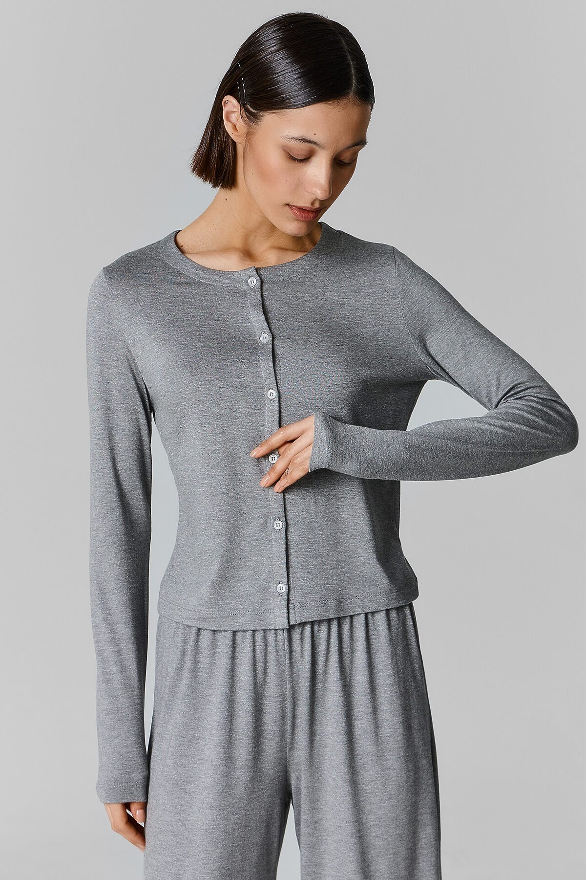 Женский домашний кардиган прилегающего силуэта из эластичной вискозы — это элегантная и универсальная модель, которая подчеркивает фигуру и дарит ощущение уюта. Округлая горловина придает образу мягкость, а длинные рукава делают кардиган подходящим для любого времени года. Центральная застежка на пуговицы с петлями добавляет классический акцент и позволяет регулировать степень открытости. Низ изделия и рукавов аккуратно обработан швом вподгибку, что придаёт модели завершенный и опрятный вид. Эластичная вискоза в составе обеспечивает мягкость, отличную посадку и приятные тактильные ощущения, а также позволяет изделию сохранять форму даже после многократных стирок. Для создания стильного и гармоничного домашнего образа рекомендуем дополнить кардиган подходящими брюками из коллекции бренда. Такой комплект станет отличным выбором для отдыха дома, уютных вечеров или расслабленных выходных.