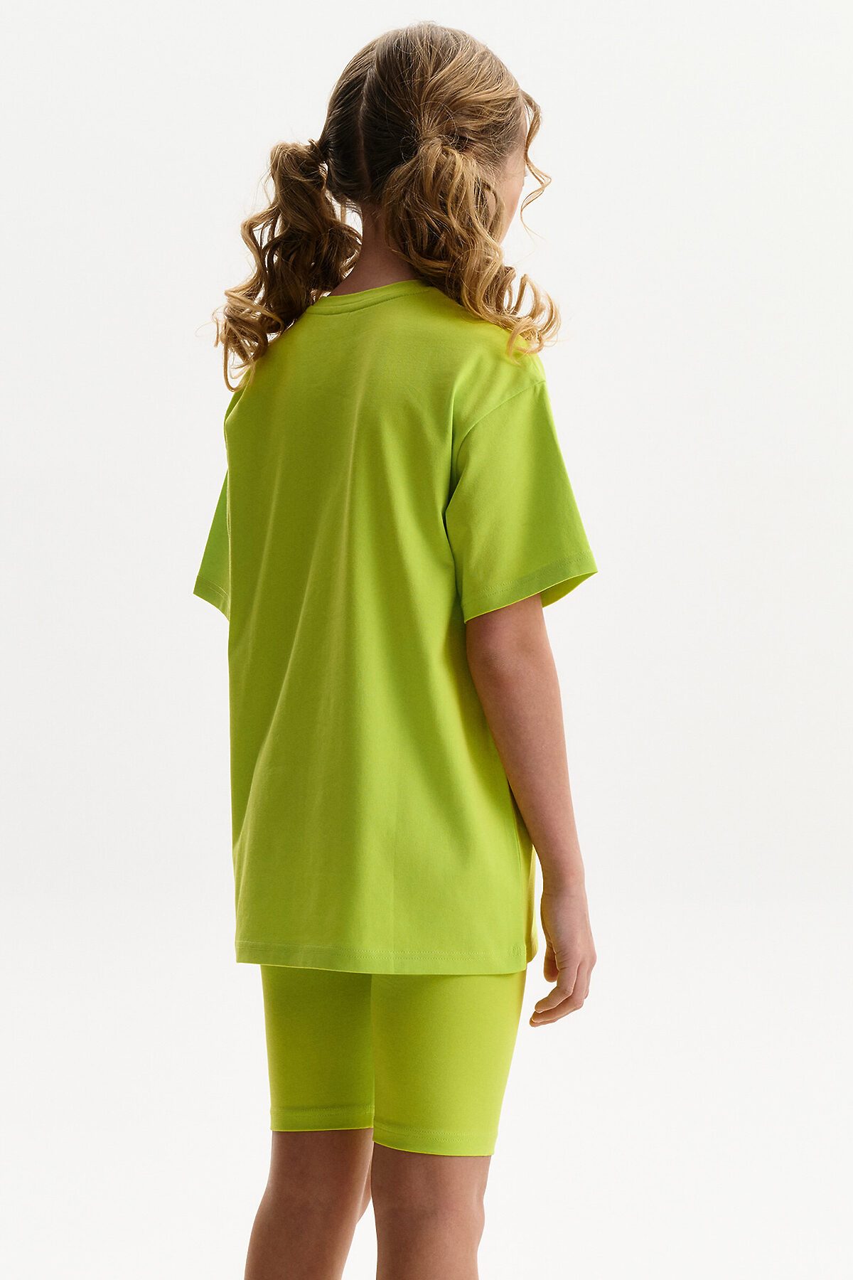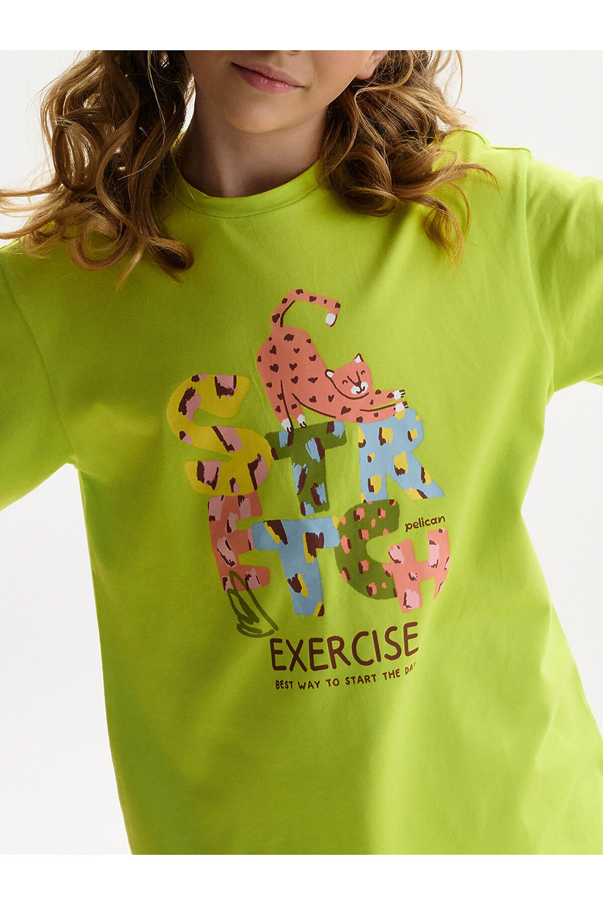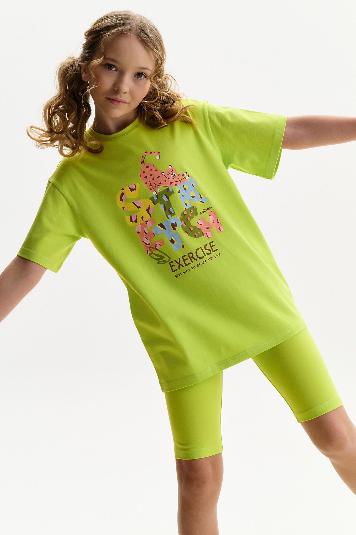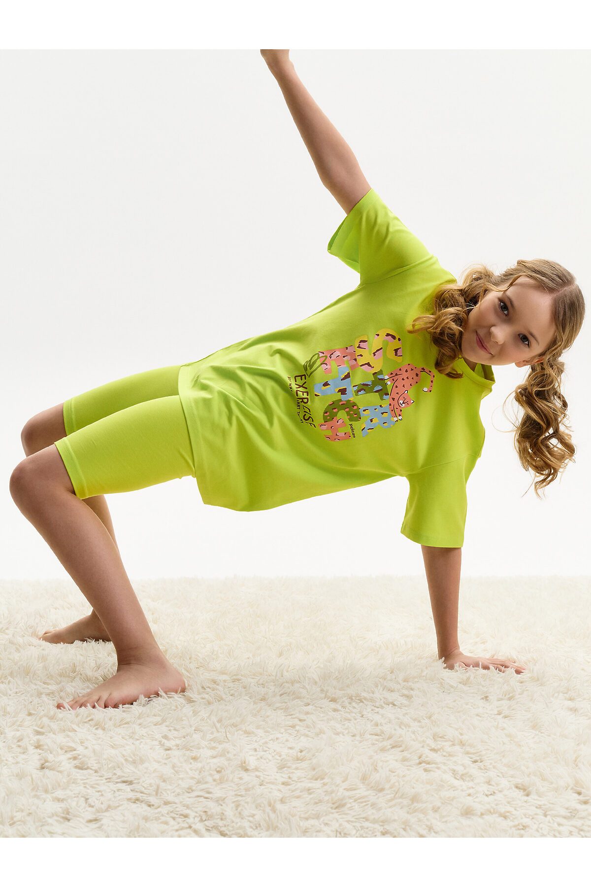 Детский пижамный костюм двойка - это удлиненная футболка с коротким рукавом и удобные велосипедки, выполненные из натуральных материалов. Пижама для девочки изготовлена из 100% хлопка. Футболка умеренного объема, плечо немного спущено, рукава широкие. Широкая и мягкая резинка в поясе велосипедок не перекручивается и не давит. Отделка горловины из эластичной рибаны — она не растягивается, ребёнку удобно надевать и снимать пижаму. Перевод принта: "УПРАЖНЕНИЕ на РАСТЯЖКУ - лучший способ начать день"