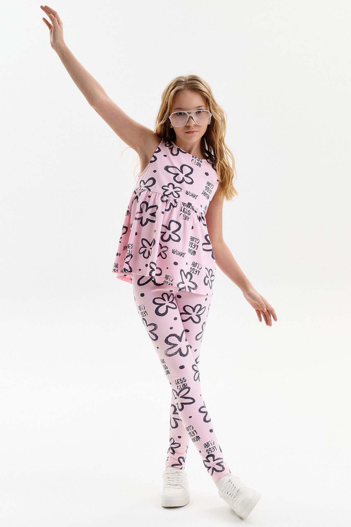 Новая модель. Топ для девочки. Выполнен из мягкого хлопкового трикотажа с добавлением эластана. Имеет трапециевидный силуэт. Верхняя часть выполнена в форме майки с аккуратно обработанными горловиной и проймами. Нижняя часть присборена — за счёт этого топ красиво садится и выглядит нарядно. Перевод: клуб «Беспокойтесь меньше».