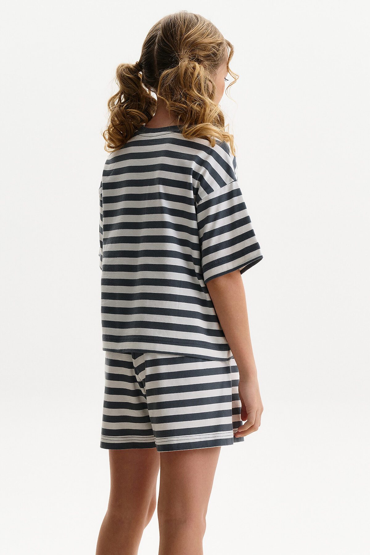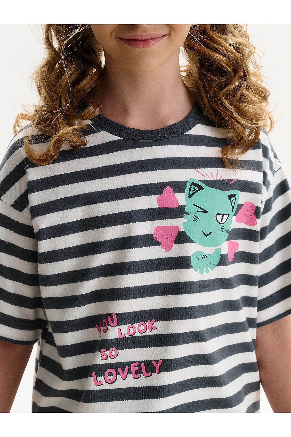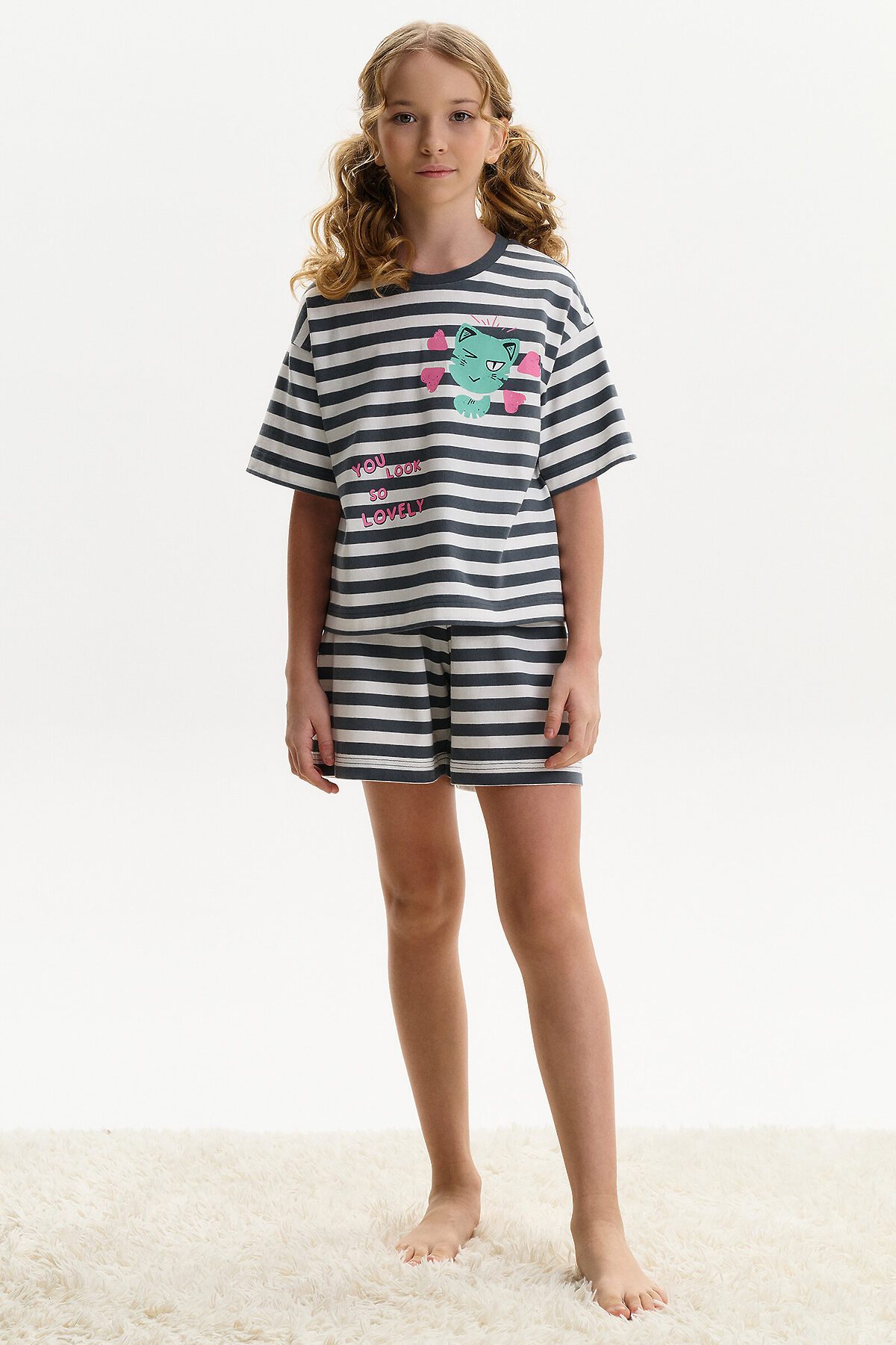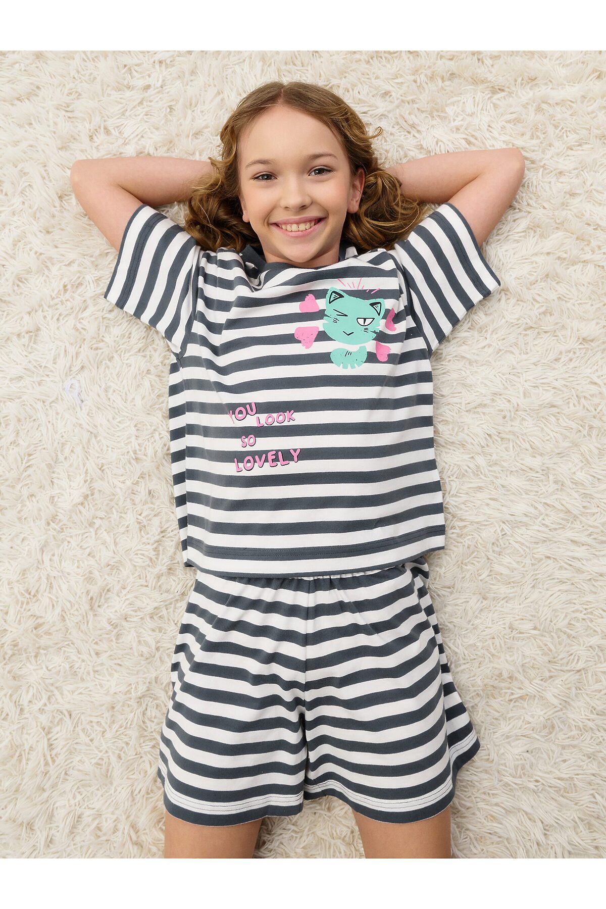 Детский пижамный костюм двойка - это мягкая укороченная футболка свободного кроя с коротким рукавом и широкие удлиненные шорты, выполненные из натуральных материалов. Пижама для девочки изготовлена из 100% хлопка. Широкая и мягкая резинка в поясе шортов не перекручивается и не давит. Отделка горловины из эластичной рибаны — она не растягивается, ребёнку удобно надевать и снимать пижаму. Перевод текста: "ты выглядишь так прекрасно".