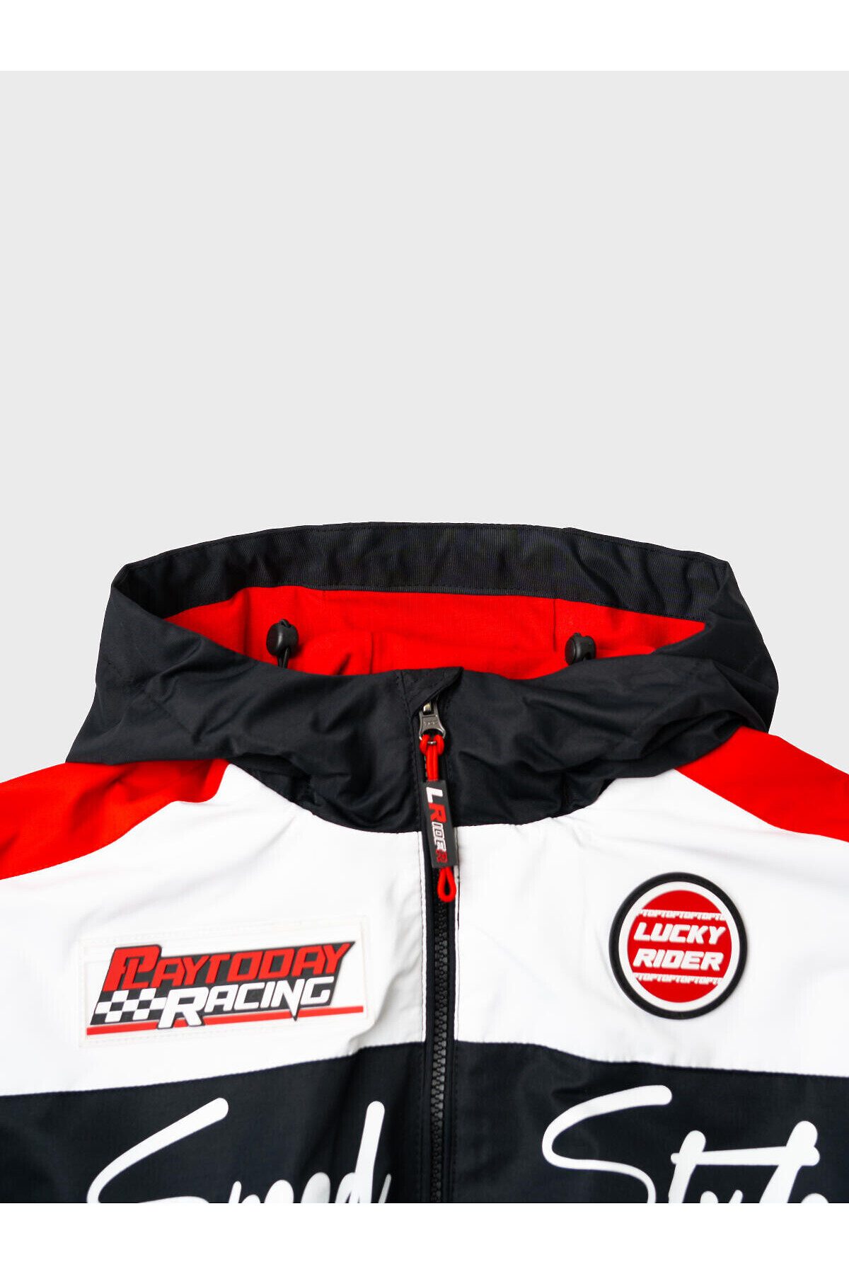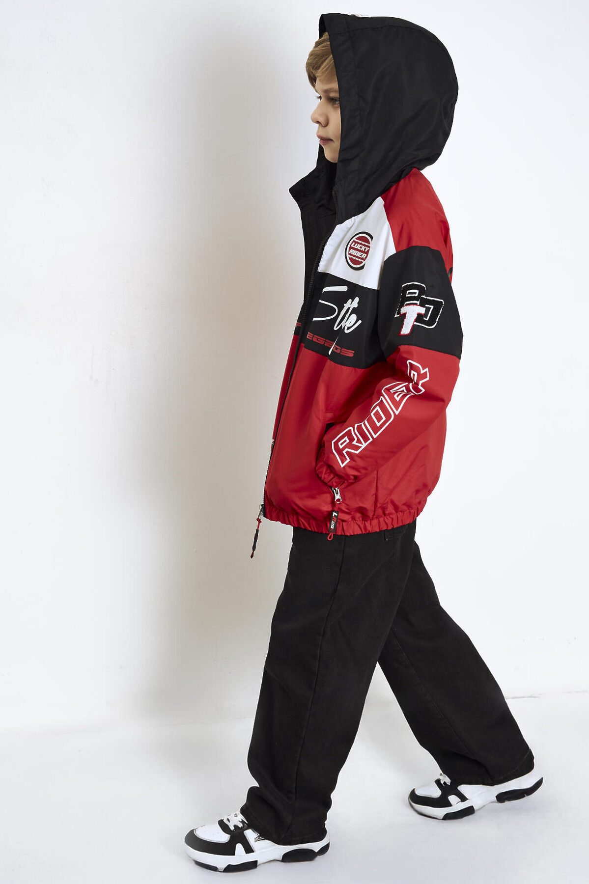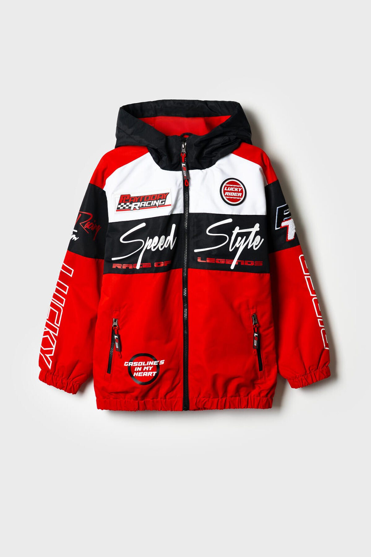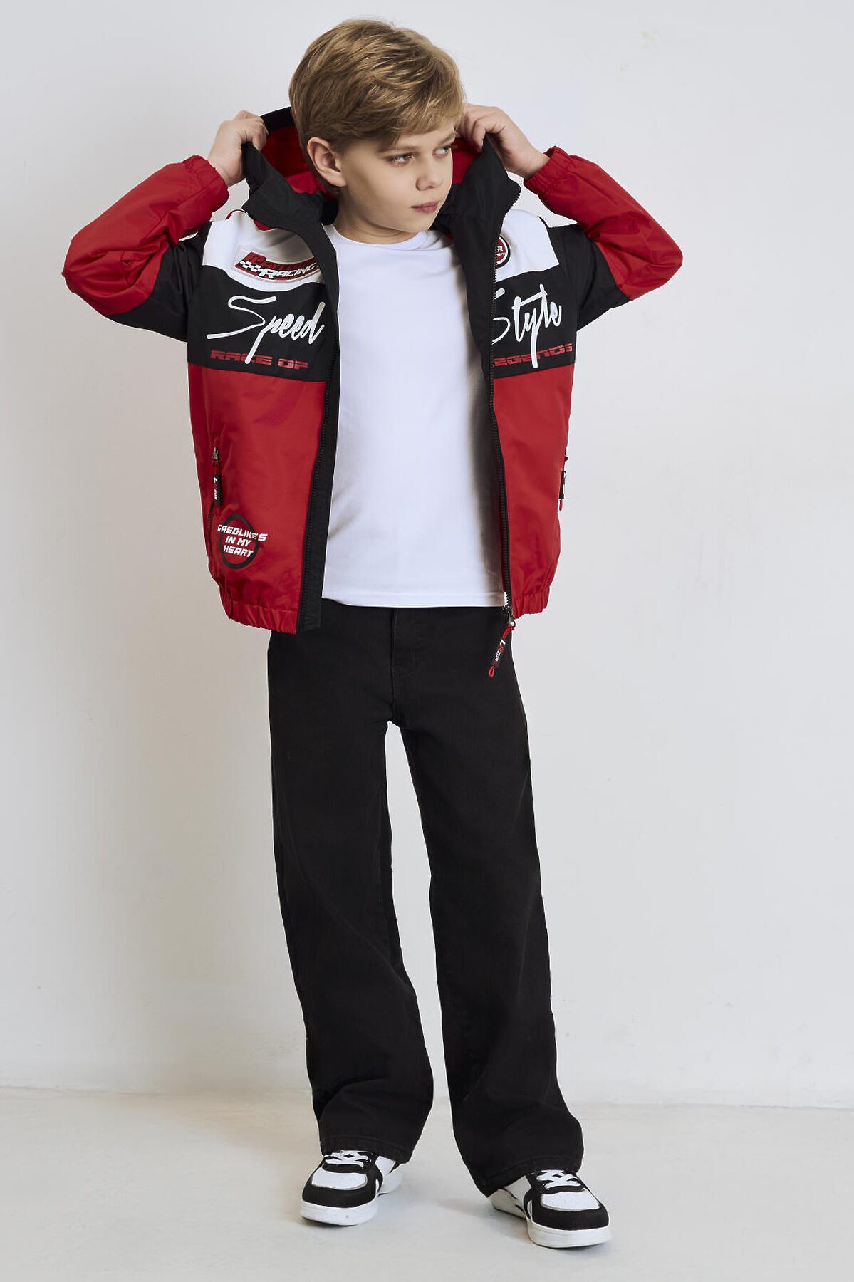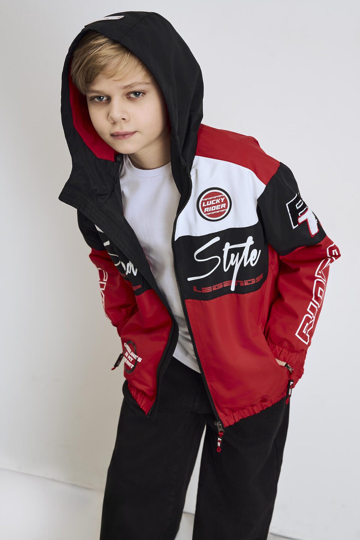 Ветровка на трикотажной подкладке для мальчика подростка в спортивном стиле с ярким гоночным дизайном. Температурный режим от +20С до +10С. Капюшон на утяжке стопперами, рукава и низ собраны на резинку. Боковые карманы на молнии. Светоотражающие элементы. Практичная, яркая и легкая куртка идеально подойдёт для демисезонного ношения.