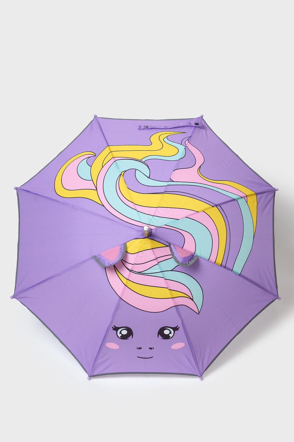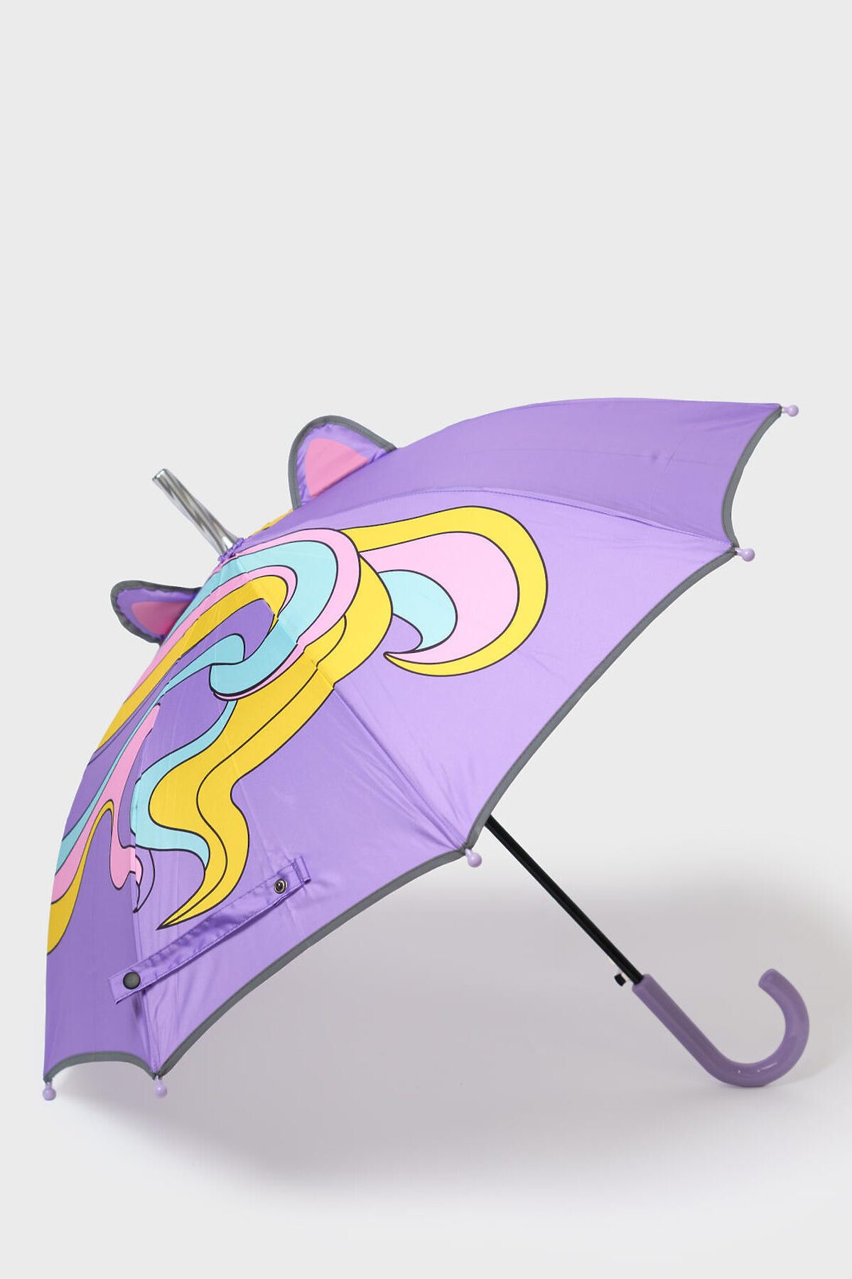 Зонт-трость для девочек, любящих единорогов. Наконечник зонта выполнен в виде рога единорога. Объемные ушки единорога имеют светоотражающую окантовку, поэтому ребенка с зонтом хорошо видно в темное время суток на дороге. Зонт идеально сочетается с резиновыми сапогами из коллекции. Длина 67 см, диаметр купола 76 см. Механизм складывания - полуавтомат.