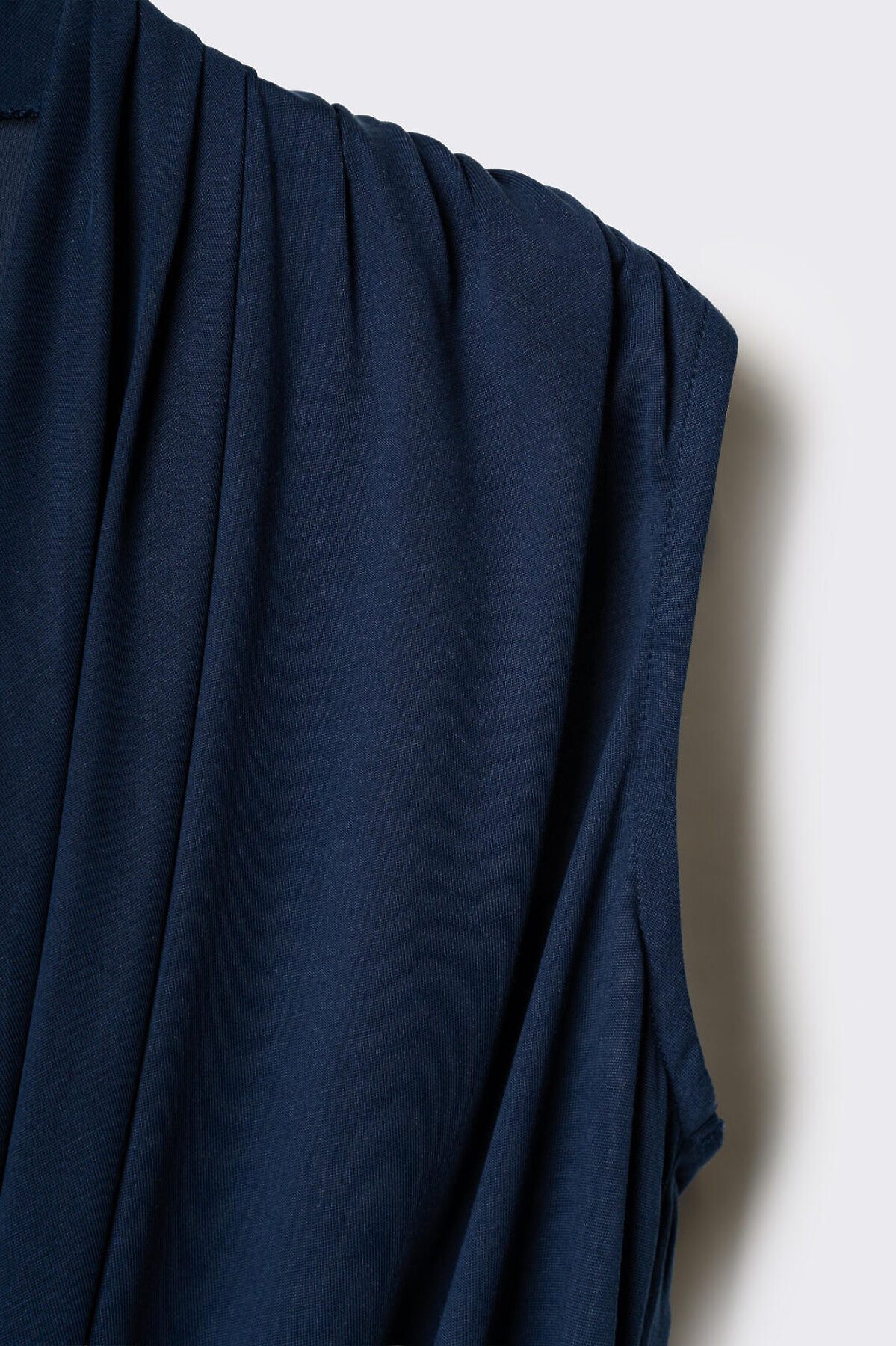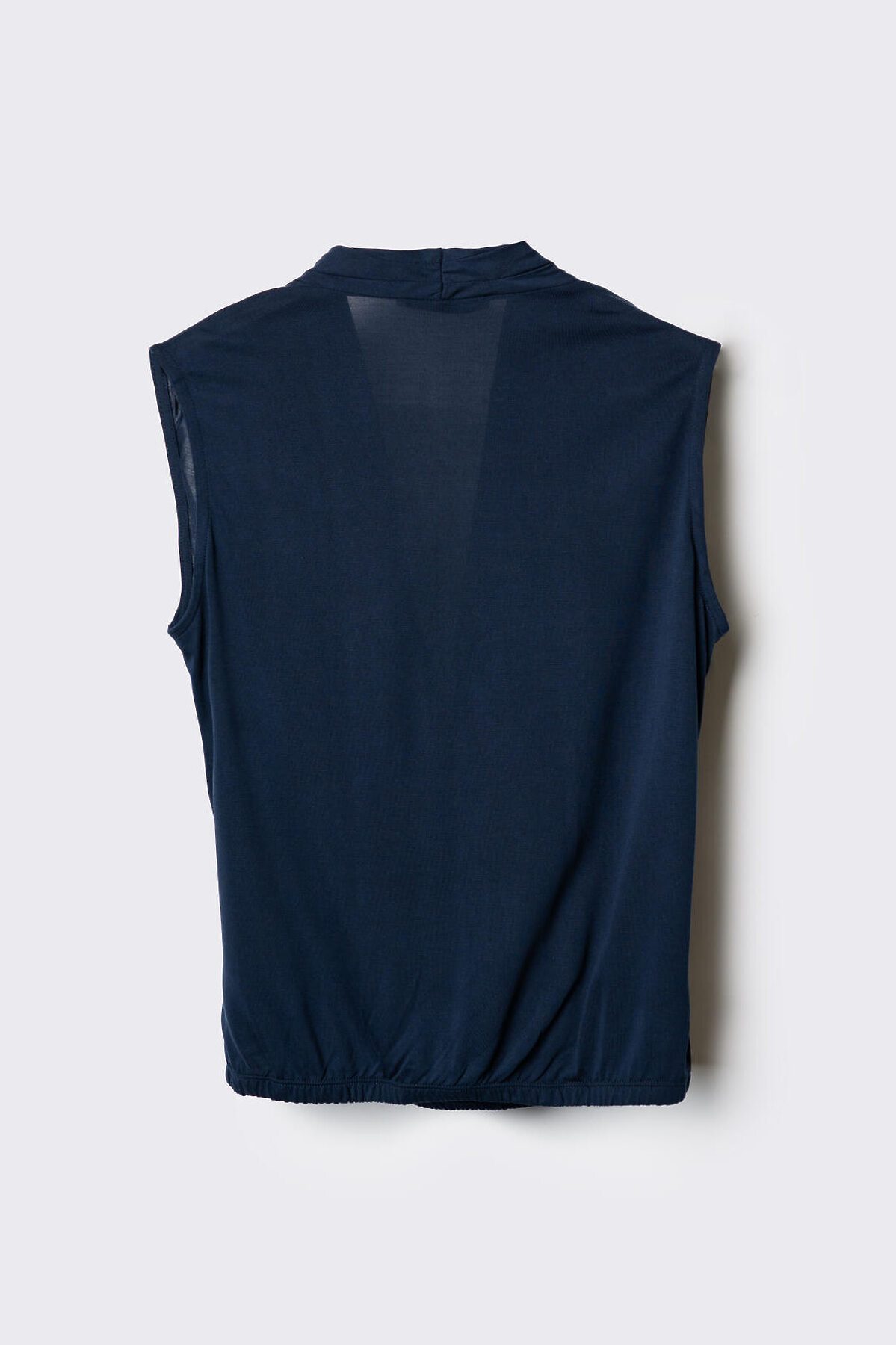 Женский топ без рукавов. Выполнен из мягкого эластичного трикотажа. Спереди — глубокий запах с драпировкой, придающей изделию объём. На спинке — скрытая застёжка-молния. Низ обработан внутренней резинкой для комфортной посадки.