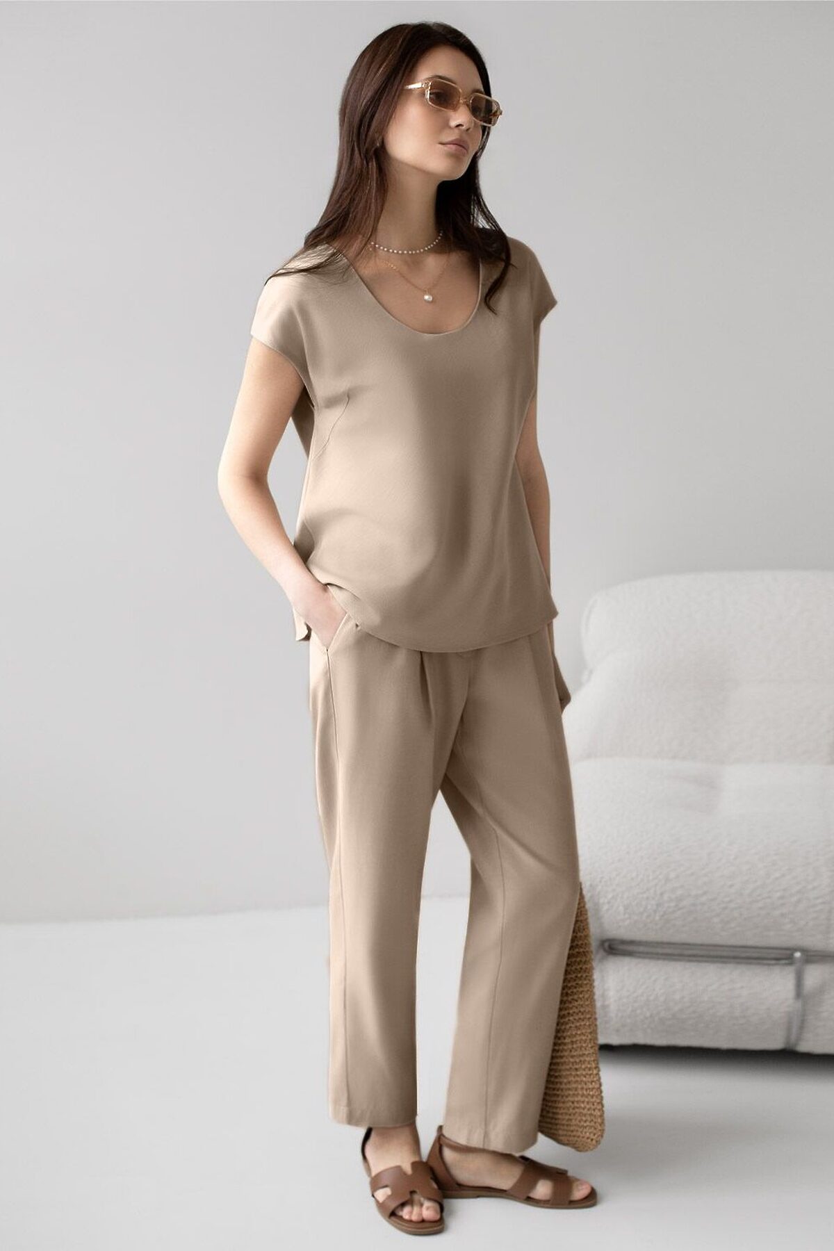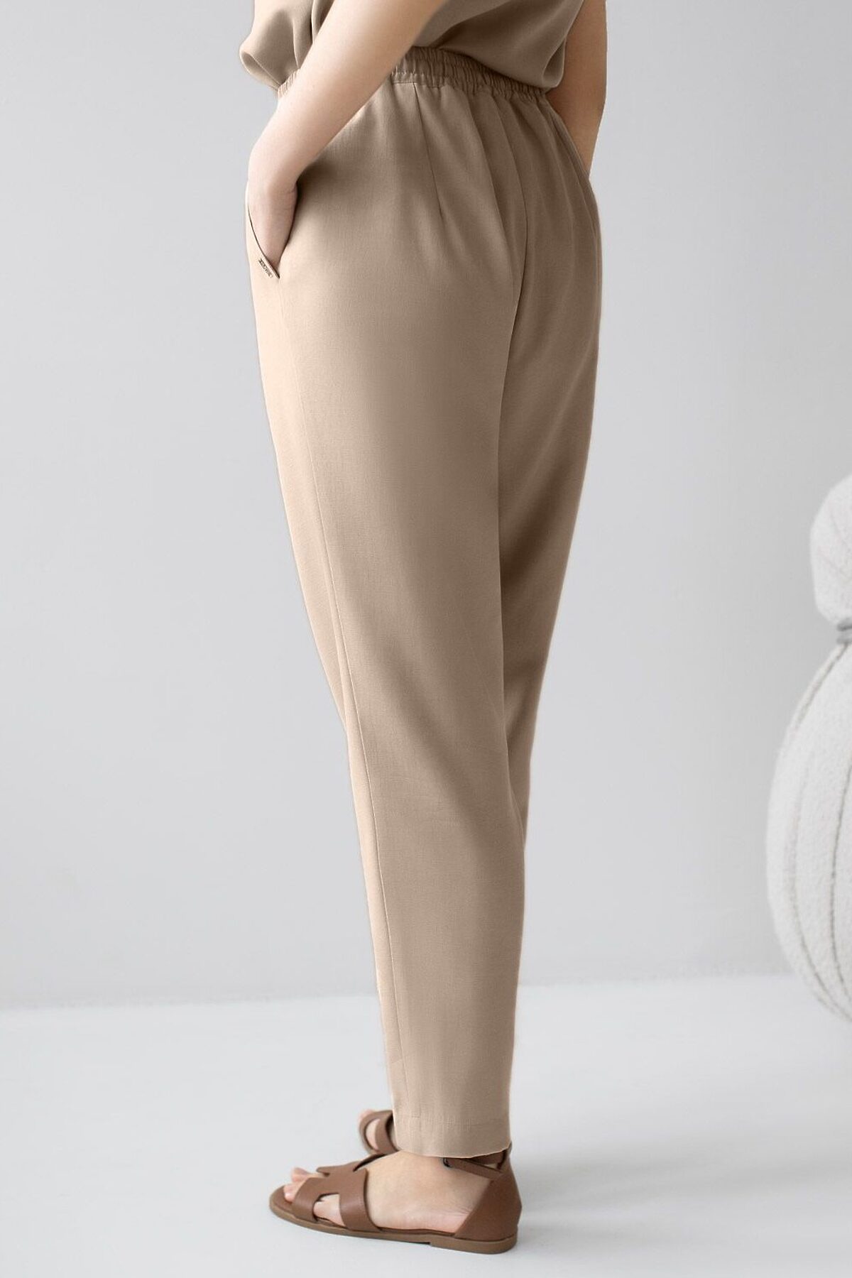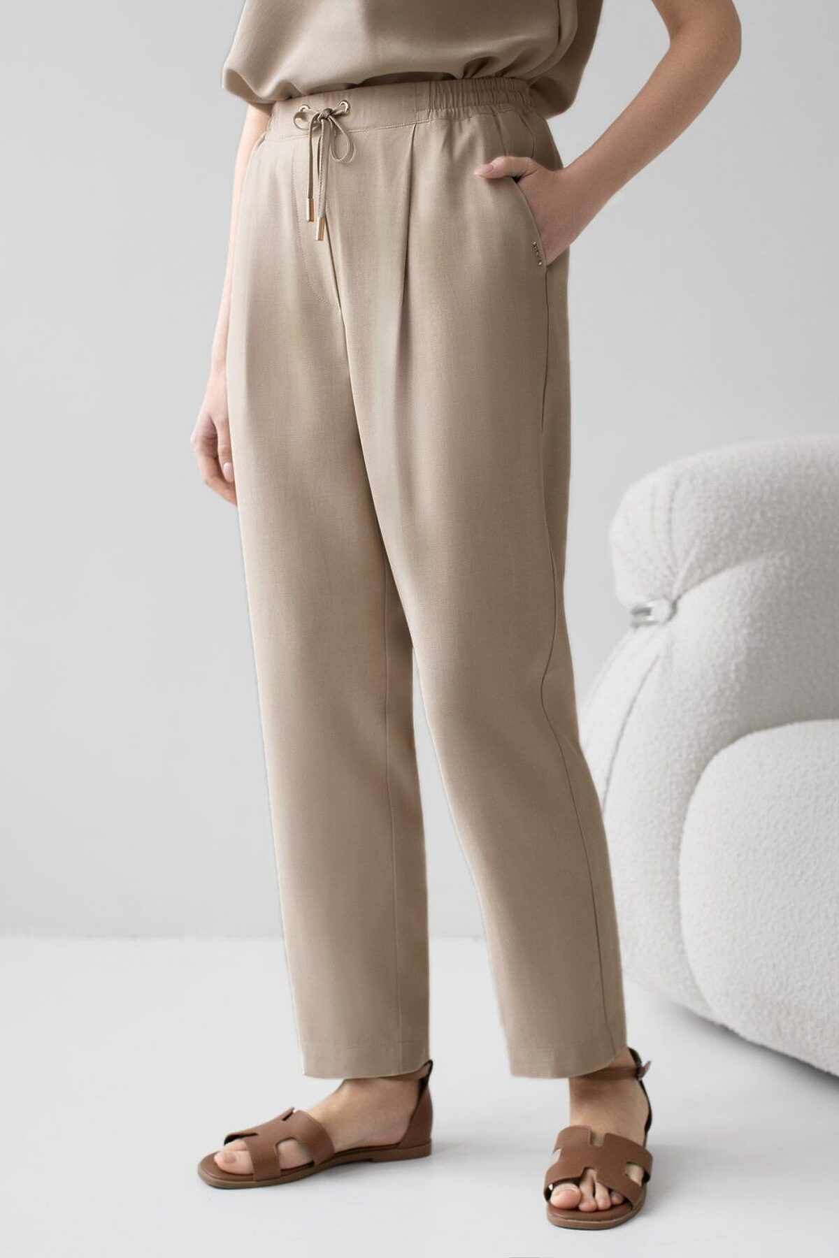 Брюки бананы светло-бежевого цвета выполнены из плотного лиоцелла. Лиоцелл это более дорогой и экологичный вариант вискозы, очень прочный и шелковистый. Модель отличается свободным кроем в бедрах и заужены к щиколотке. Удобный пояс на мягкой на резинке обеспечивает идеальную посадку по фигуре и гарантирует комфорт. Свободные брюки с высокой посадкой и аккуртными защипами создают идеальный силуэт и будут базовым элементом гардероба. Летние брюки отлично сочетаются с монохромным верхом, с ними можно создавать эффектные наряды как на выход, так и для ежедневных рабочих дел или простых прогулок. Рекомендуем сочетать с артикулами: D29.354, D29.359, D29.360