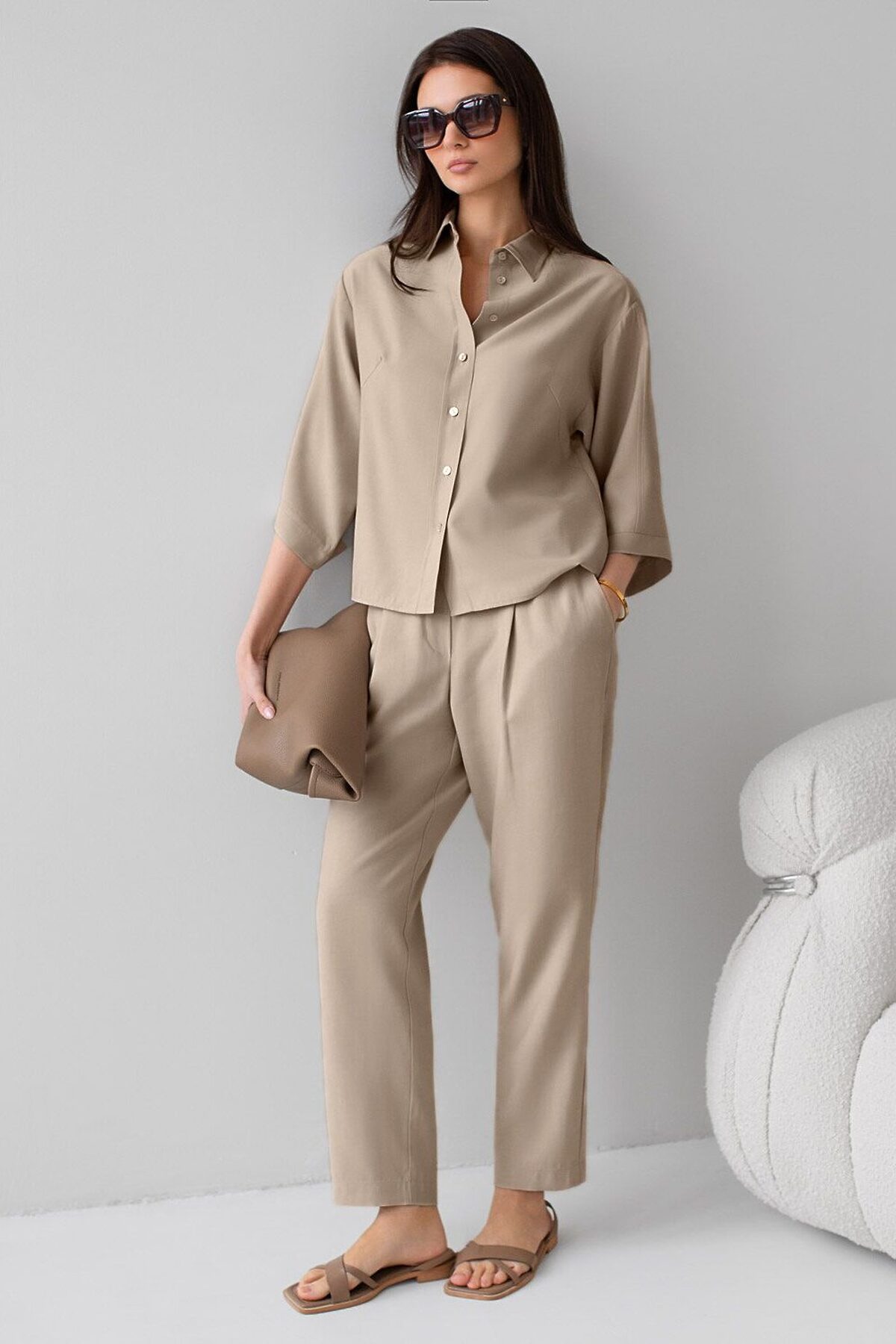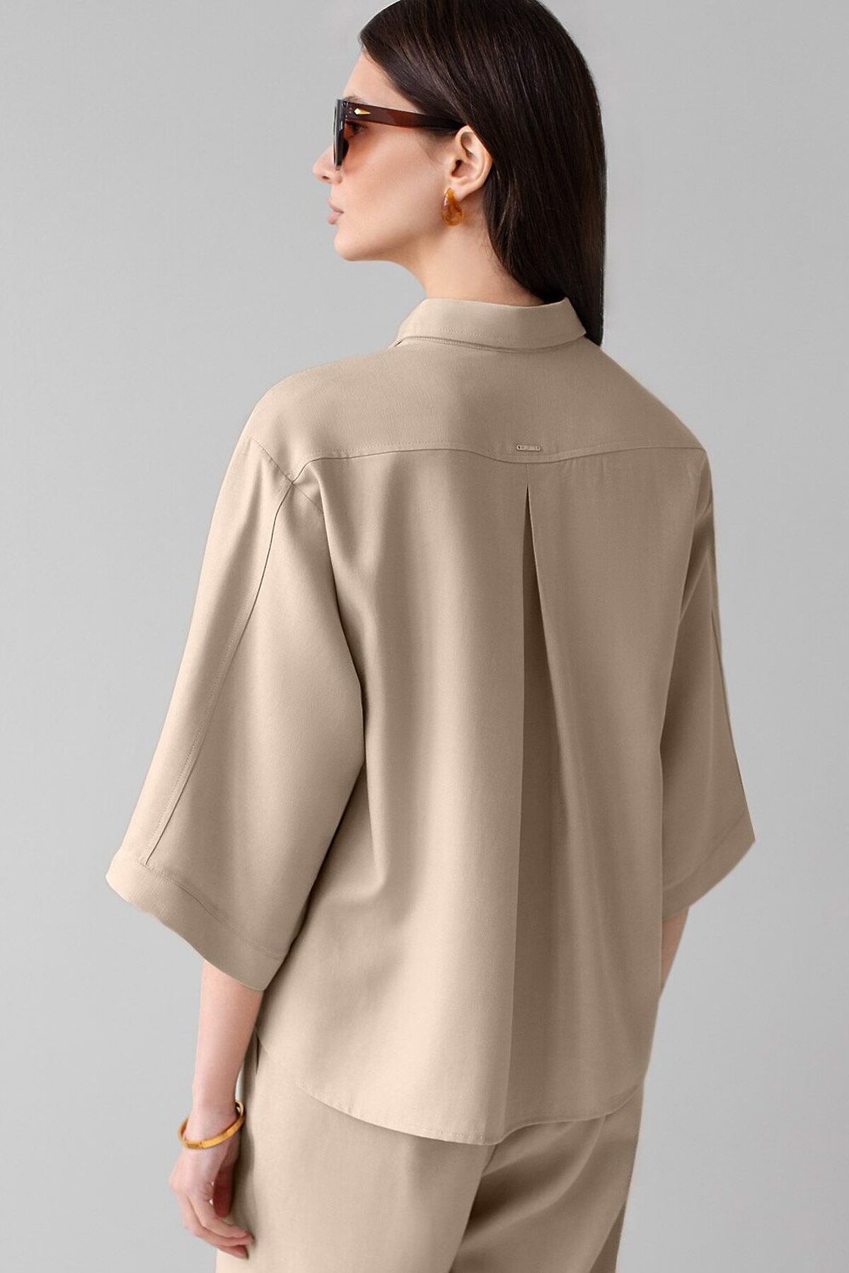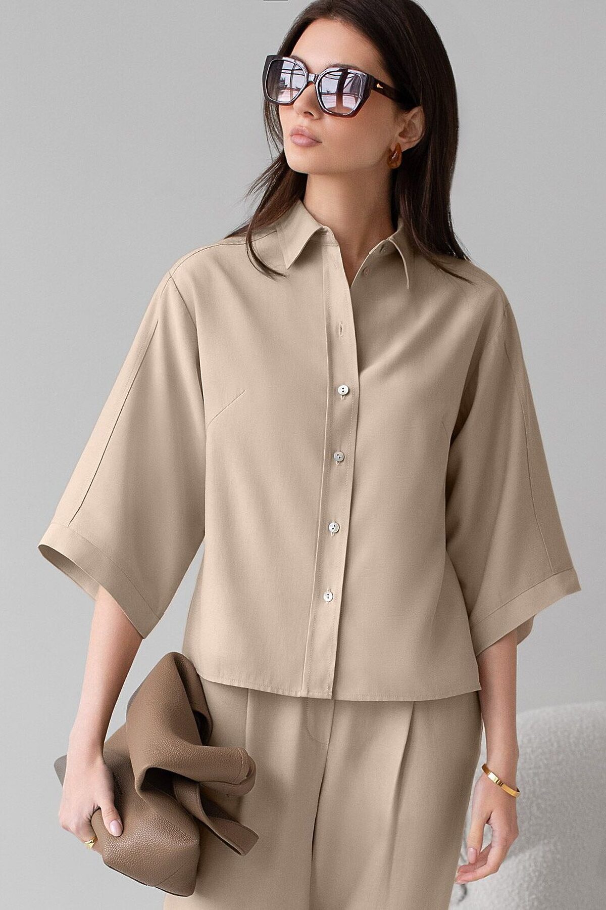 Стильная блузка светло-бежевого цвета выполнена из плотного лиоцелла. Лиоцелл это более дорогой и экологичный вариант вискозы, очень прочный и шелковистый. Модель дополнена широкими рукавами длиной 3/4, создающими модный акцент. Классический отложной воротник придает блузке официальность и идеально подходит для ношения, где требуется офисный дресс-код. А лаконичные лампасы вдоль рукавов в тон основного цвета подчеркивают трендовый характер блузки. Это ненавязчивый, но заметный акцент, который выделяет модель среди стандартных классических блузок. Свободный крой не сковывает движений и отлично садится по фигуре даже на большие размеры, скрывая возможные недостатки. Эта легкая рубашка с застежкой на пуговицы идеальный выбор для комфорта и стиля в теплое время года, она идеально подойдет для любого повода.. Реомендуем сочетать с артикулами: D24.310, D24.311, D26.203