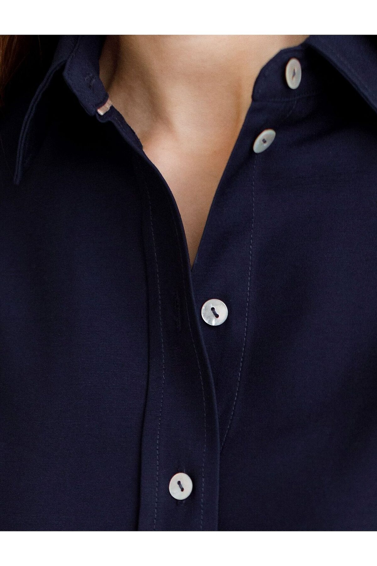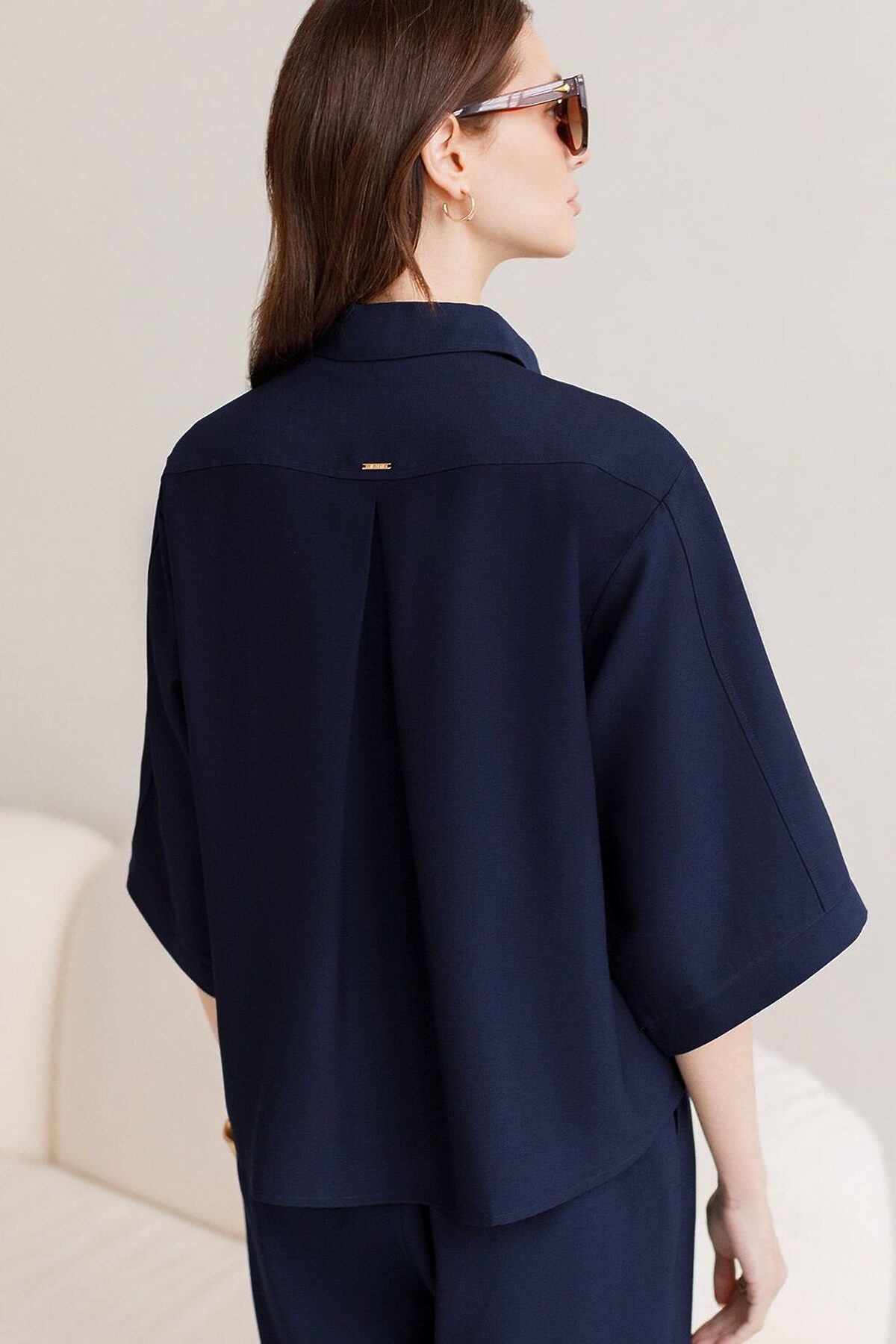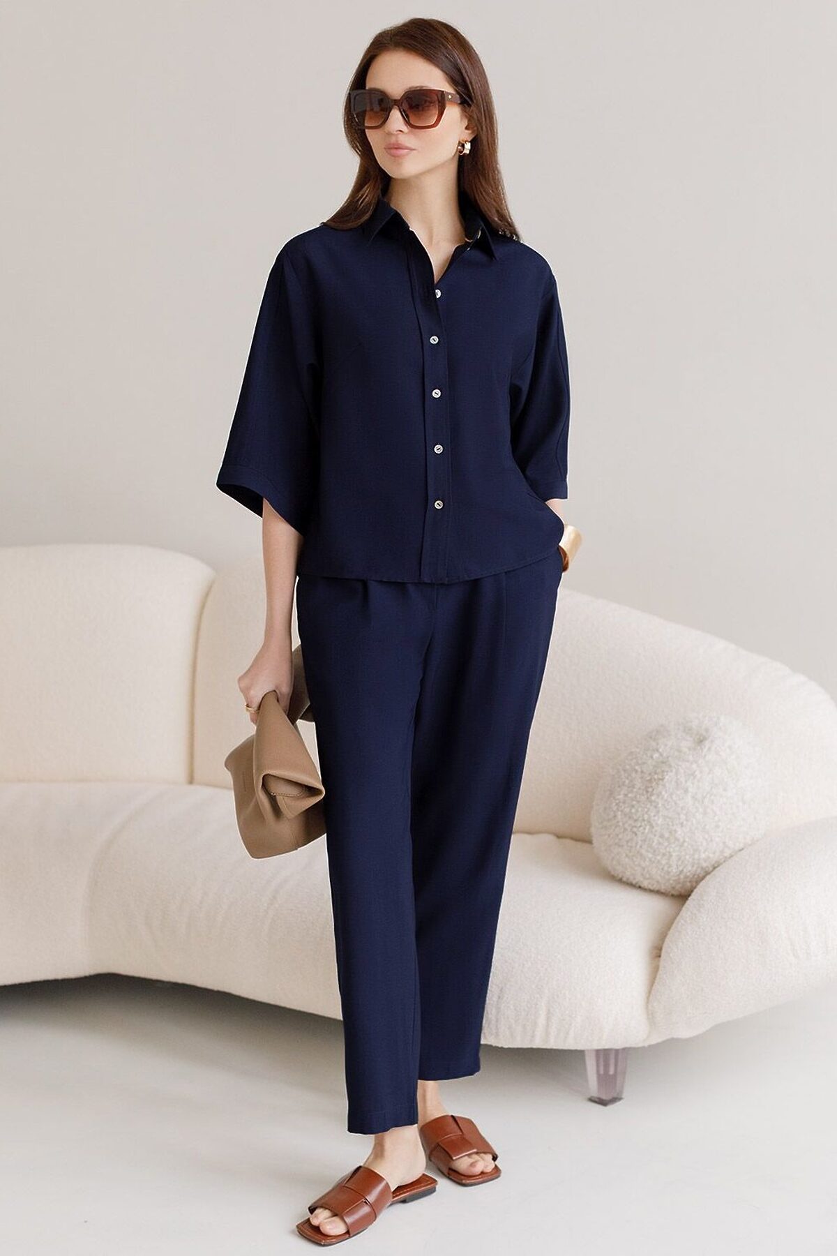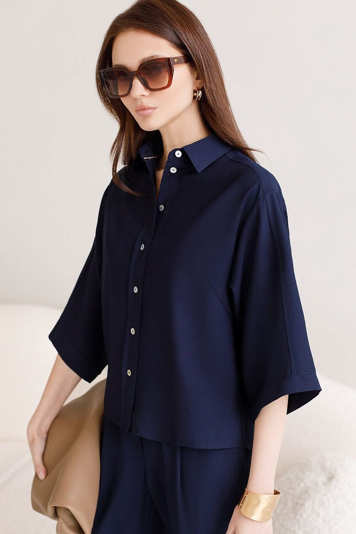 Стильная блузка темно-синего цвета выполнена из плотного лиоцелла. Лиоцелл это более дорогой и экологичный вариант вискозы, очень прочный и шелковистый. Модель дополнена широкими рукавами длиной 3/4, создающими модный акцент. Классический отложной воротник придает блузке официальность и идеально подходит для ношения, где требуется офисный дресс-код. А лаконичные лампасы вдоль рукавов в тон основного цвета подчеркивают трендовый характер блузки. Это ненавязчивый, но заметный акцент, который выделяет модель среди стандартных классических блузок. Свободный крой не сковывает движений и отлично садится по фигуре даже на большие размеры, скрывая возможные недостатки. Эта легкая рубашка с застежкой на пуговицы идеальный выбор для комфорта и стиля в теплое время года, она идеально подойдет для любого повода. Реомендуем сочетать с артикулами: D24.310, D24.311, D26.203