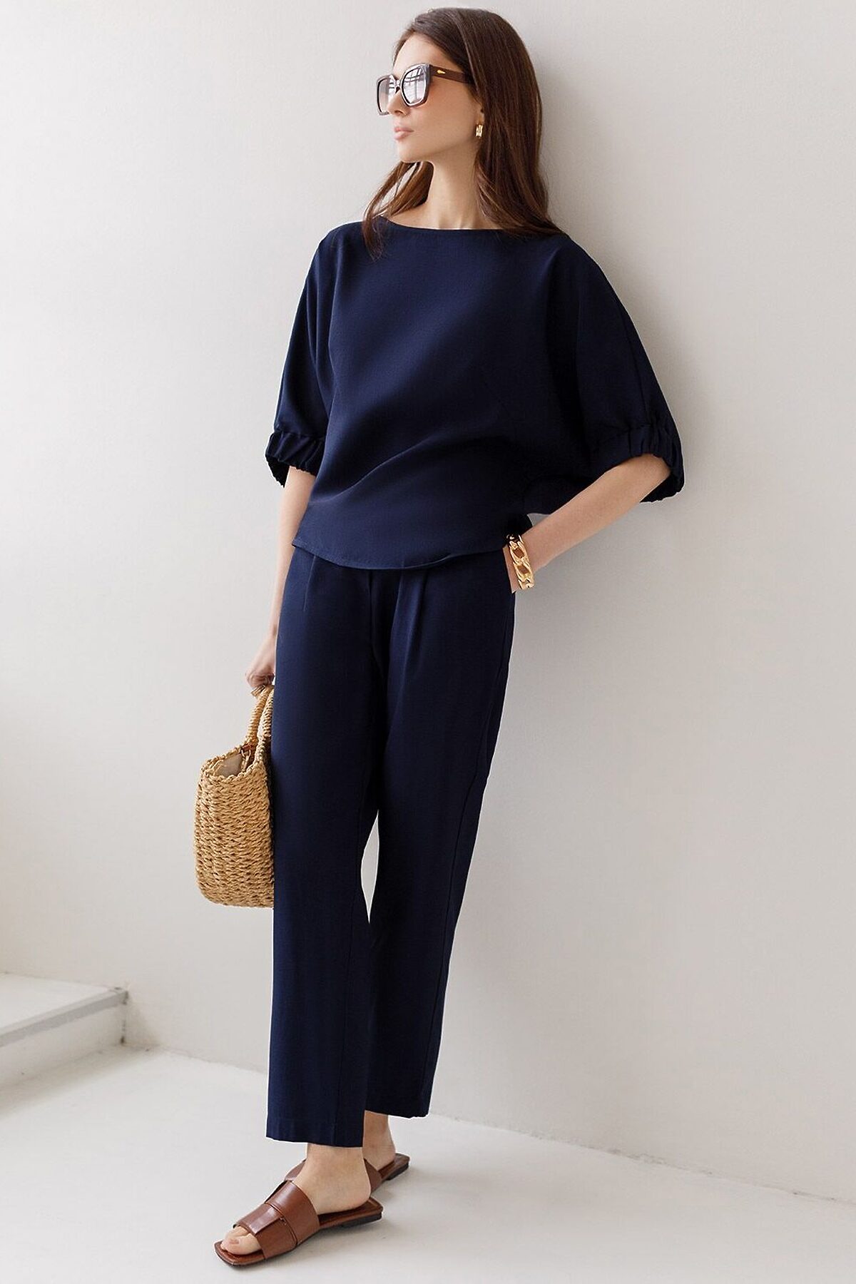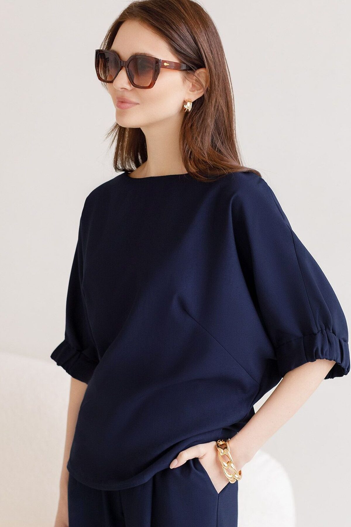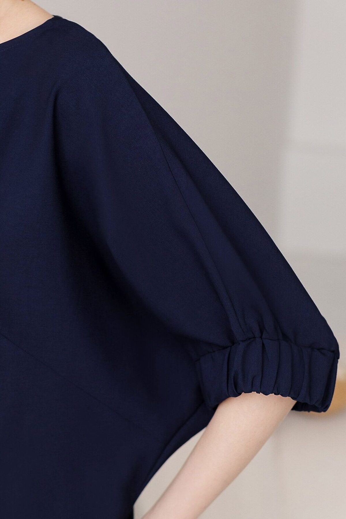 Свободная блузка темно-синего цвета выполнена из плотного лиоцелла. Лиоцелл это более дорогой и экологичный вариант вискозы, очень прочный и шелковистый. Современная интерпретация кроя «летучая мышь» дополнена акцентными эластичными манжетами. Эта блузка идеальна для любого типа фигуры, в том числе и на королевские размеры. Этот крой создан для того, чтобы мягко скрыть лишние объемы. Эта повседневная блузка с вырезом лодочка создана для легкого и утонченного стиля. Мягкие линии кроя создают невероятно эффектный образ, который подчеркивает естественную красоту, не стесняя движений, а свободный фасон дарит ощущение абсолютного комфорта и уверенности. Блузка красиво драпируется при движении, создавая летящий, воздушный эффект. Реомендуем сочетать с артикулами: D24.310, D24.311, D26.203