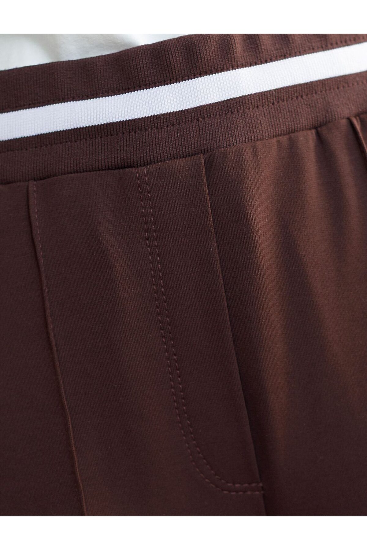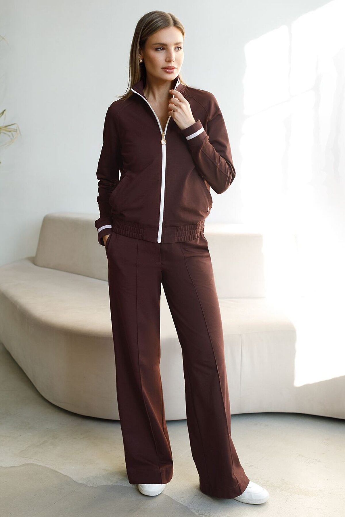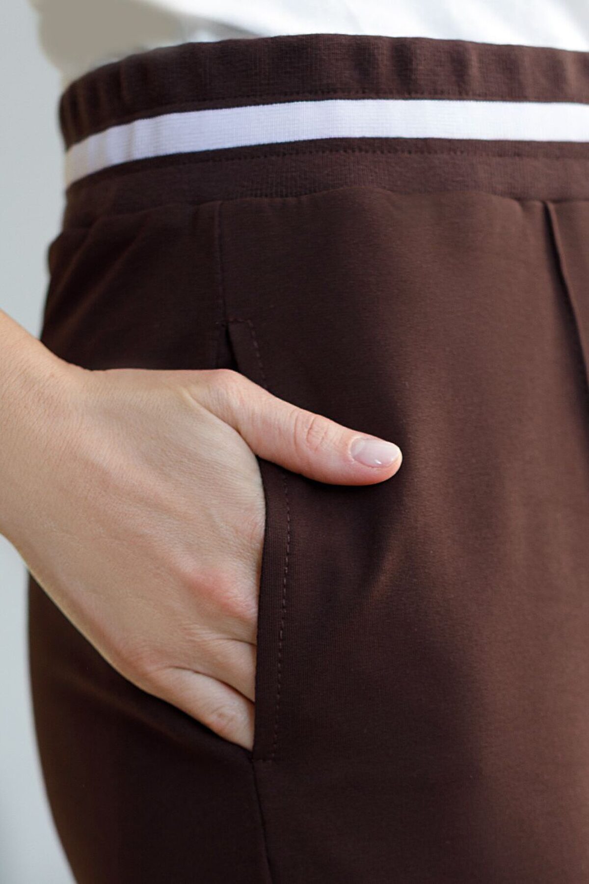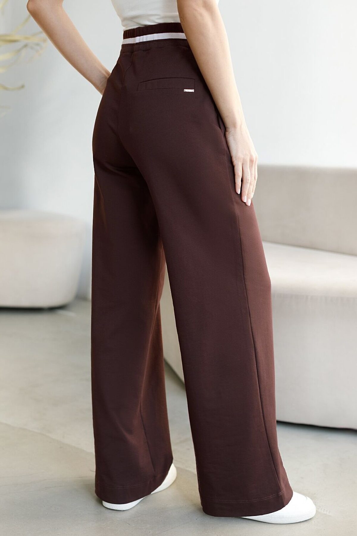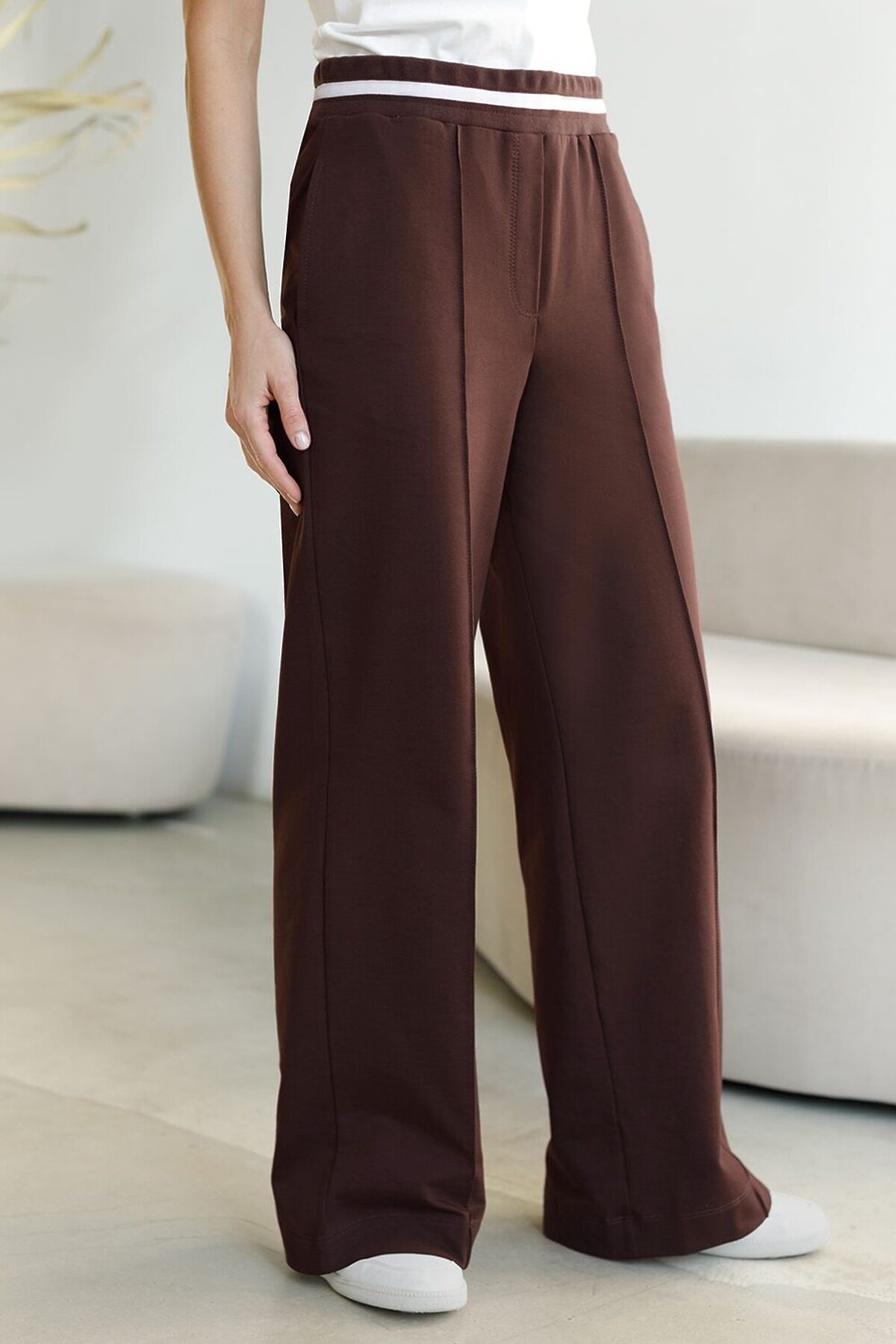 Брюки коричневого цвета с удобным эластичным поясом на резинке и карманами по бокам выполнены из премиального футера-двухнитки плотностью 240 Г/м2. Наличие эластана в составе гарантирует комфорт и долговечность изделия, материал хорошо пропускает воздух, позволяя телу дышать. Свободный прямой крой обеспечивает свободу движений и максимальное удобство в любых ситуациях, поэтому они подойдут и на большие размеры, а так же на высокий или низкий рост. Фигура подчеркивается, а силуэт визуально вытягивается за счет кроя палаццо и застроченных декоративных стрелок. В повседневных трикотажных брюках вы будете чувствовать себя комфортно и уверенно, наслаждаясь каждым моментом дня. Спортивные брюки подходят для демисезонного использования, в летний период, для занятий спортом в помещении и на улице, а также как часть стиля casual. Рекомендуем сочетать с артикулами: D49.083, D49.166, D49.171, D49.169