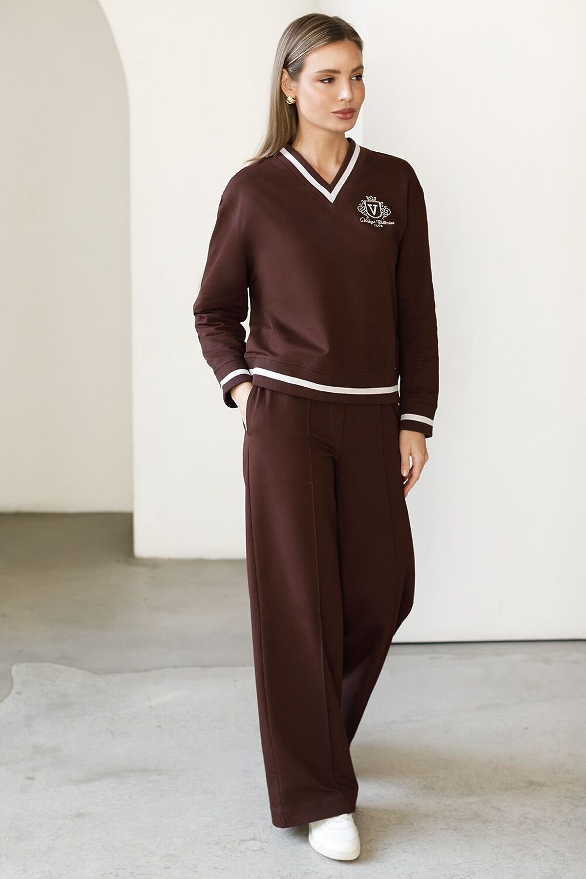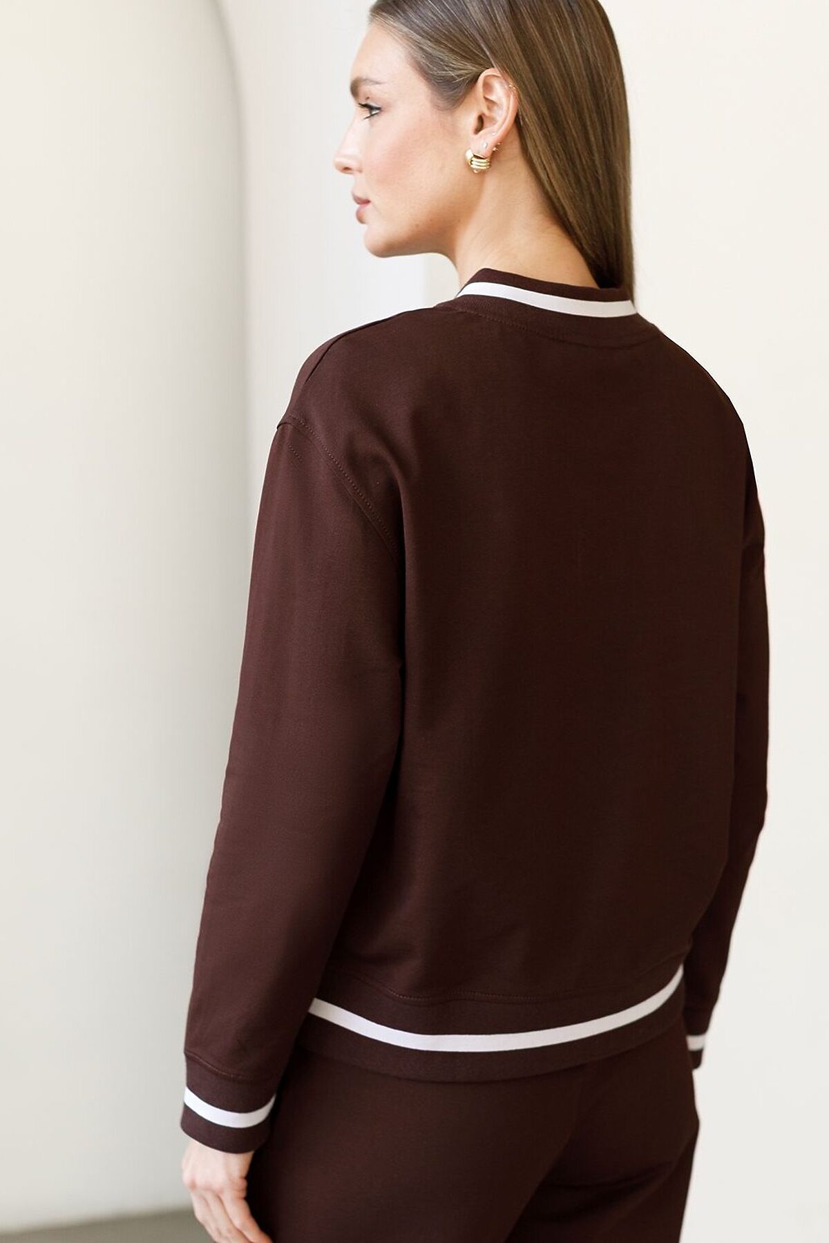 Свитшот коричневого цвета среднего объема с V вырезом выполнен из футера двухнитки с эластаном плотностью 240 Г/м2. Натуральный хлопок обеспечивает мягкость и оптимальный теплообмен весной и летом. Нежный материал дарит ощущение уюта, а премиальное качество изготовления гарантирует долговечность и сохранение формы после множества стирок. Особенность свитшота - контрастные полосы на горловине, манжетах и поясе, которые добавляют современный акцент и делают образ более выразительным. Аккуратная вышивка в виде логотипа бренда, расположенная на груди, придает свитшоту индивидуальности без лишней вычурности. Представлена широкая размерная линейка, включая маленькие и большие размеры, что позволяет подобрать идеальный вариант для разной фигуры .Этот уютный свитшот отлично подходит для повседневной носки благодаря своей комфортной посадке и нежной текстуре. Свободный джемпер из футера станет идеальным выбором для активного отдыха, обеспечивая стильный внешний вид и удобство. Рекомендуем сочетать с артикулами: D44.168, D46.059, D49.171