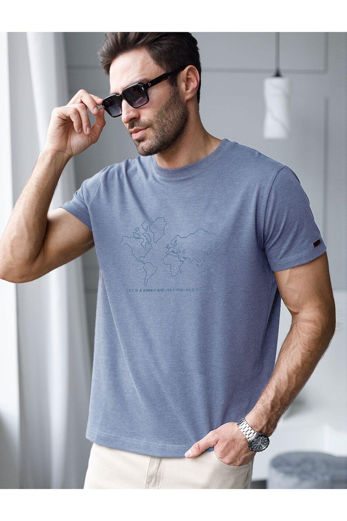 Футболка голубого цвета с эффектом меланж из премиального хлопка с эластаном плотностью 170 Г/м2 станет универсальным решением для любого случая. Эффект неоднородного цвета ткани (меланж) достигается путем смешивания волокон разных оттенков. Прямой крой обеспечивает комфортную посадку на любую фигуру, включая большие размеры, подходит как на низкий, так и на высокий рост. Благодаря сочетанию натурального хлопка и эластана, ткань отлично дышит и слегка тянется, сохраняя форму после стирок. Футболка выполнена в минималистичном стиле, дополнена принтом в виде изображения карты мира и надписи. Перевод надписи: Life is a jorney and only you hold the map - Жизнь — это путешествие, и только у тебя есть карта. На рукаве нашивка из эко-кожи с логотипом VILATTE. Подходит как классический вариант для работы в офис, так и для повседневной носки или занятий спортом. Мягкая ткань приятна к телу, не вызывает дискомфорта и идеально подходит для дома или летних прогулок. Простая и практичная футболка с коротким рукавом станет базовым элементом вашего гардероба. Она легко сочетается в спортивном или классическом стиле.