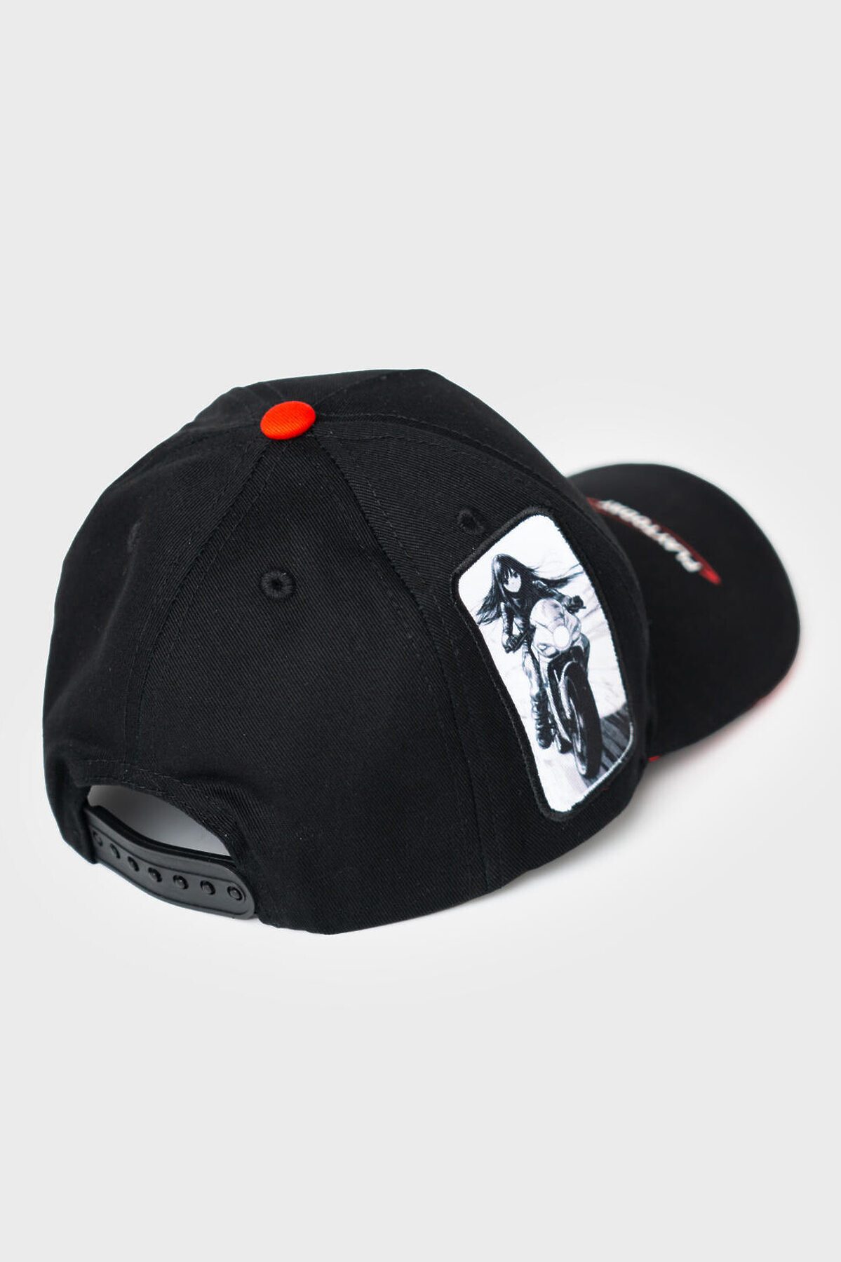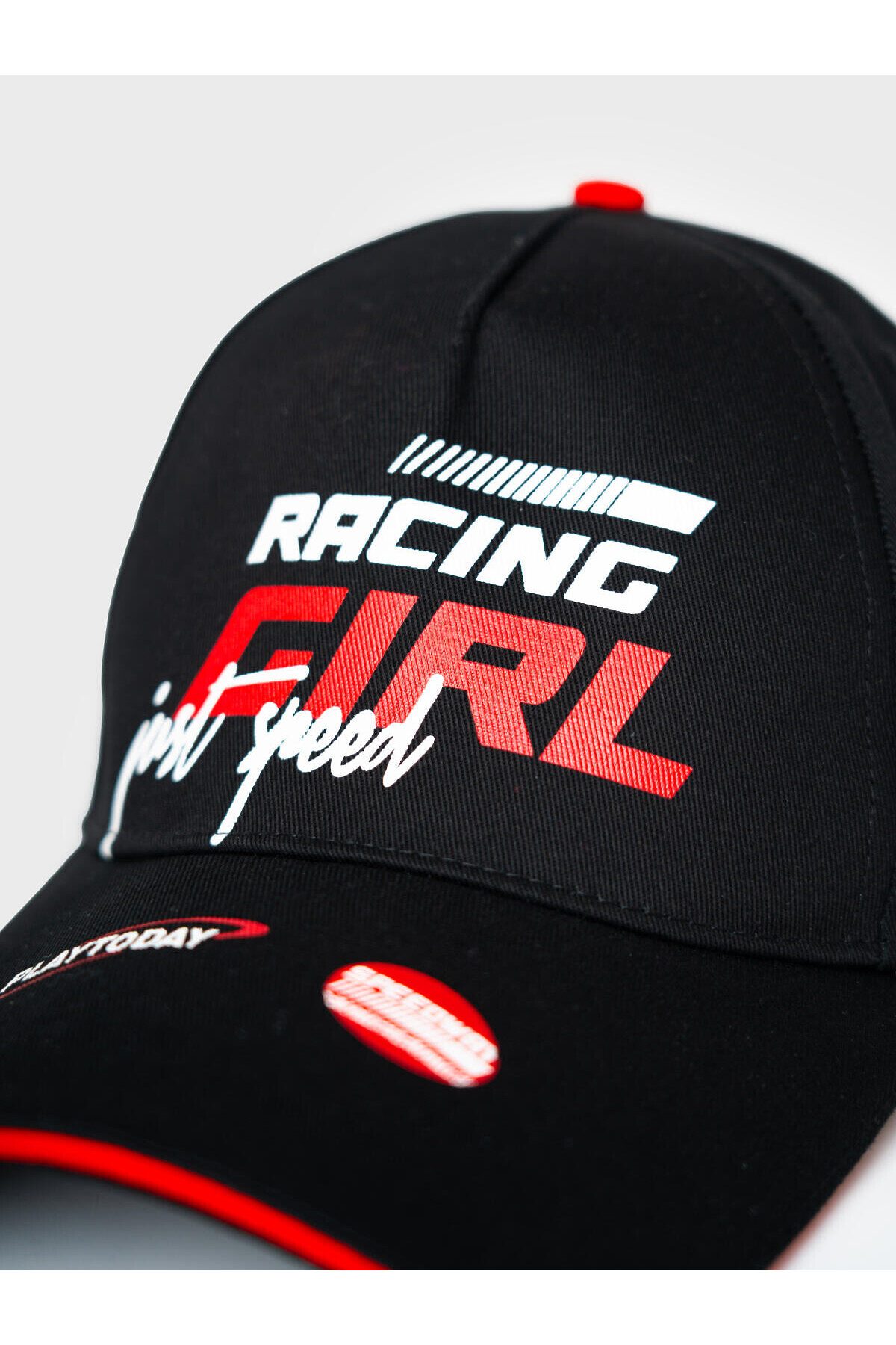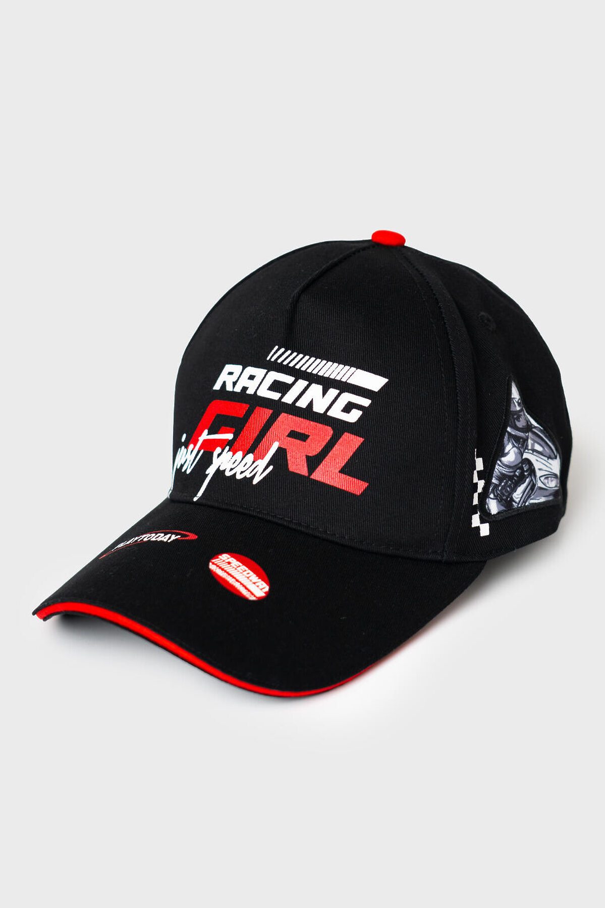 Бейсболка для девочки подростка в спортивном стиле. Спереди расположен стильный принт, а по бокам — две нашивки с изображением мотоциклистки. Козырек изогнутый. Размер можно регулировать с помощью пластиковой застежки на кнопки сзади. Люверсы для вентиляции.