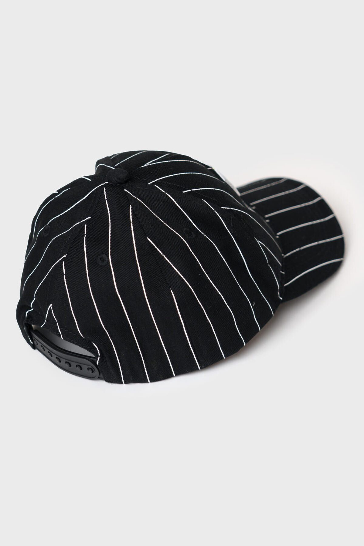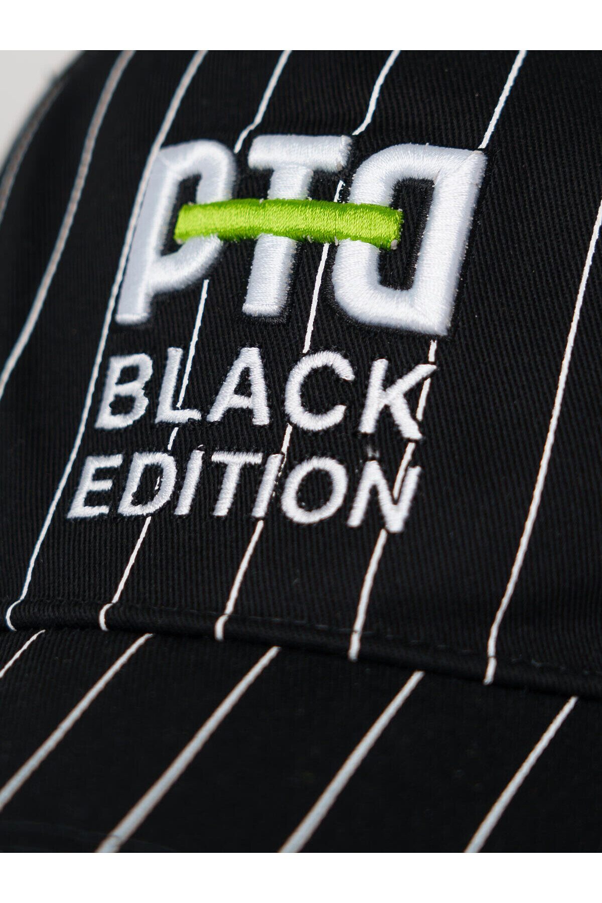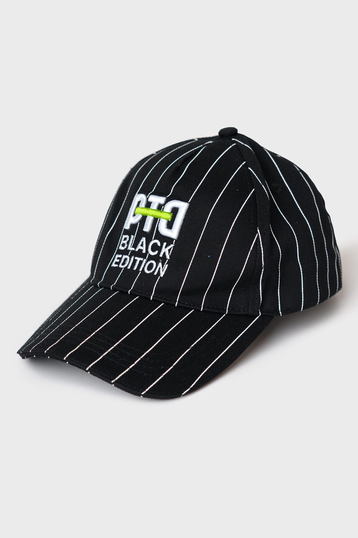 Бейсболка для мальчика подростка. Модель выполнена из чёрного хлопкового текстиля с контрастными белыми полосами. На передней панели — объёмная вышивка с логотипом PTD. Козырёк изогнутый. Сзади — пластиковая застёжка на кнопках с регулировкой размера. Вентиляционные отверстия.