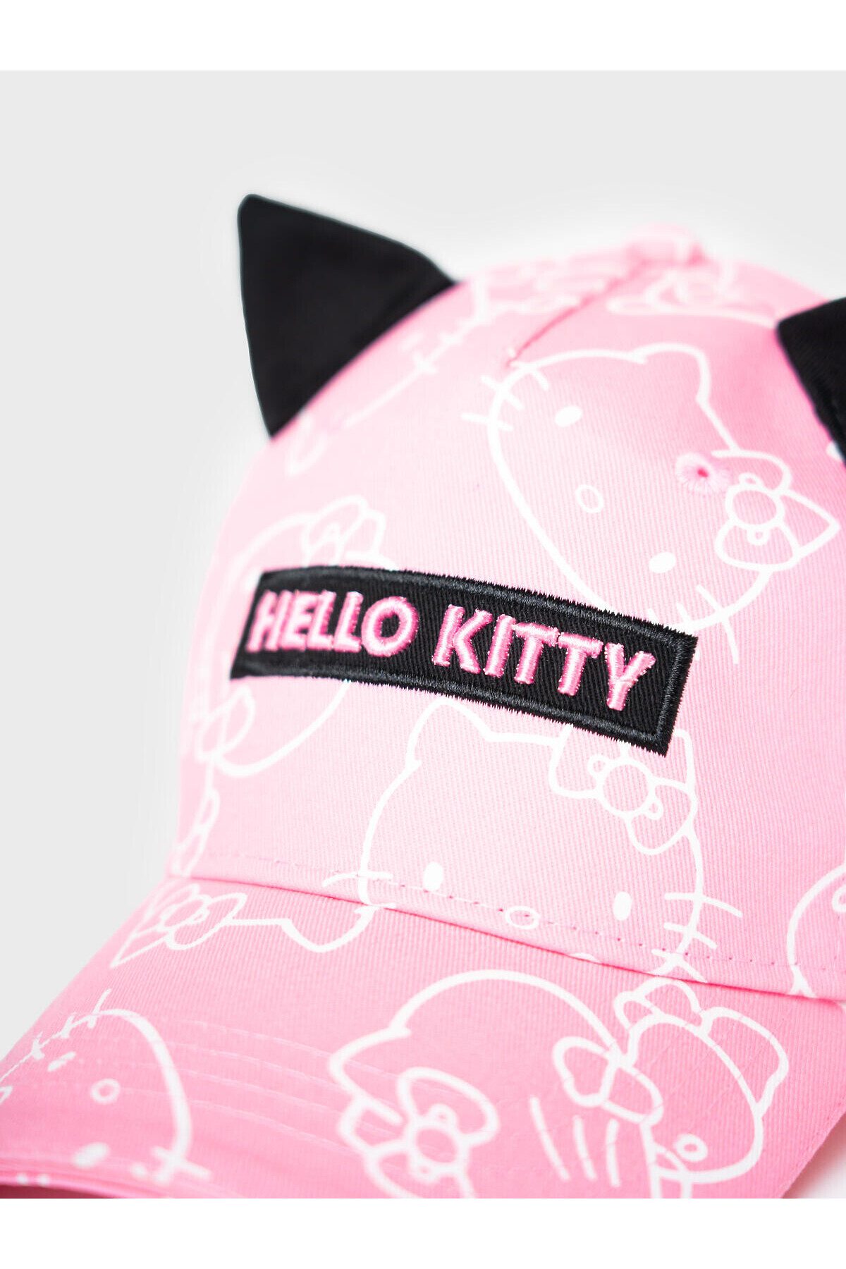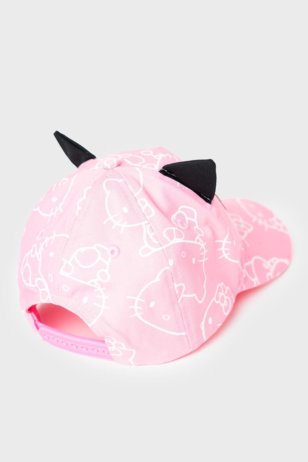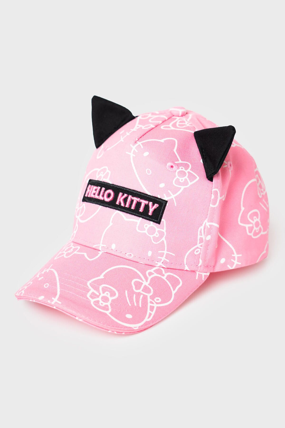 Детская бейсболка для девочки. Модель с ушками и принтом Hello Kitty. Выполнена из розовой ткани с белыми рисунками персонажа и украшена чёрной нашивкой с розовой надписью. Изюминка дизайна - текстильные ушки на верхней части. Козырёк изогнутый. Объём регулируется с помощью пластиковой застежки на кнопки сзади. Вентиляционные люверсы и плотная конструкция делают кепку удобной и практичной.