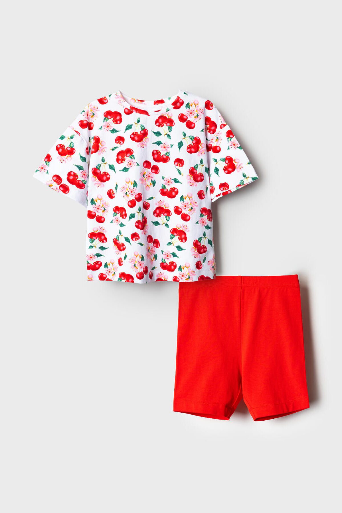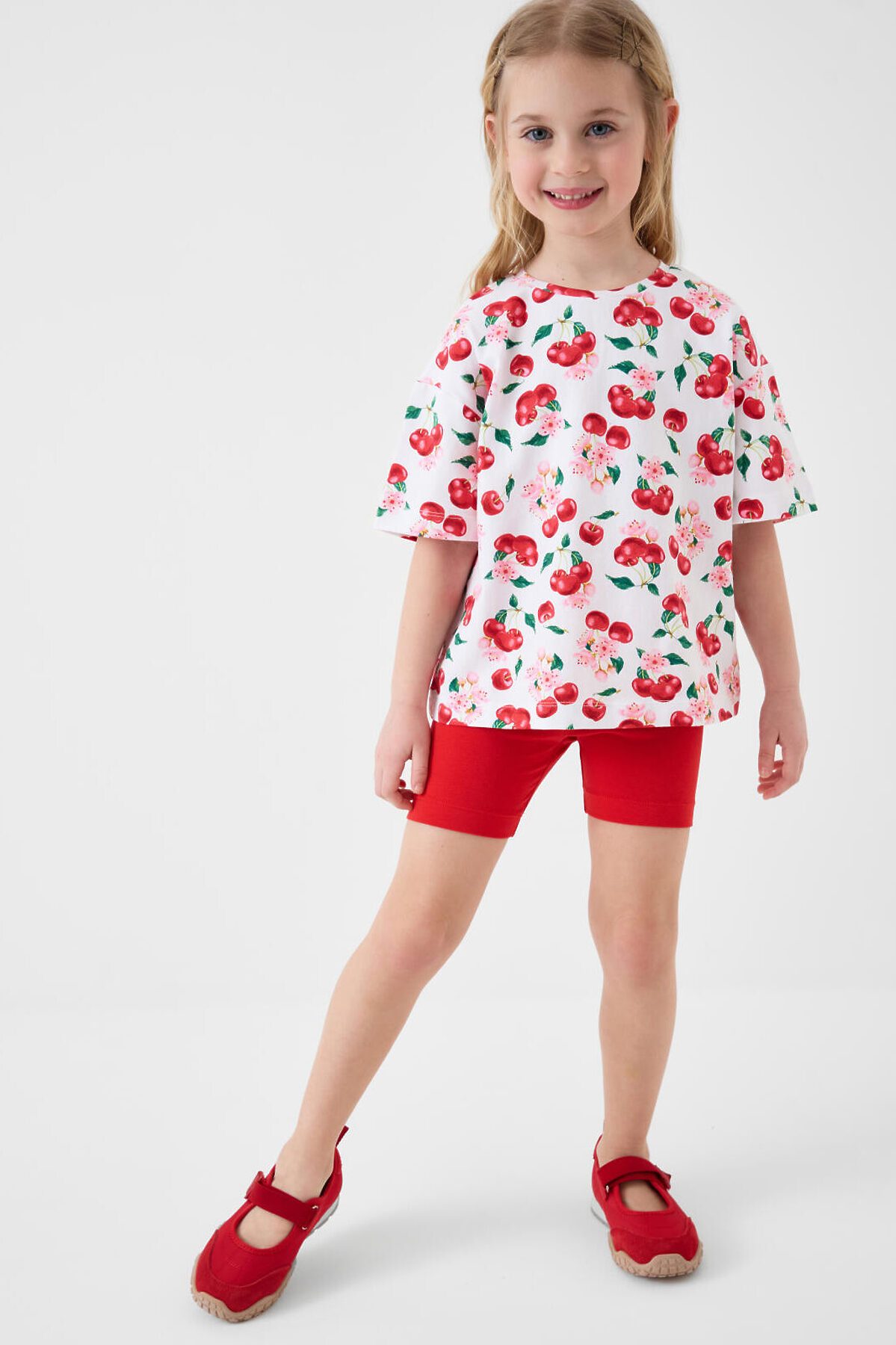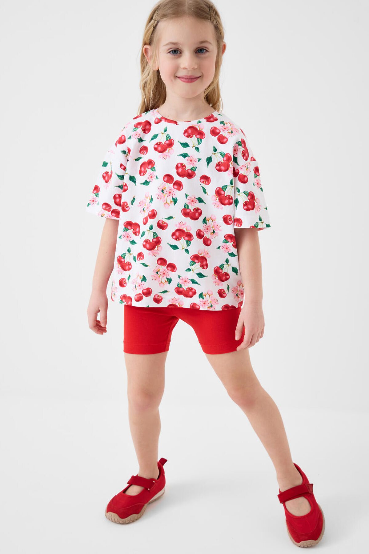 Детский яркий комплект для девочки. Состоит из оверсайз футболки с коротким рукавом и укороченных легинсов. Футболка из хлопкового трикотажа джерси, с ярким принтом с вишнями и цветами. Легинсы выполнены из однотонного красного трикотажа, хорошо тянутся и комфортно сидят по фигуре. Пояс с резинкой обеспечивает удобную посадку.