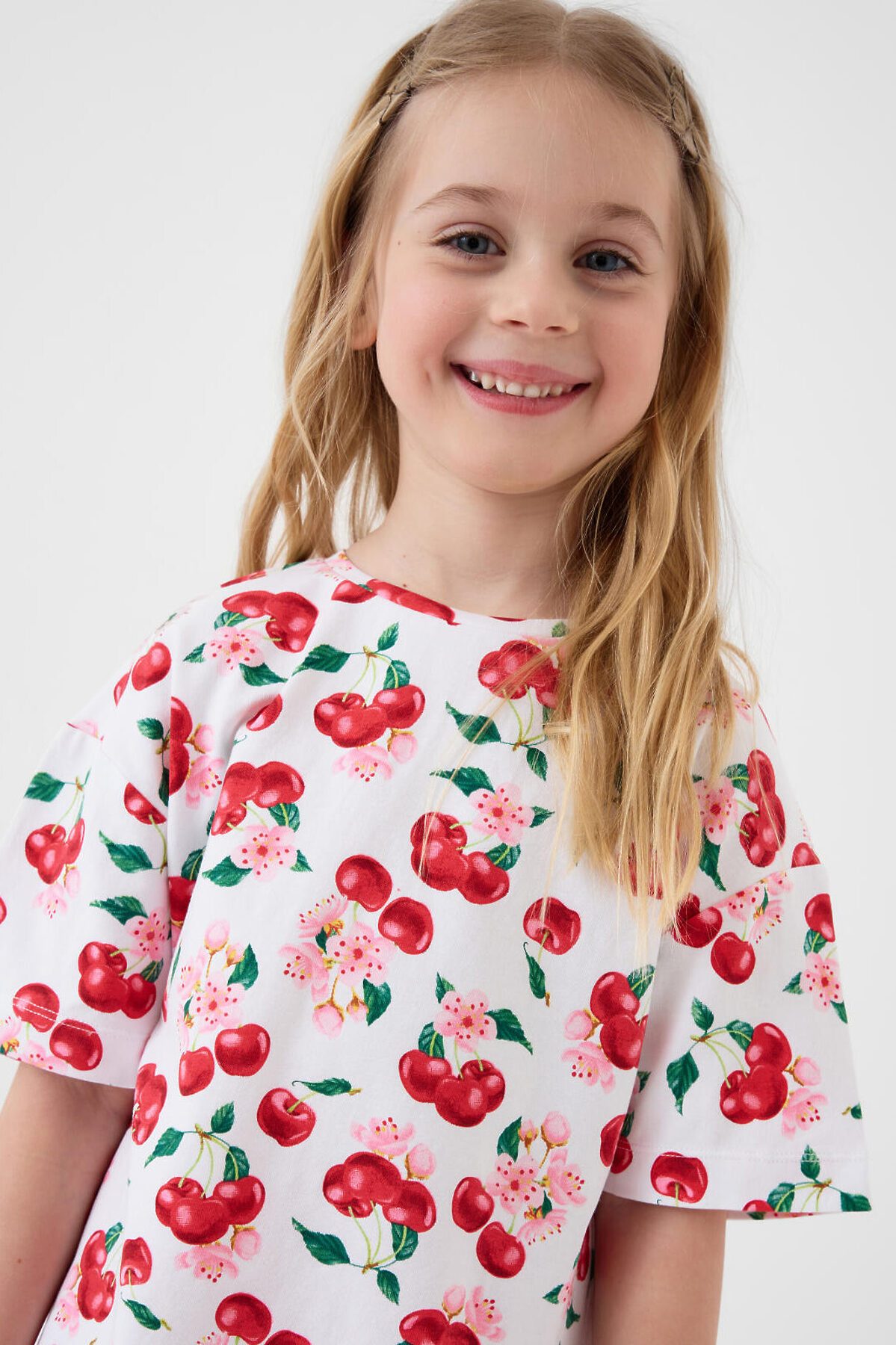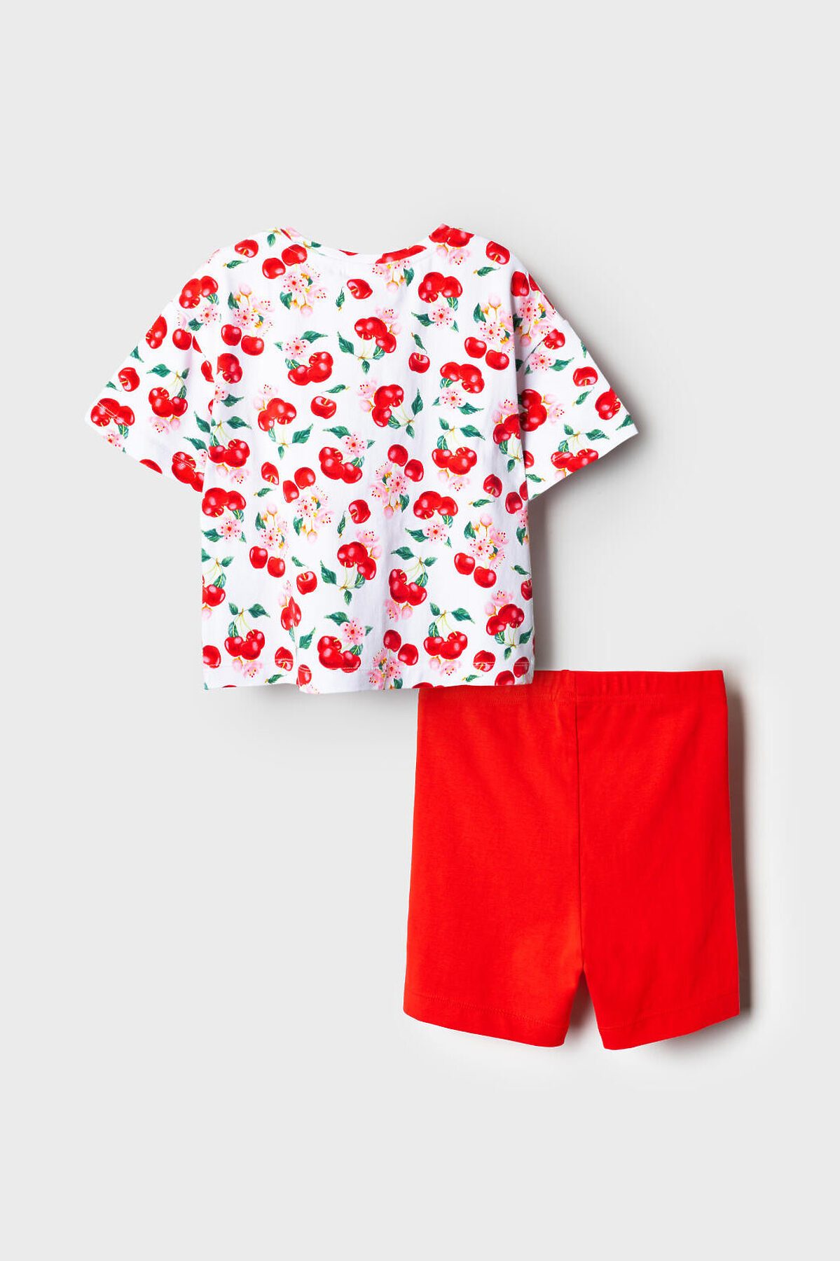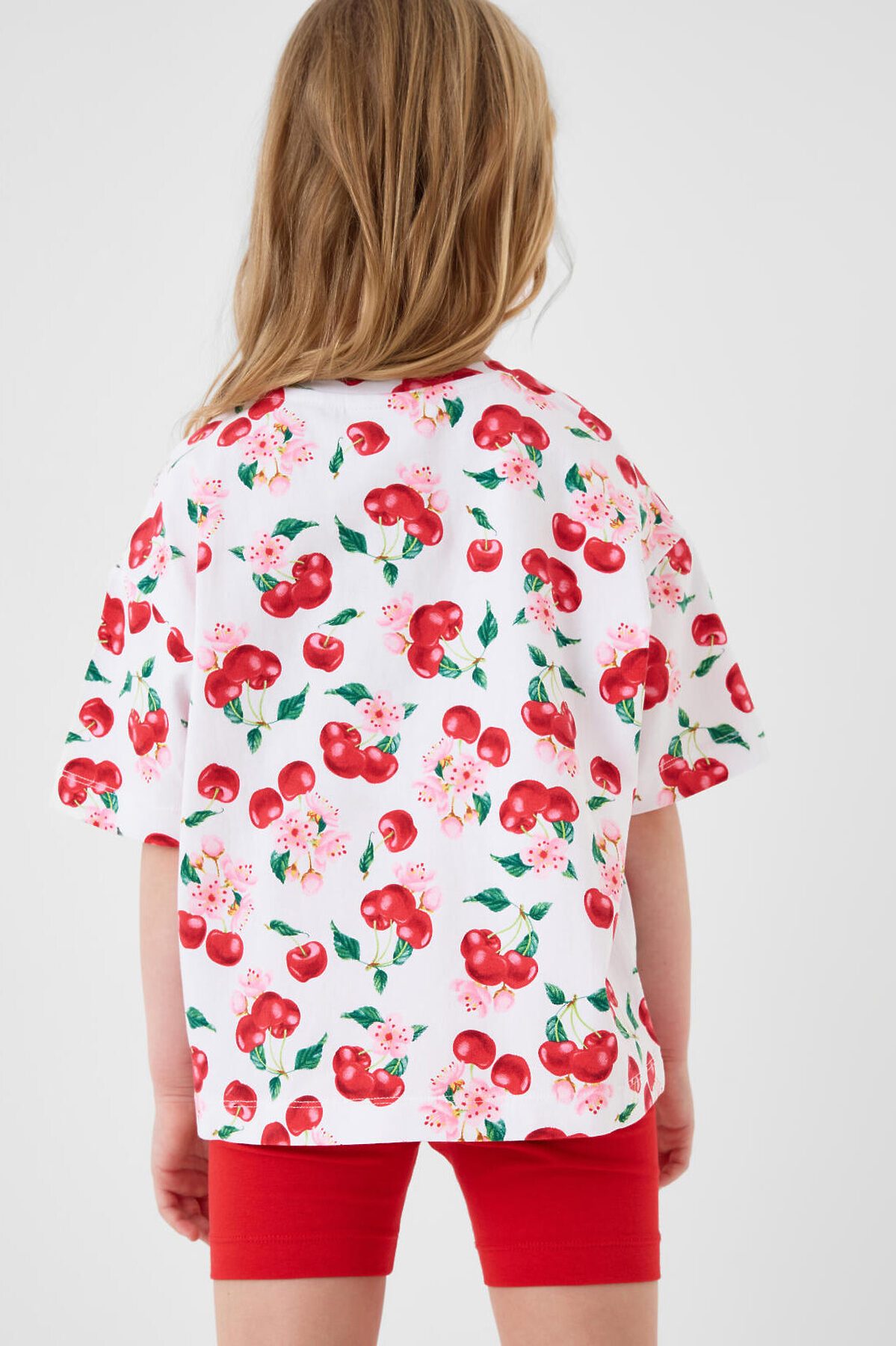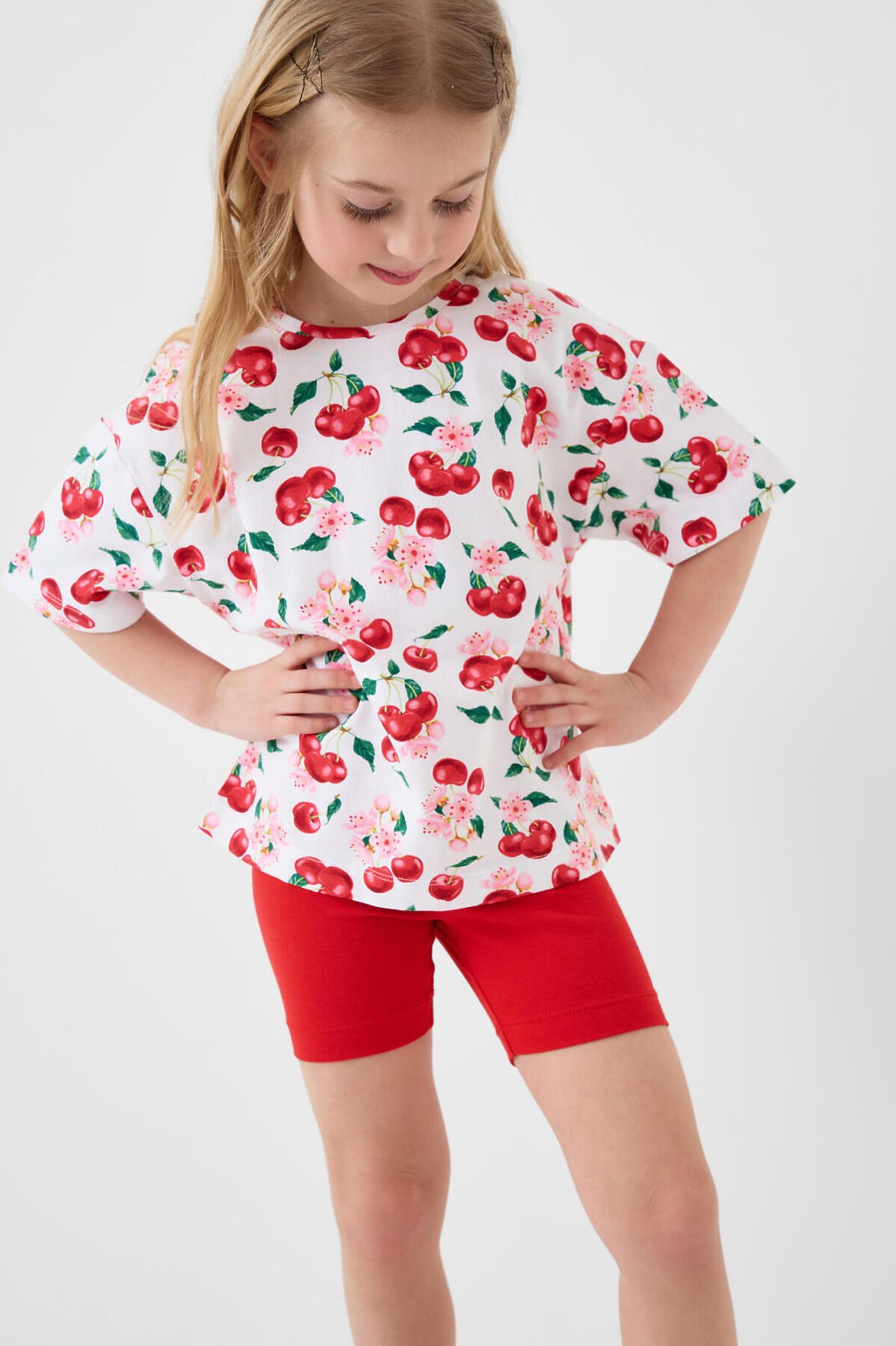Детский яркий комплект для девочки. Состоит из оверсайз футболки с коротким рукавом и укороченных легинсов. Футболка из хлопкового трикотажа джерси, с ярким принтом с вишнями и цветами. Легинсы выполнены из однотонного красного трикотажа, хорошо тянутся и комфортно сидят по фигуре. Пояс с резинкой обеспечивает удобную посадку.