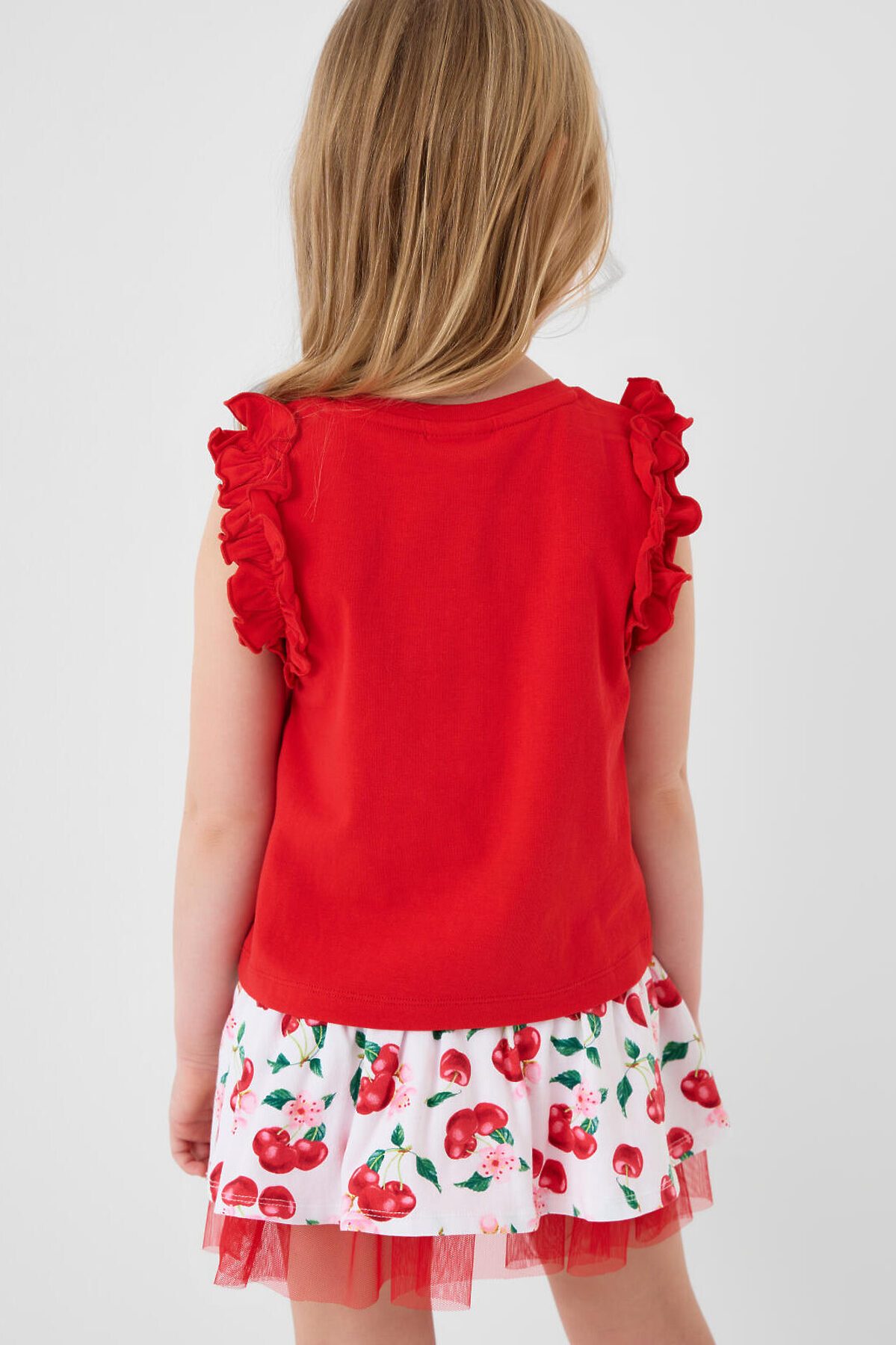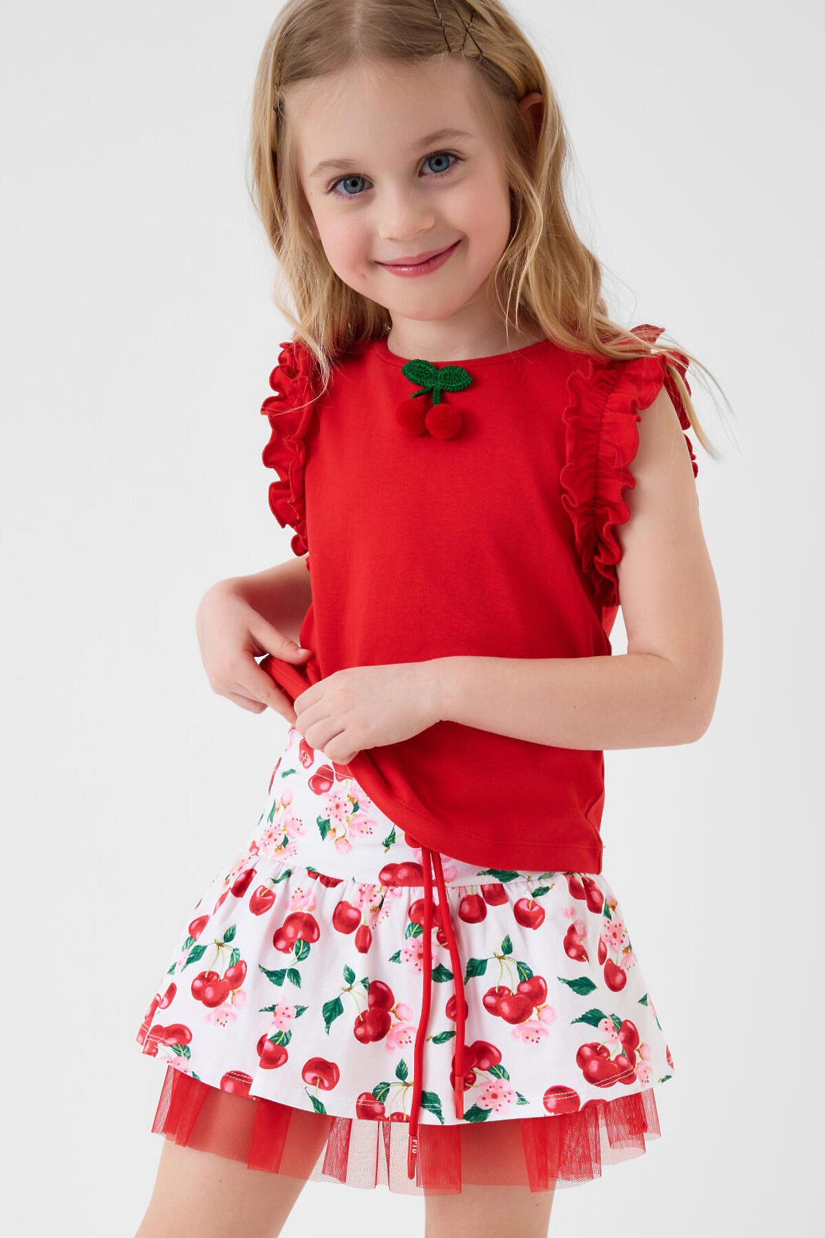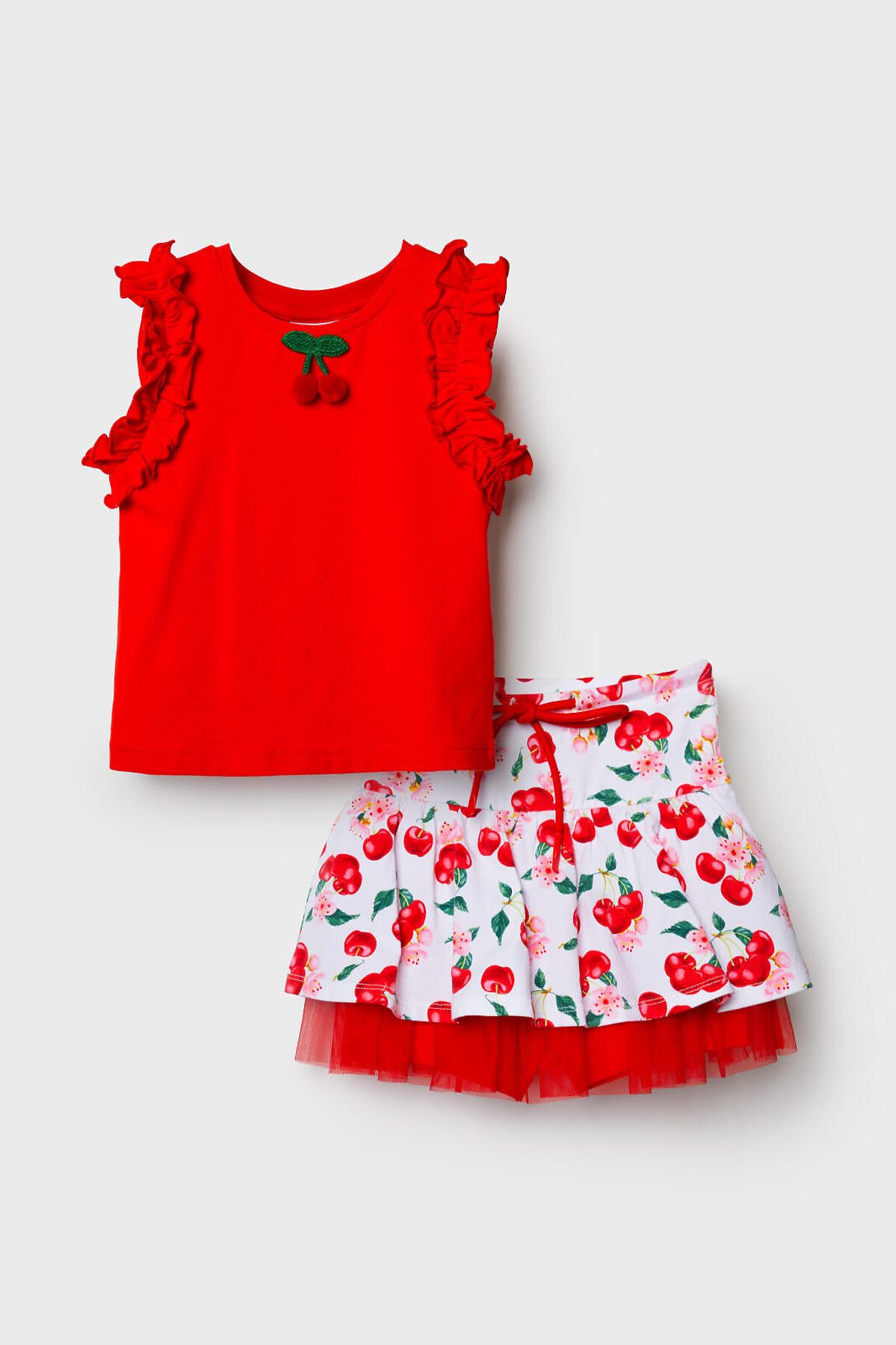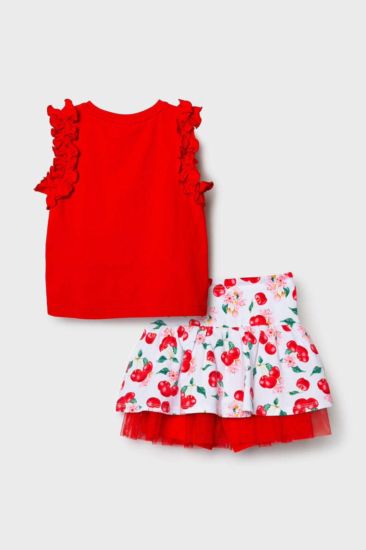 Детский трикотажный комплект для девочки. Состоит из футболки и юбки-шорт. Футболка прямого силуэта. На рукавах расположены декоративные рюши, а на передней части размещён объёмный декор в виде вишен. Юбка-шорты имеют удобную посадку на талии за счёт эластичного пояса и шнурка. Верхняя часть украшена ярким принтом с вишнями и цветами, а внутри расположены трикотажные шорты. Дополнительный объём и декоративный эффект создаёт сетчатый подъюбник.