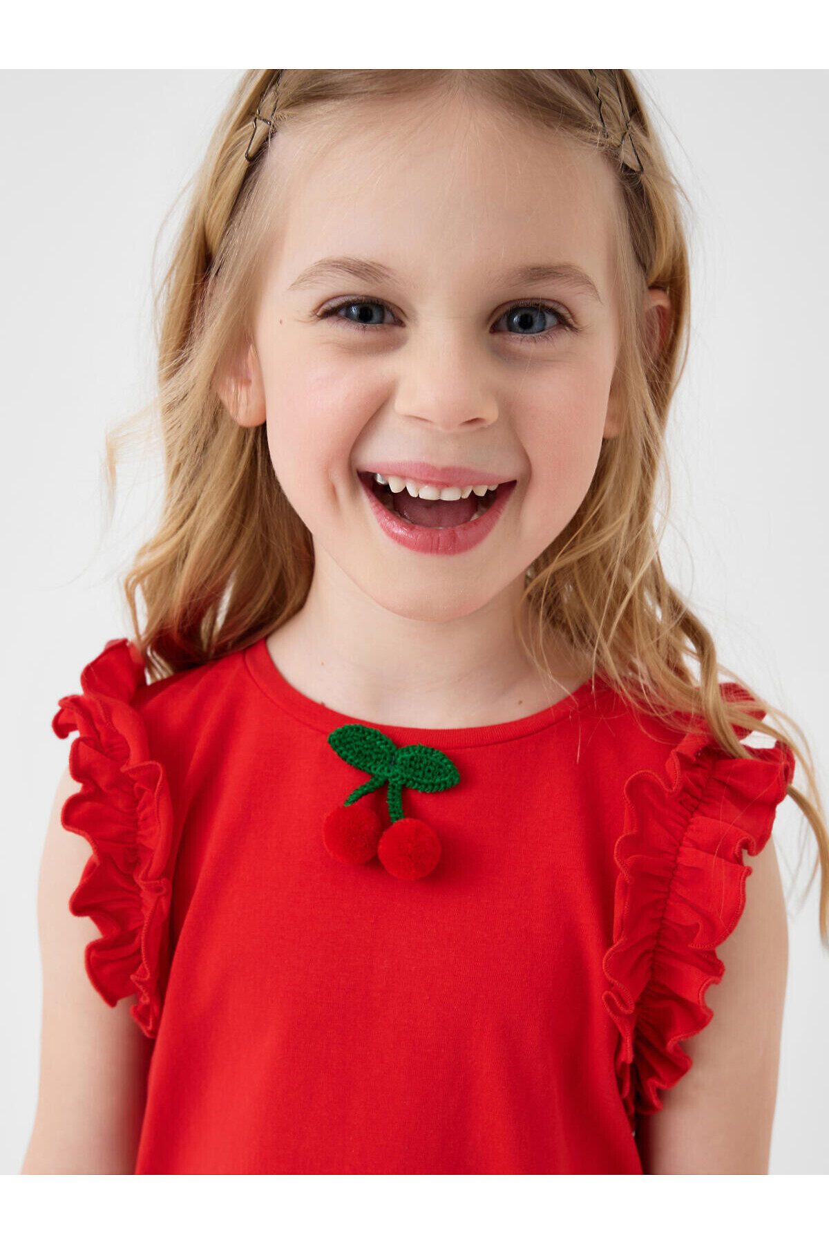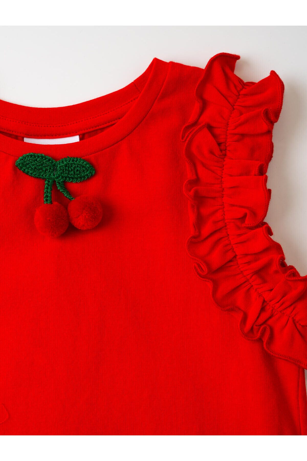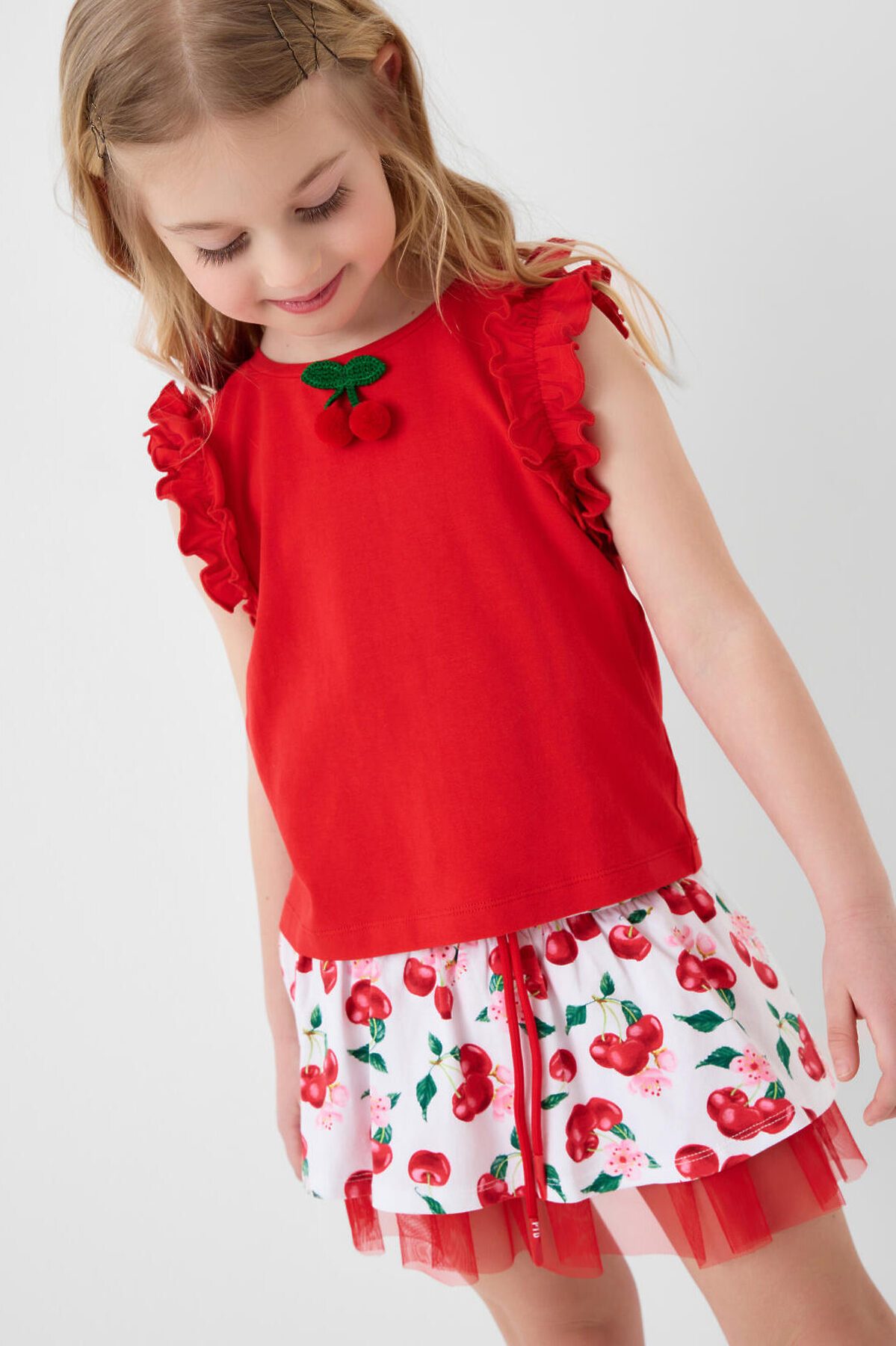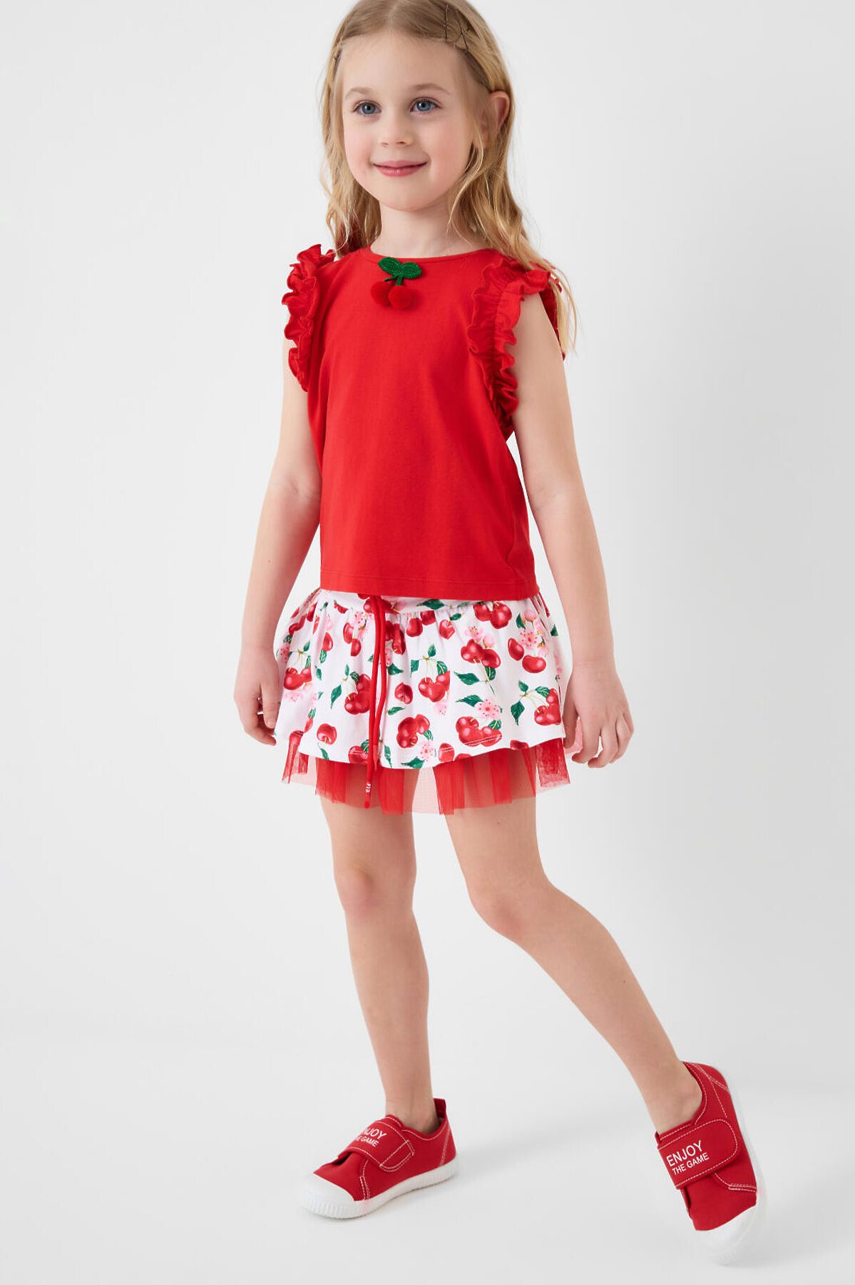 Детский трикотажный комплект для девочки. Состоит из футболки и юбки-шорт. Футболка прямого силуэта. На рукавах расположены декоративные рюши, а на передней части размещён объёмный декор в виде вишен. Юбка-шорты имеют удобную посадку на талии за счёт эластичного пояса и шнурка. Верхняя часть украшена ярким принтом с вишнями и цветами, а внутри расположены трикотажные шорты. Дополнительный объём и декоративный эффект создаёт сетчатый подъюбник.