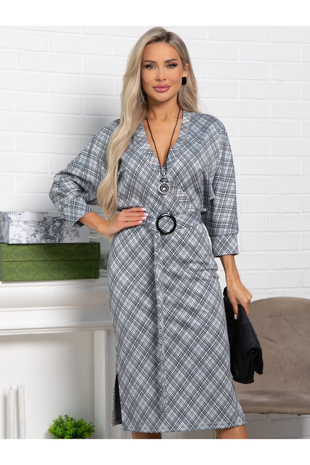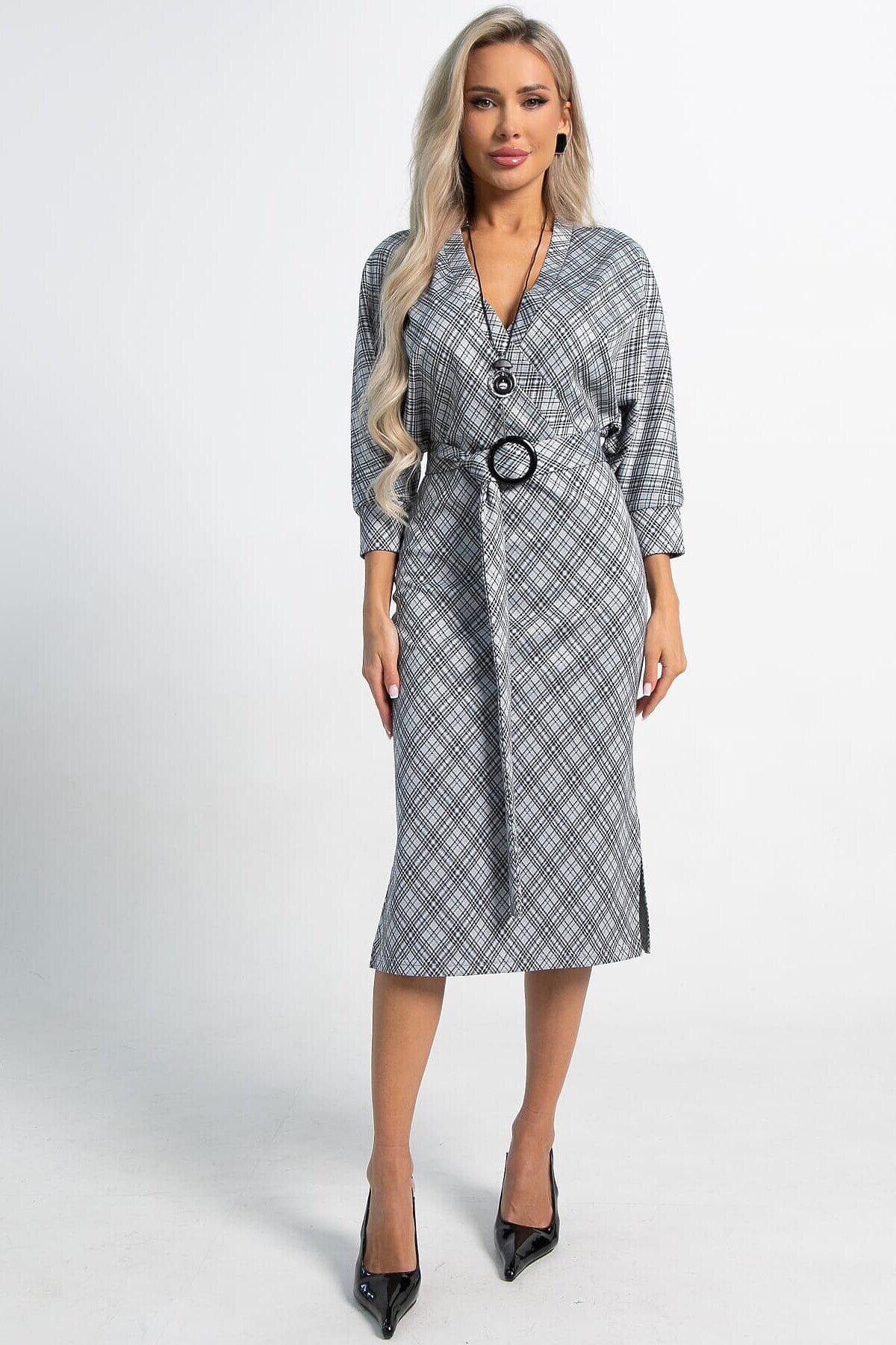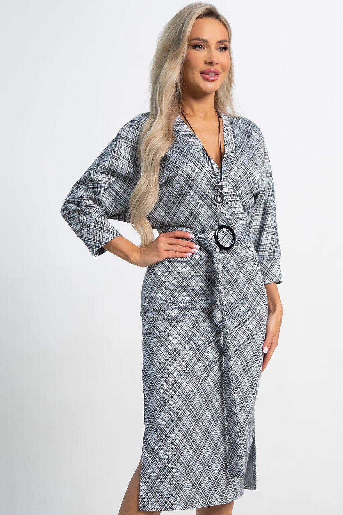 Невероятно женственное платье из трикотажа — вариант, который прекрасно подойдёт для создания очаровательного образа. Верх платья на запах, с декоративными пуговицами до талии, подчеркивает зону декольте. Трикотажное платье прекрасно подойдёт в качестве повседневного варианта и будет хорошо сочетаться как с туфлями, так и с кедами. Юбка у платья облегающая, с разрезами по бокам. Рукав цельнокроеный по типу «летучая мышь», по низу манжет. В комплект входит пояс из основной ткани на пряжке и украшение.