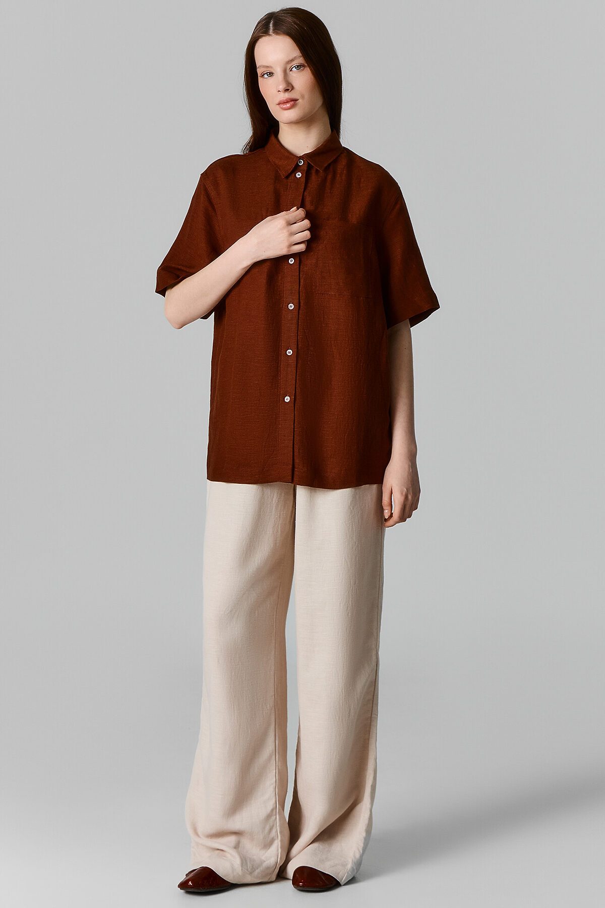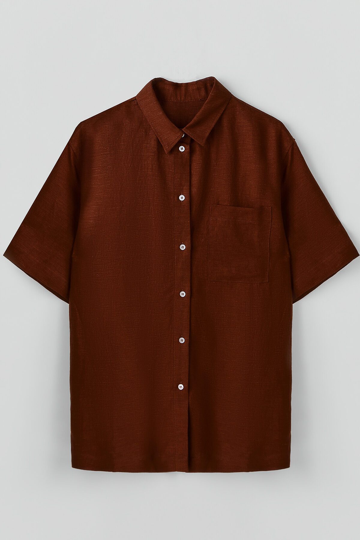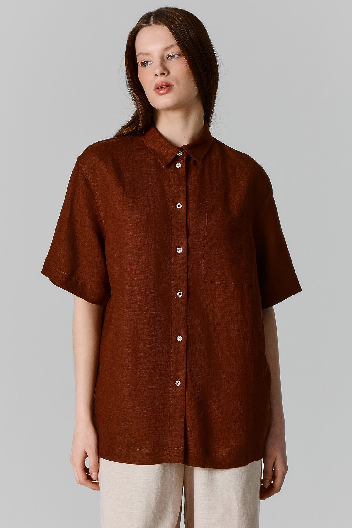 Блузка женская свободного силуэта из ткани. Блузка с цельнокроеной планкой и центральной застежкой на пуговицы. На левой детали переда накладной карман. Горловина круглой формы с рубашечным воротником. Плечо спущено, пройма углублена. Рукав втачной, короткий. Низ рубашки прямой.