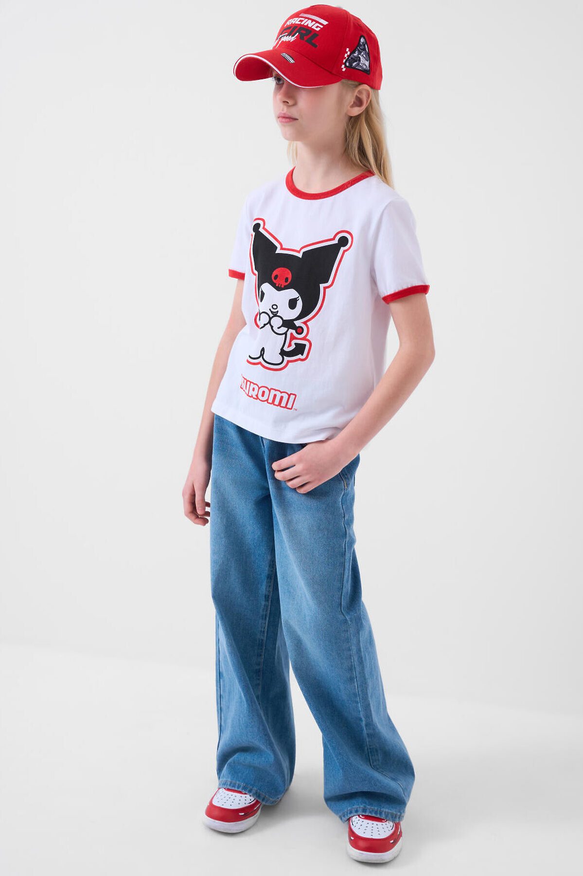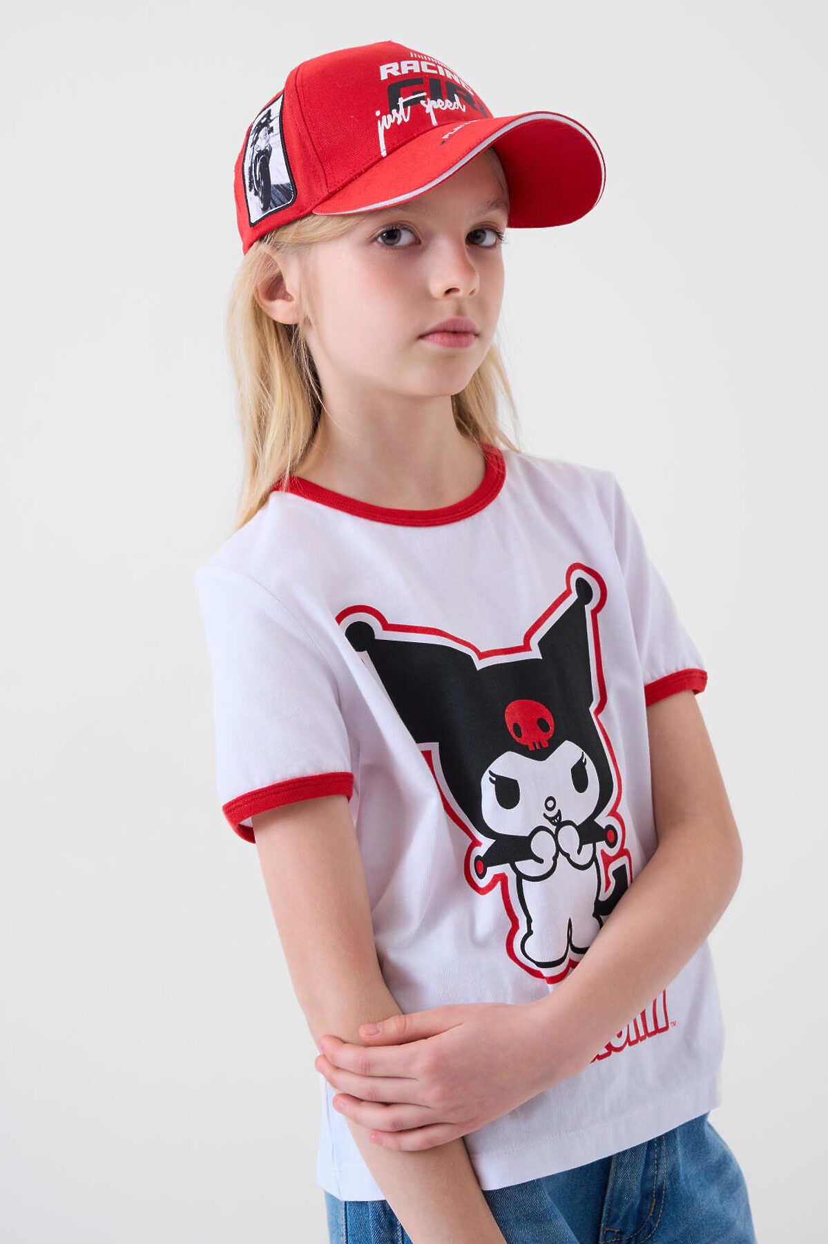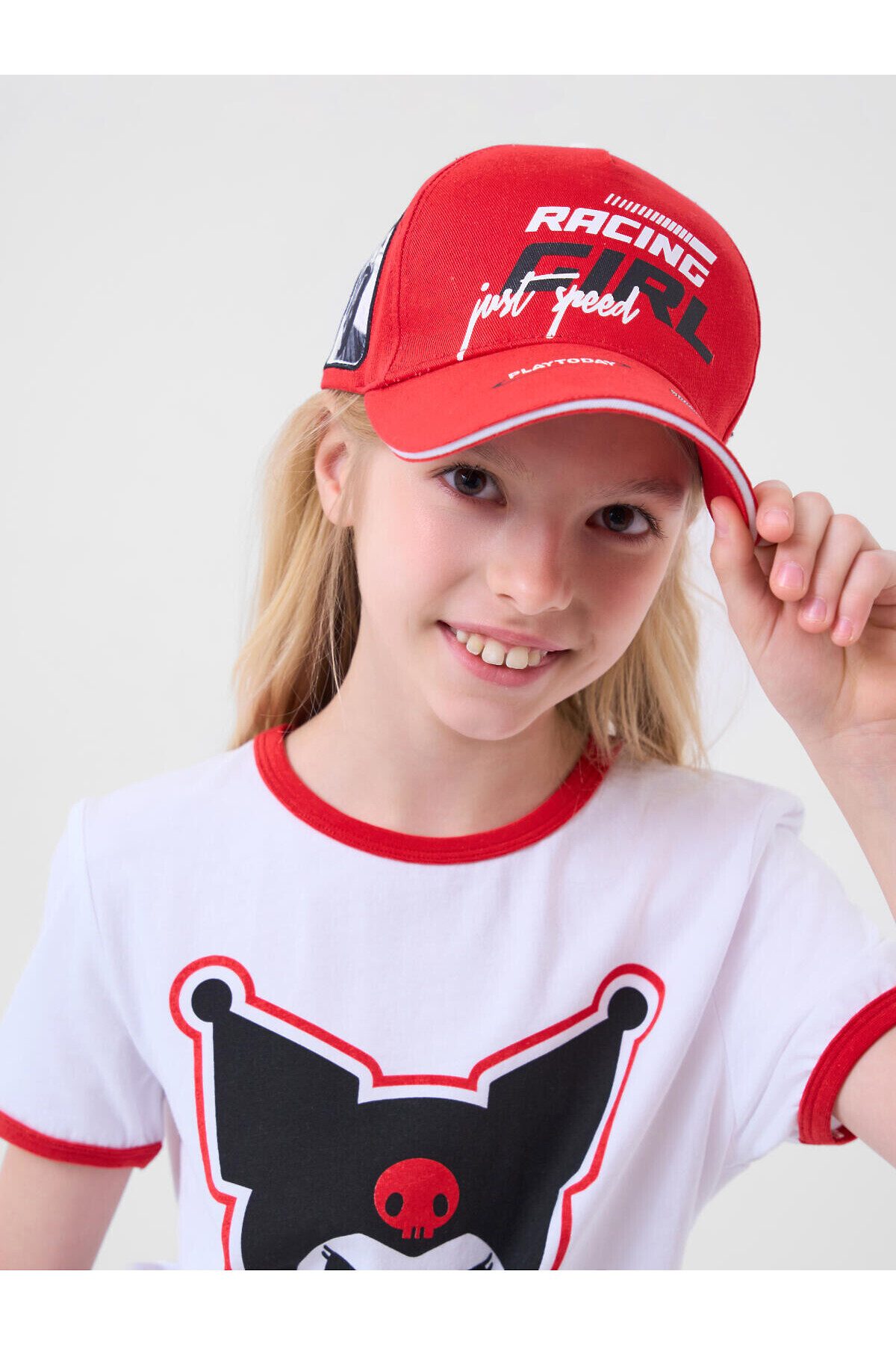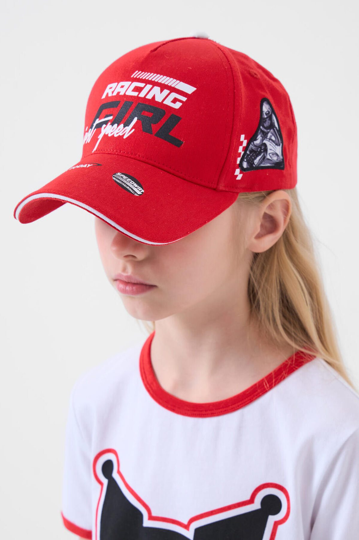 Бейсболка для девочки подростка. На передней части — крупный принт. Слева и справа расположены эффектные патчи с изображением гонщицы на мотоцикле, придающие изделию спортивный и дерзкий вид. Козырек изогнутый. Сзади — удобная пластиковая застежка на кнопках с регулировкой. Бейсболка украшена вышитыми люверсами для вентиляции.