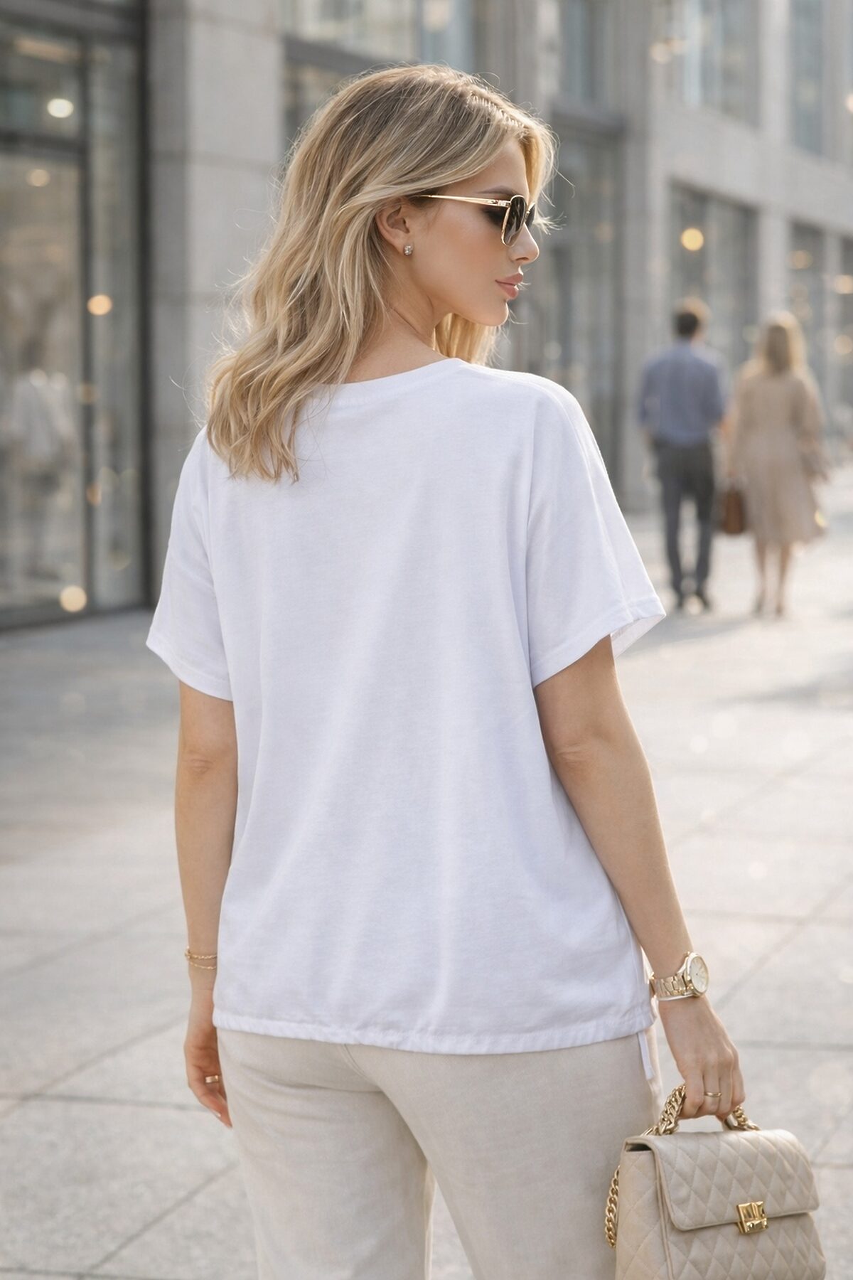 Превратите повседневный образ в модный тренд с элегантной туникой-футболкой А1025. Эта оверсайз-модель сочетает комфорт, стиль и женственность, создавая идеальный баланс между casual-образом и изысканностью. Длина в стиле туники позволяет носить её с юбками, шортами или леггинсами, создавая модные многослойные луки, а опущенная линия плеча придает модели мягкий, современный характер, делая её особенно комфортной для повседневной носки. Дизайн, который покорит сердце Главный акцент завязка регулирующая силуэт: затяните её для акцентирования фигуры или оставьте свободной для расслабленного образа. Цветочный принт с блестящими стразами создает эффект сияющего акцента особенно на солнце стразы переливаются, добавляя образу шарма и гламура. Каждый элемент принта, от цветов до геометрических форм, выполнен с вниманием к деталям, делая футболку не просто базовым элементом, а настоящим украшением гардероба. Качественная ткань залог комфорта и долговечности. Изготовлена из качественной ткани с добавлением лайкры (95% хлопок, 5% спандекс), обеспечивающей эластичность и износостойкость. Хлопковая основа гарантирует мягкость и воздухопроницаемость, а стрейч-добавка делает футболку идеально сидящей по фигуре, не сковывая движений. Ткань сохраняет форму даже после многократных стирок, обеспечивая комфорт на протяжении всего дня. Универсальный крой для любой фигуры Оверсайз-крой со спущенной линией плеча подчеркивает достоинства фигуры, скрывая возможные недостатки. Каждая деталь продумана для максимального комфорта: свободный крой угодит как стройным, так и пышным формам, а мягкая посадка исключает лишние складки. Простой уход долгий срок службы Уход за изделием не потребует особых усилий: Стирайте в деликатном режиме при температуре не выше 30C с мягкими моющими средствами. Гладьте наизнанку, чтобы сохранить блеск страз и целостность принта. С чем носить? Офисный лук: сочетайте с черными брюками и лодочками, добавив ожерелье Повседневный образ: джинсы и кеды или кроссовки создадут непринужденный стиль. Вечерний вариант: юбка-карандаш и туфли на каблуке превратят футболку в элегантный элемент. Для прогулок: шорты и сандалии подчеркнут легкость и свежесть. Модель доступна в трех цветах: Белый свежий и легкий, идеален для летних дней. Бирюзовый яркий и современный, добавит образу энергии. Черный элегантный и универсальный, подойдет для любого случая. Дополните образ сумкой-клатч, стильной цепочкой или жемчужными ак