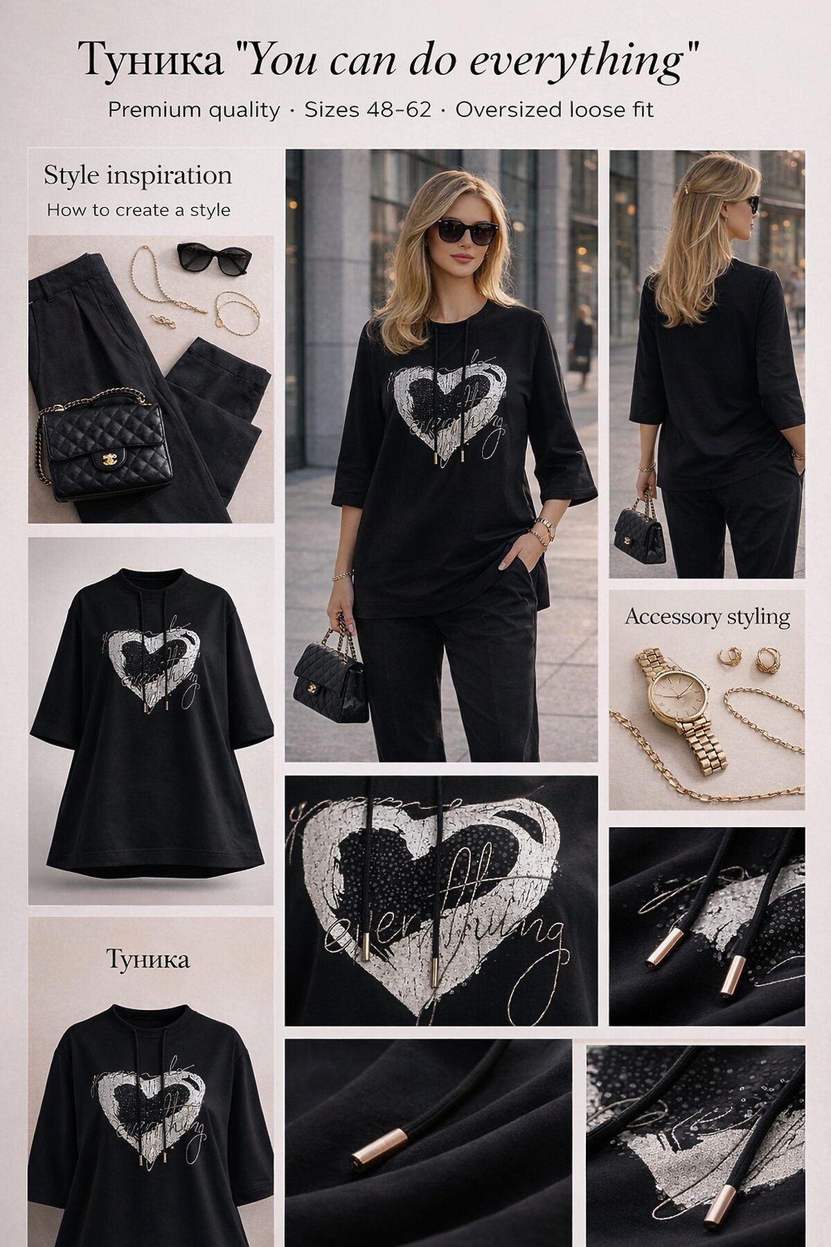 Стильная и комфортная туника-толстовка размера идеальный выбор для тех, кто ценит качество, свободу движений и вдохновляющий посыл! ✅ Материал: плотный хлопковый с добавлением стрейча мягкий, дышащий, не мнётся, отлично держит форму. ✅ Крой: свободный оверсайз подчёркивает непринуждённый стиль. ✅ Размеры: 2XL (4854), 3XL (5258), 4XL (5660), 5XL (5862) широкий диапазон для разных фигур. ✅ Дизайн: декоративные завязки по горловине + мотивирующий принт You can do everything в форме сердца с эффектом глиттера трендовый акцент, который поднимает настроение и уверенность! 🖤 Цвет: классический чёрный универсален, легко сочетается, визуально стройнит. 🌞 Сезон: весна, лето, осень носите с леггинсами, джинсами, юбками или под удлинённый жилет. 👕 Стили: casual, streetwear, sporty chic, empowerment fashion. ✨ Уход простой: стирка при ручном режиме 30C. Принт не трескается и не выцветает. Благодаря плотной ткани и умеренной толщине, тунику можно носить с ранней весны до поздней осени. В прохладные дни она отлично сочетается с легким пальто или ветровкой, а в теплое время как самостоятельный элемент образа. Идеально для повседневной носки, прогулок, встреч с друзьями или работы в расслабленном формате, свиданий или вечерних образов. Подарите себе комфорт и уверенность!