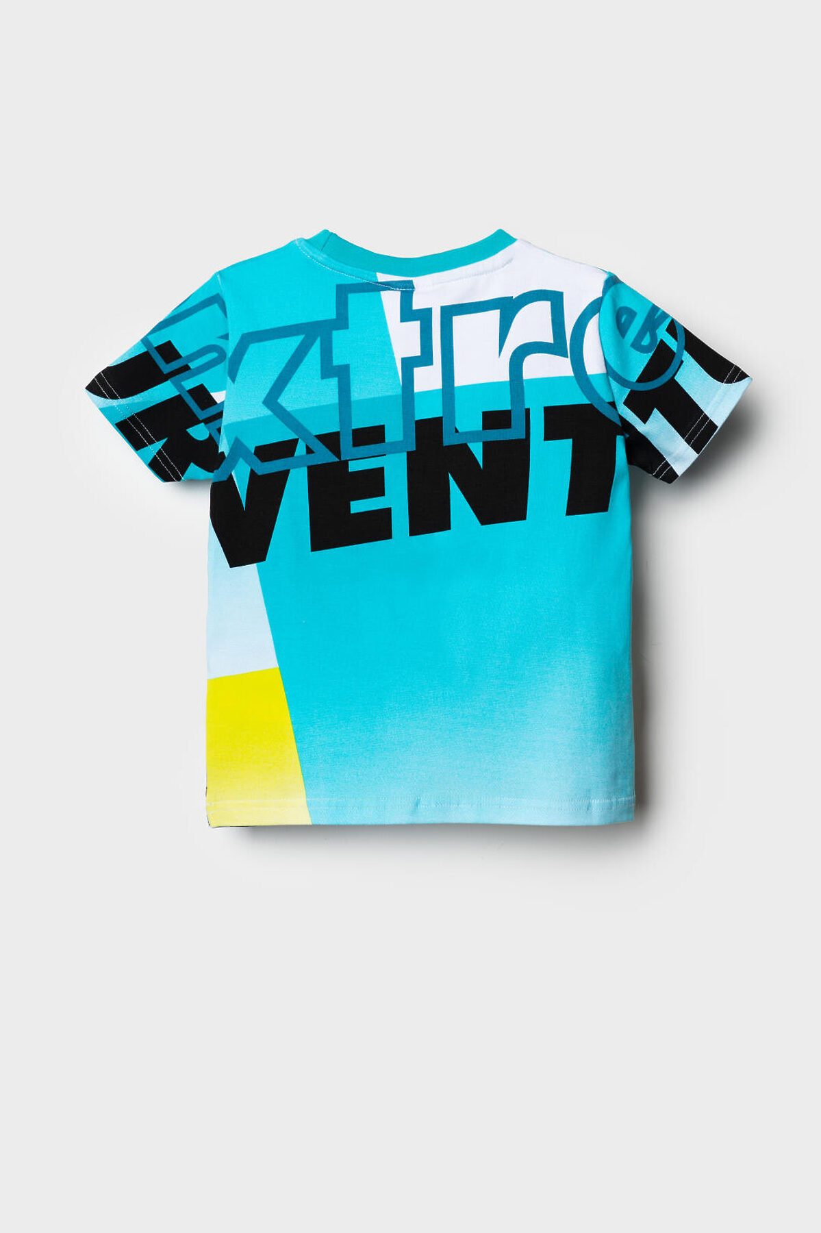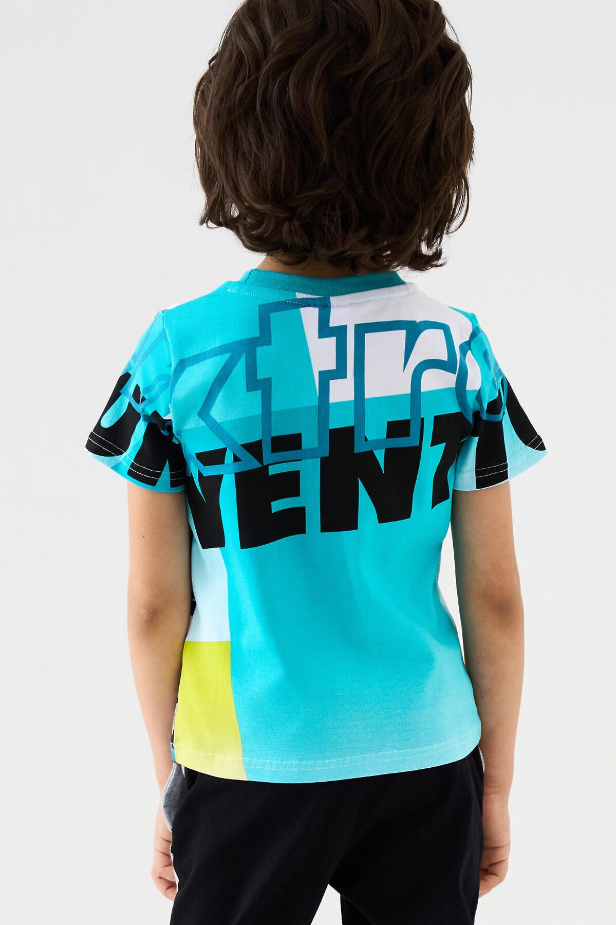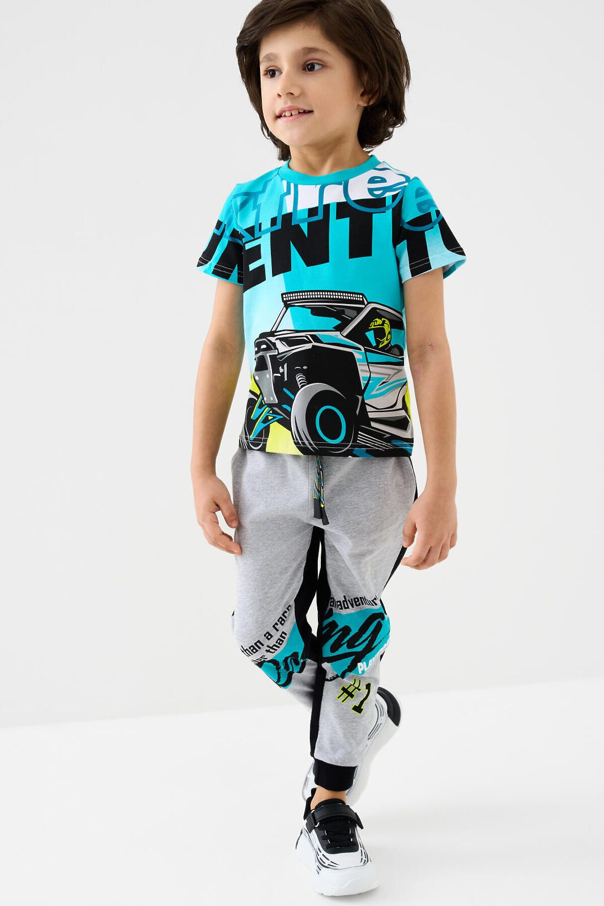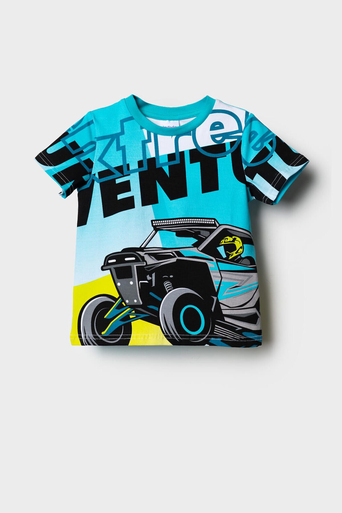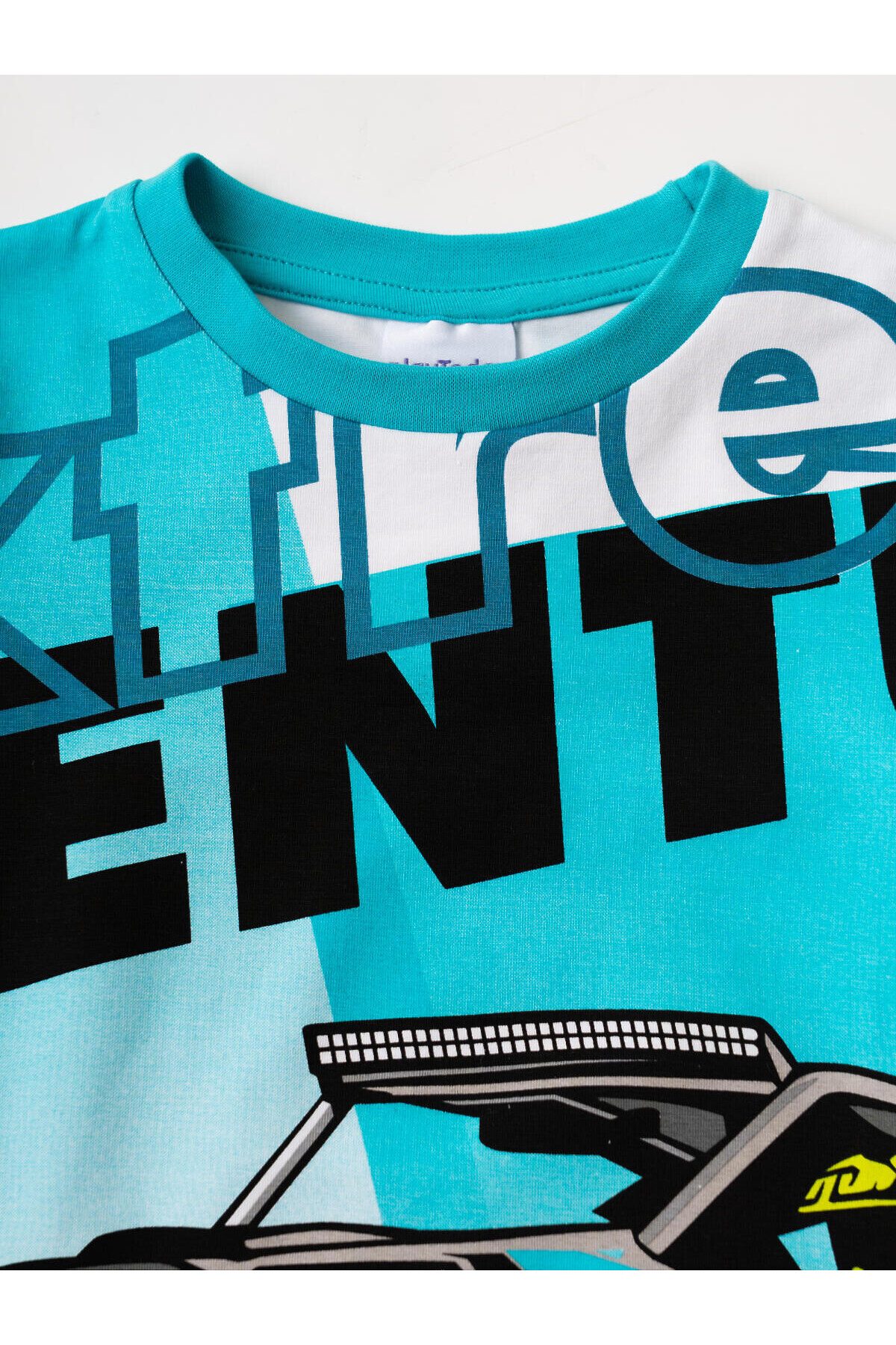 Детская футболка для мальчика. Модель прямого кроя, выполнена из эластичного хлопкового трикотажа джерси. Крупный принт в гоночной тематике. Горловина круглая, обработана эластичным рибом.