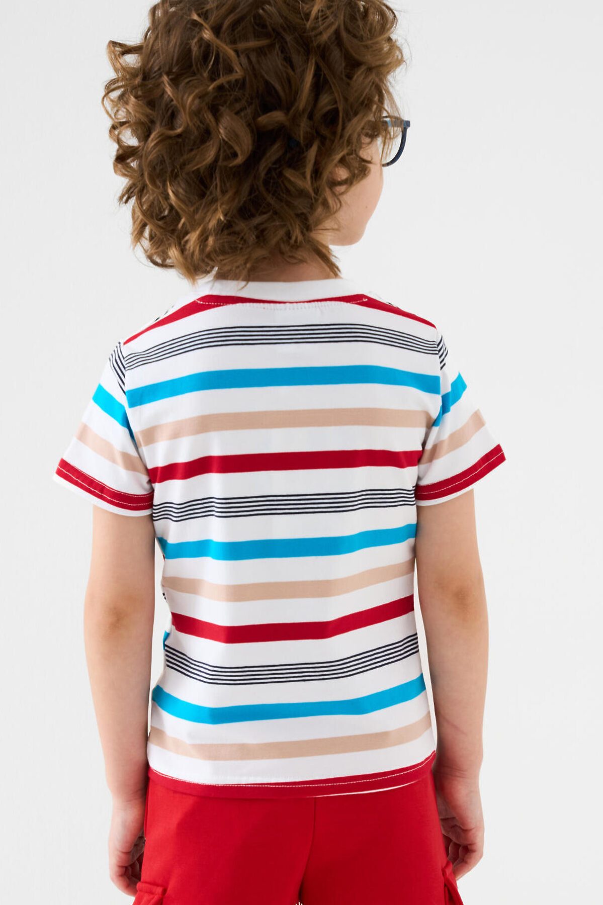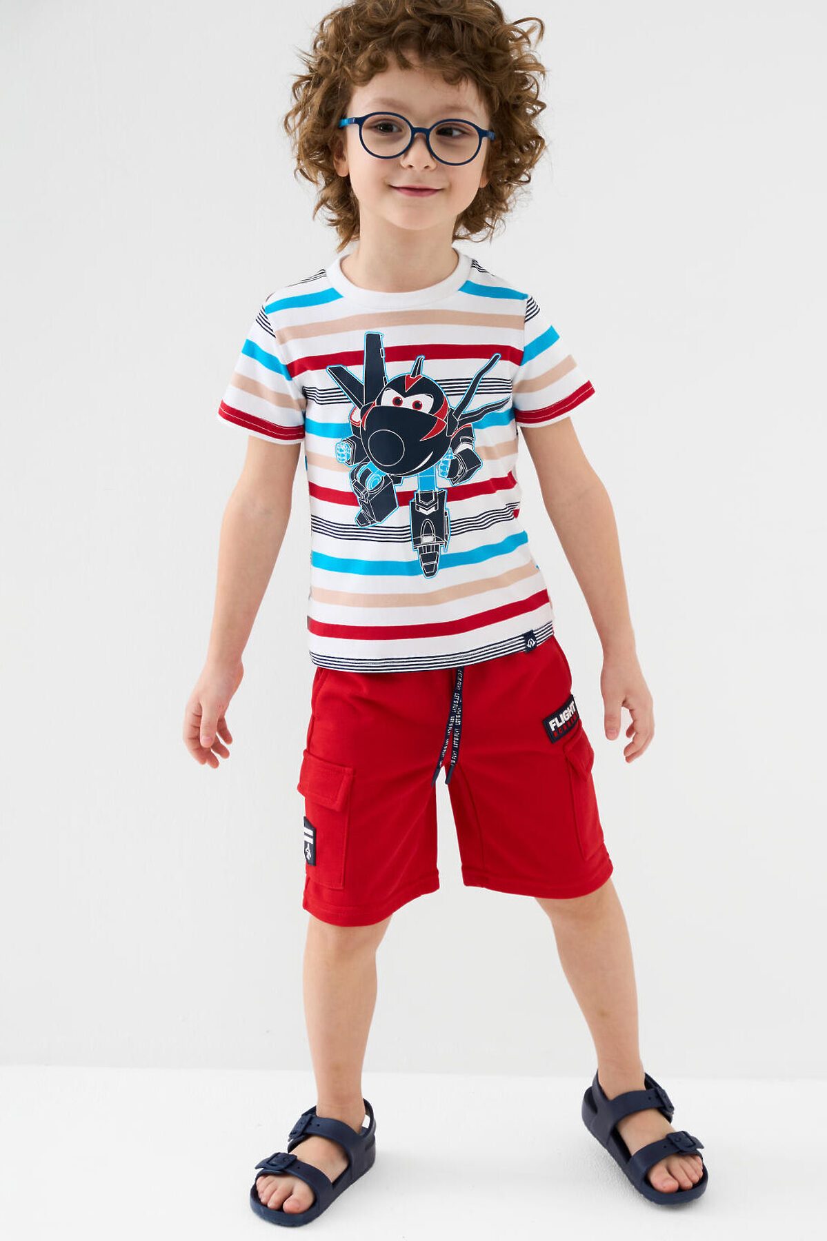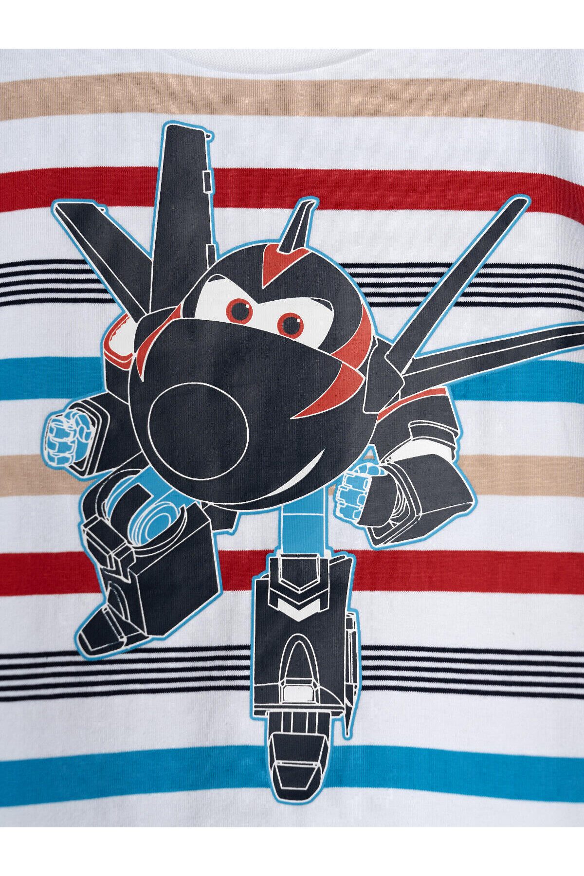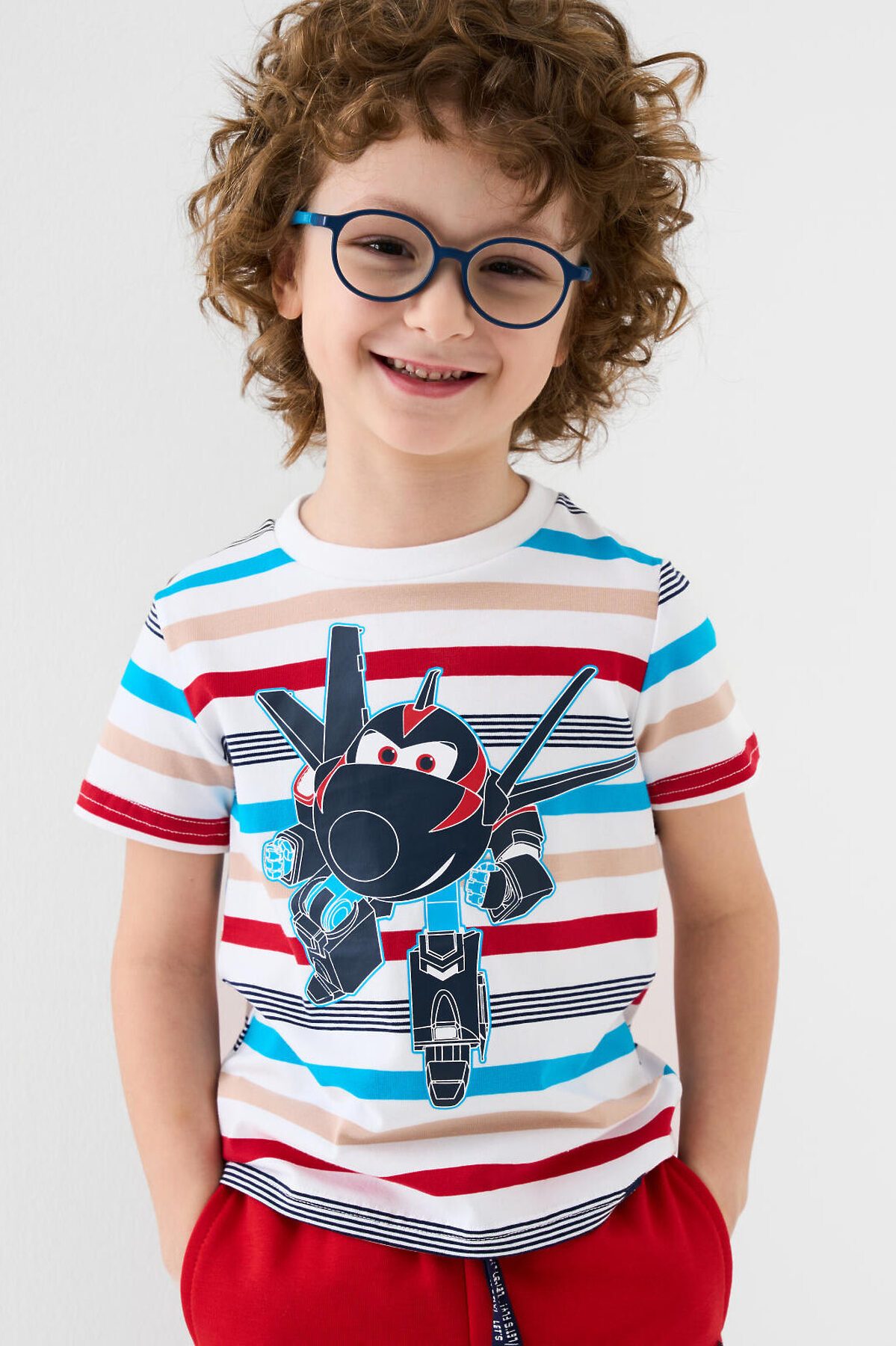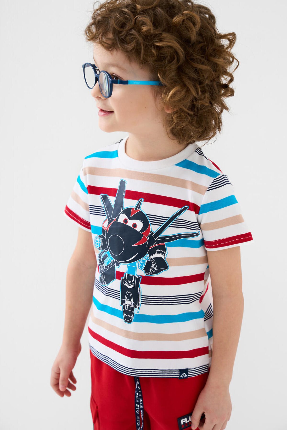 Детская футболка для мальчика. Модель прямого кроя, выполнена из эластичного хлопкового трикотажа джерси. Яркий принт с мультяшным героем "Super Wings". Горловина круглая, обработана эластичным рибом. В нижней части — небольшая нашивка.