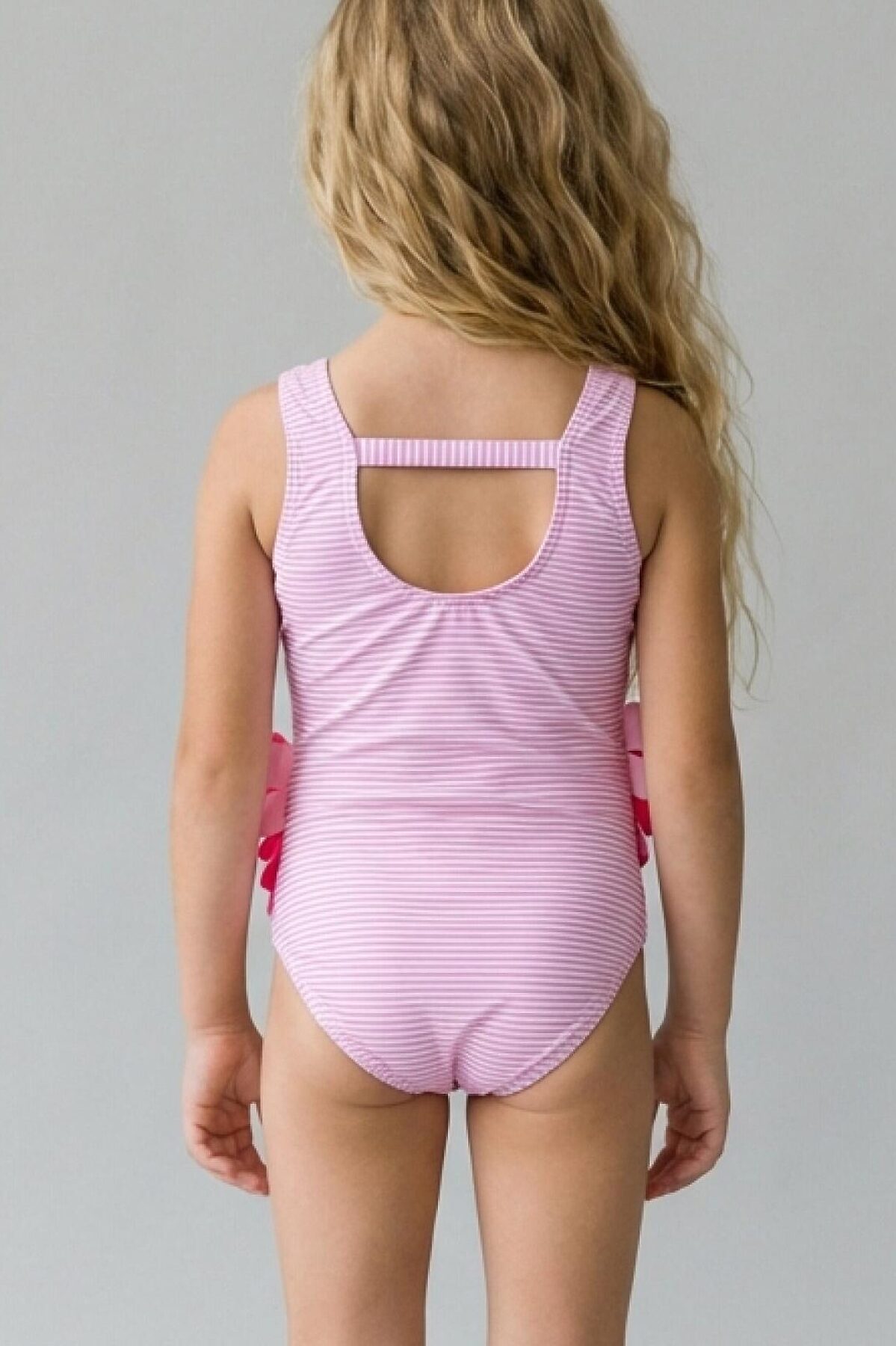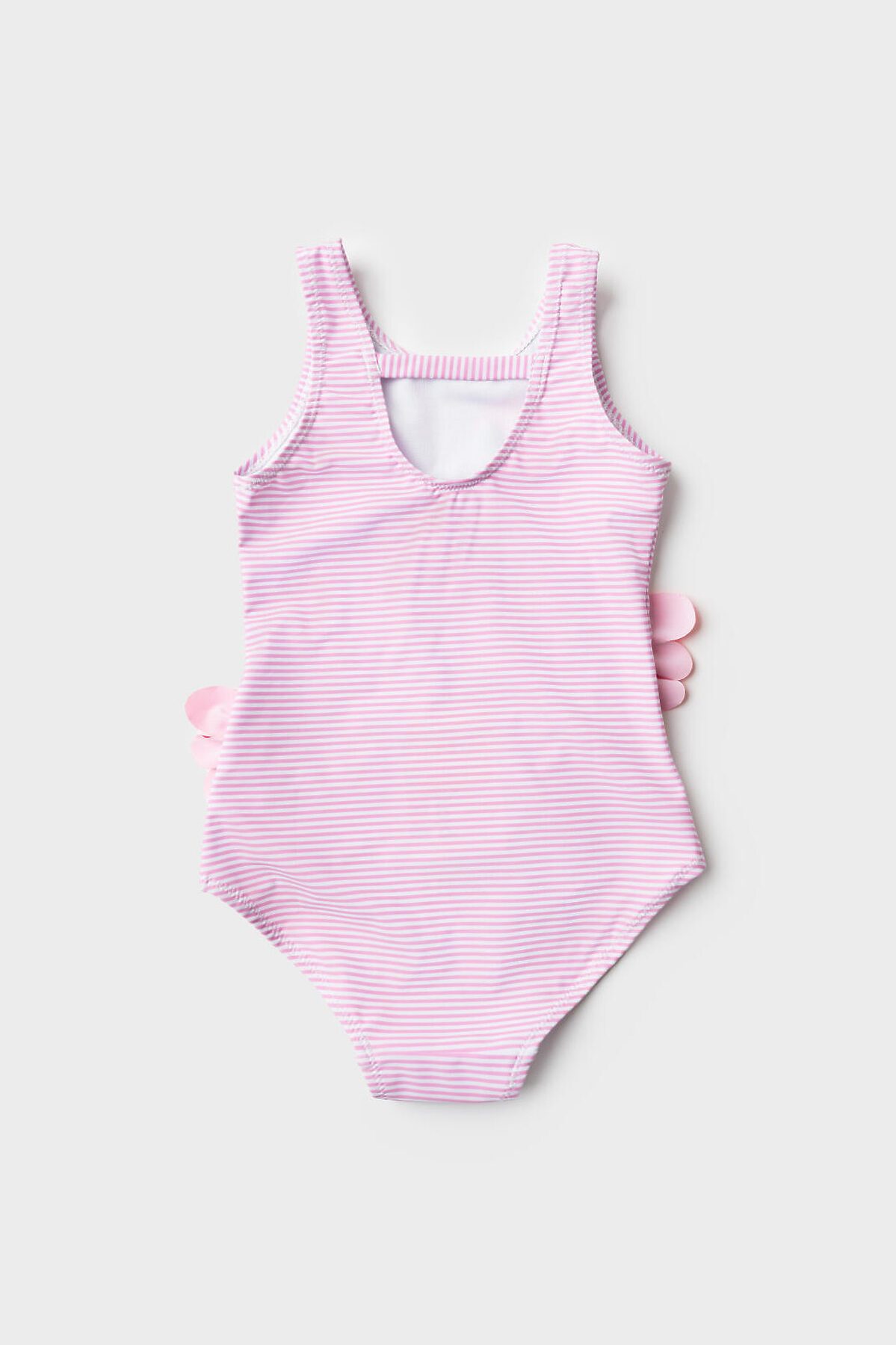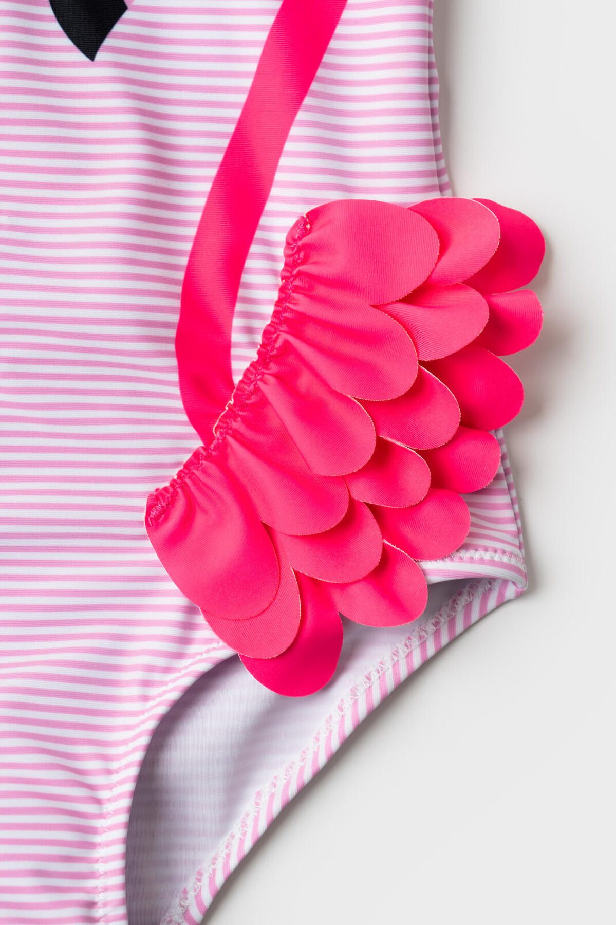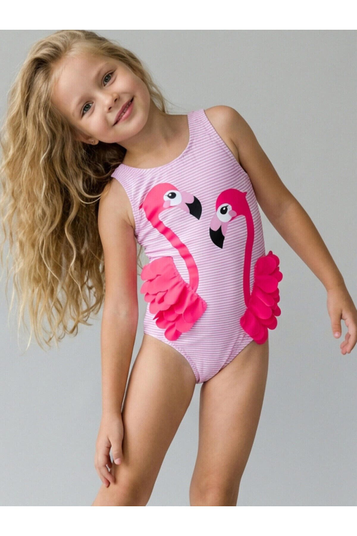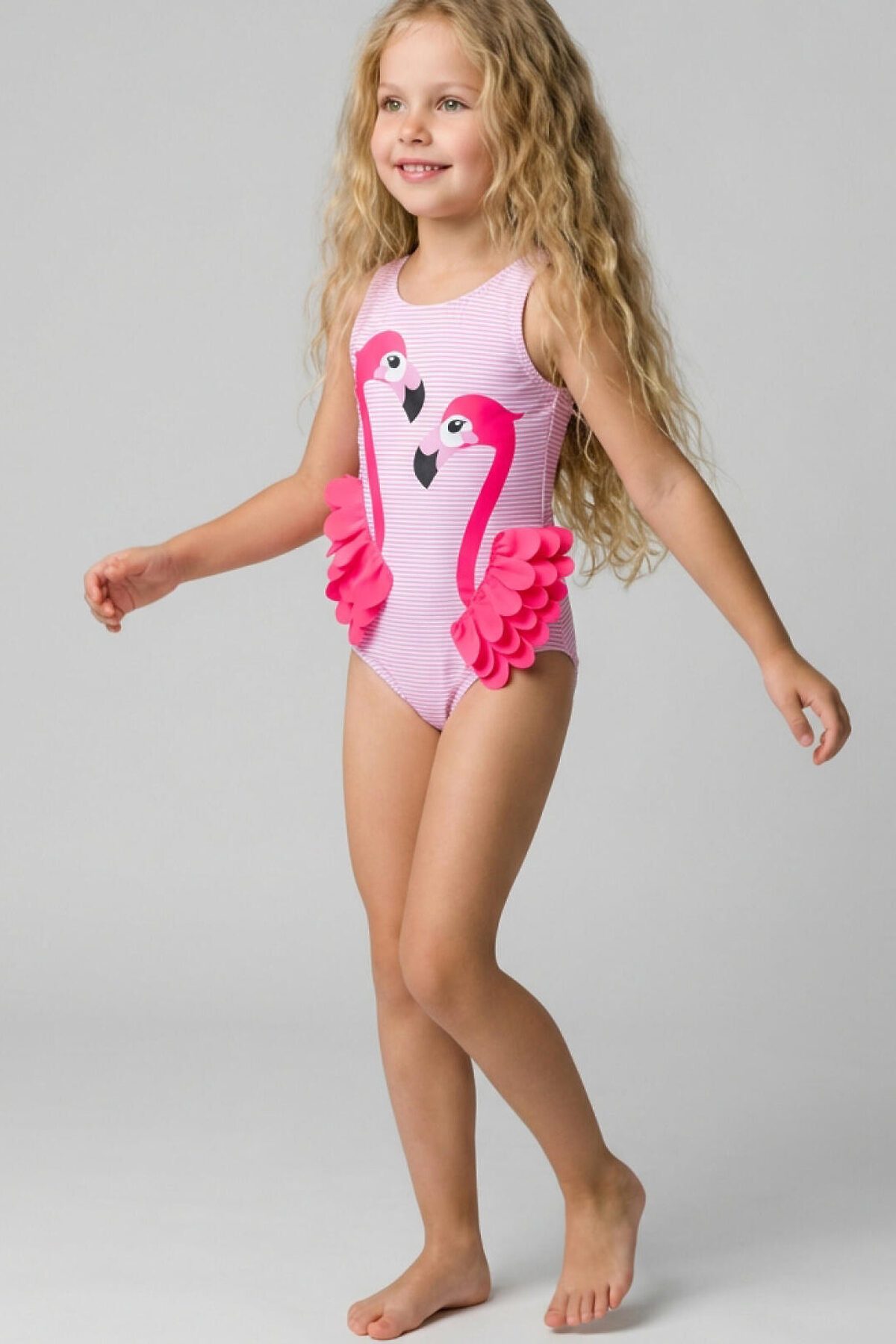 Детский купальник для девочки. Спереди нанесён принт с фламинго, крылья которых сделаны из объёмных тканевых элементов – они пышные, многослойные и выступают из основы, создавая эффект настоящих перьев. Купальник с открытой спиной и декоративной резинкой. Внутри есть подкладка и гигиеническая наклейка. Все края обработаны эластичной тесьмой, чтобы изделие хорошо сидело на теле и не натирало. Благодаря UF-защите, ткань сохраняет первоначальный вид даже при длительном пребывании на солнце. Подходит для плавания и активного отдыха.