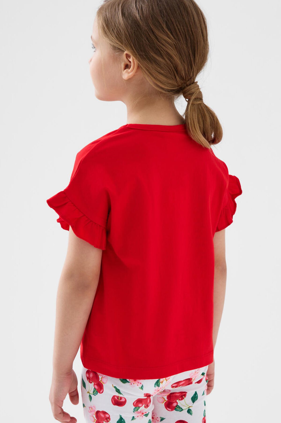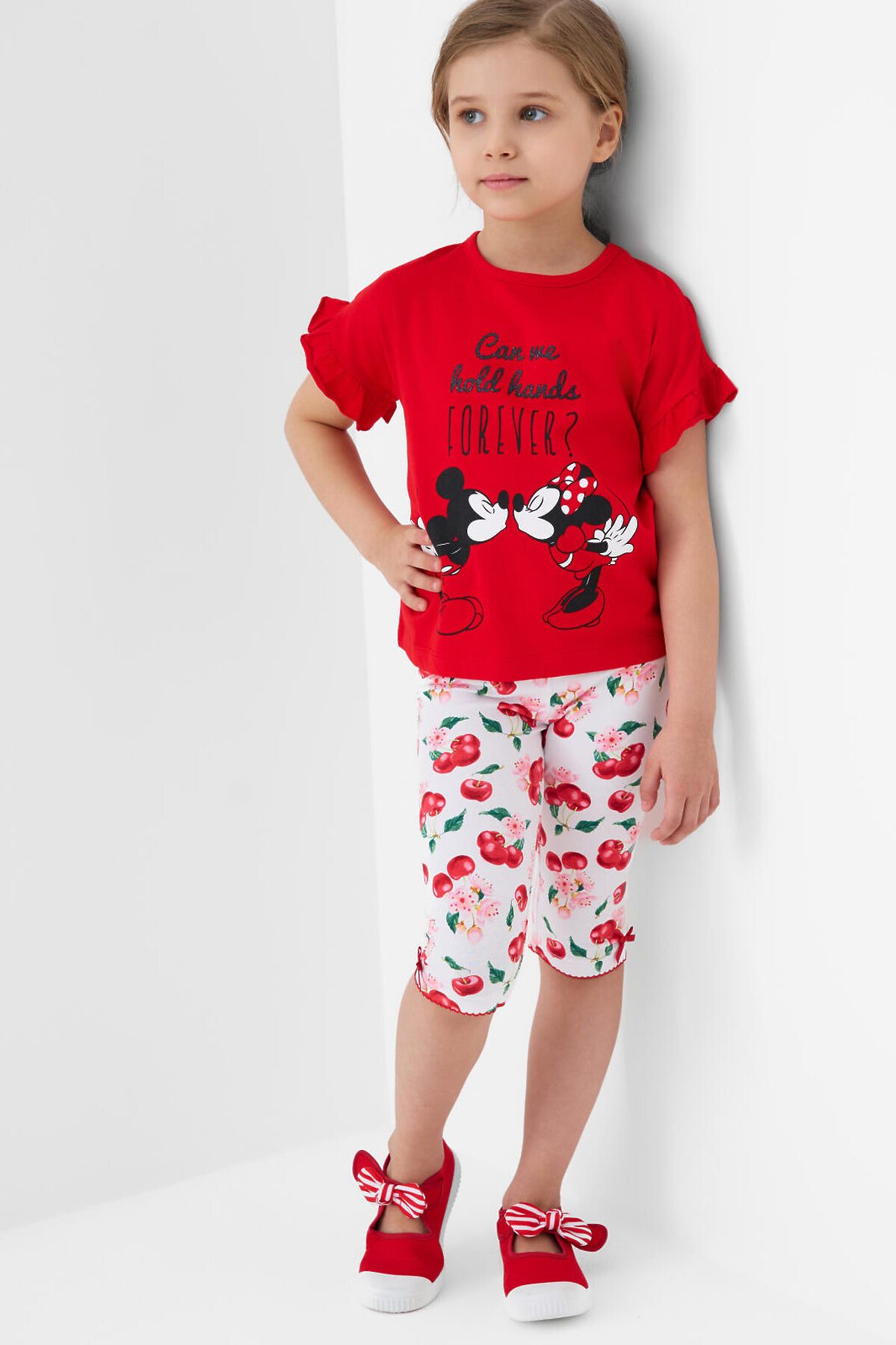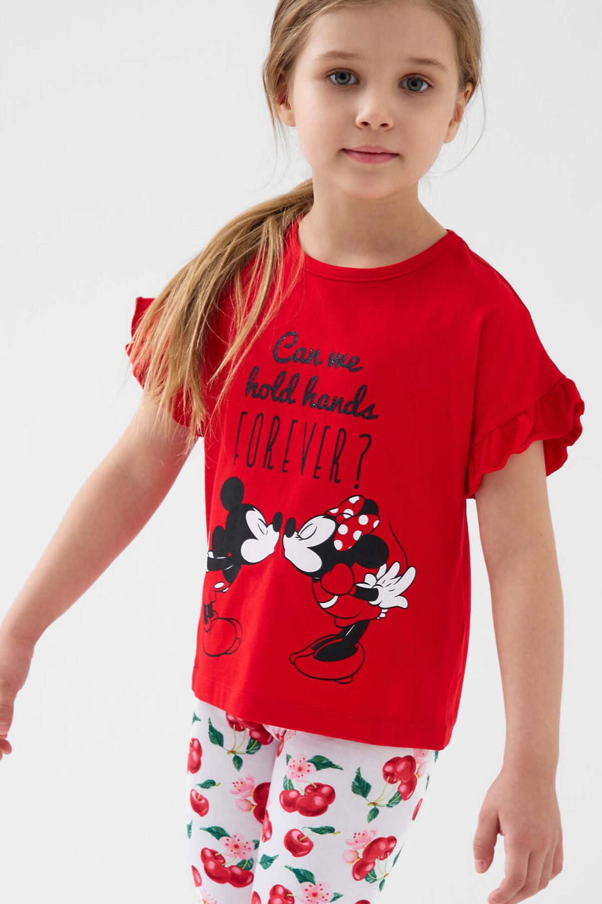 Детская футболка для девочки. Модель свободного кроя, выполнена из эластичного хлопкового трикотажа джерси. Красочный принт с любимыми мультяшными героями Минни и Микки Маус. Горловина круглая. Рукава с оборками.