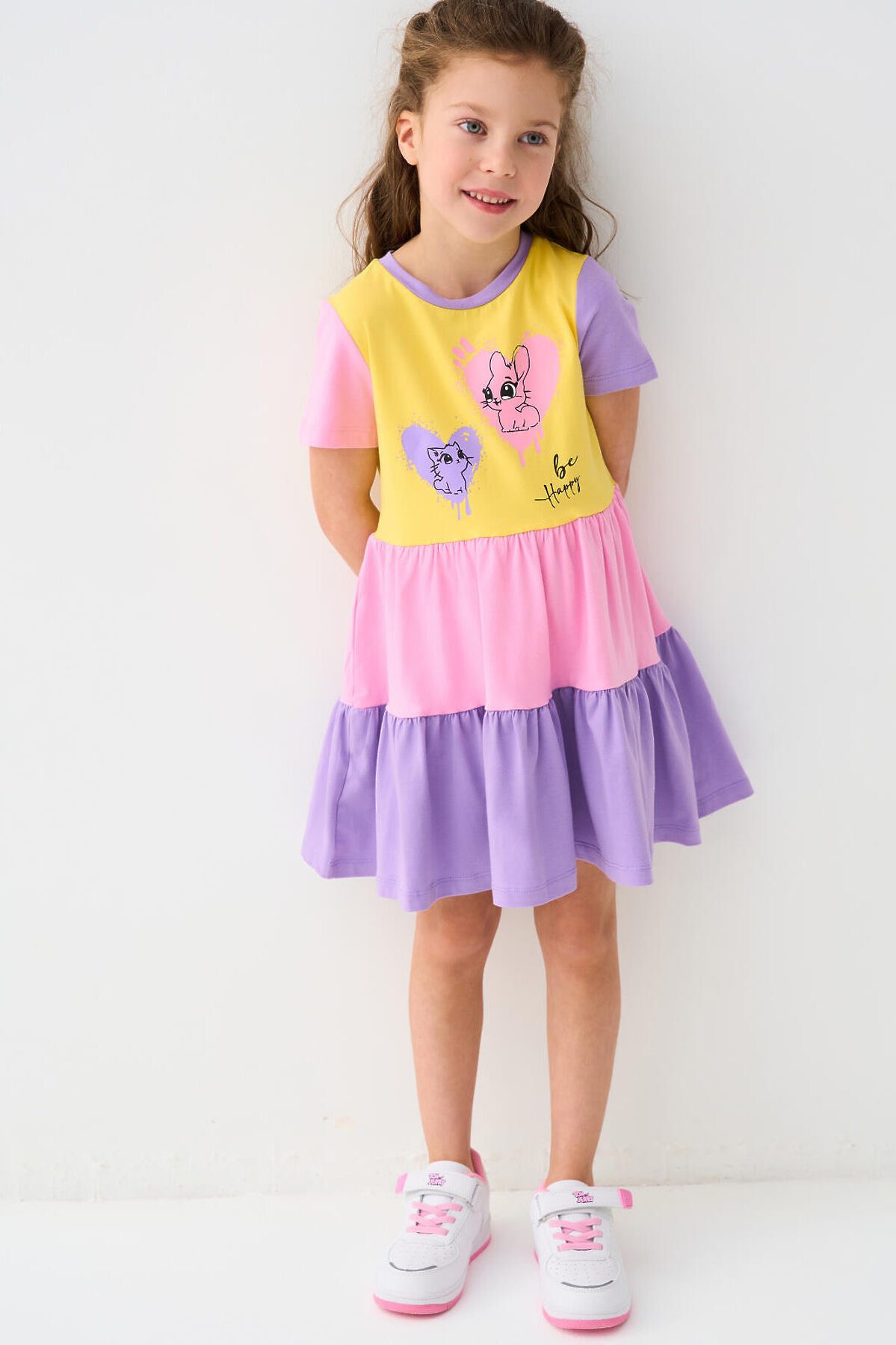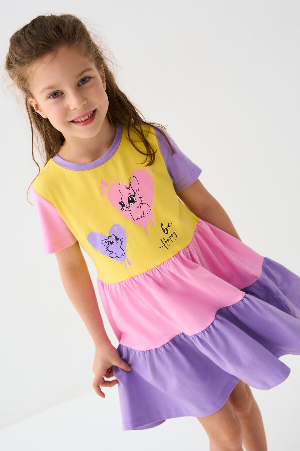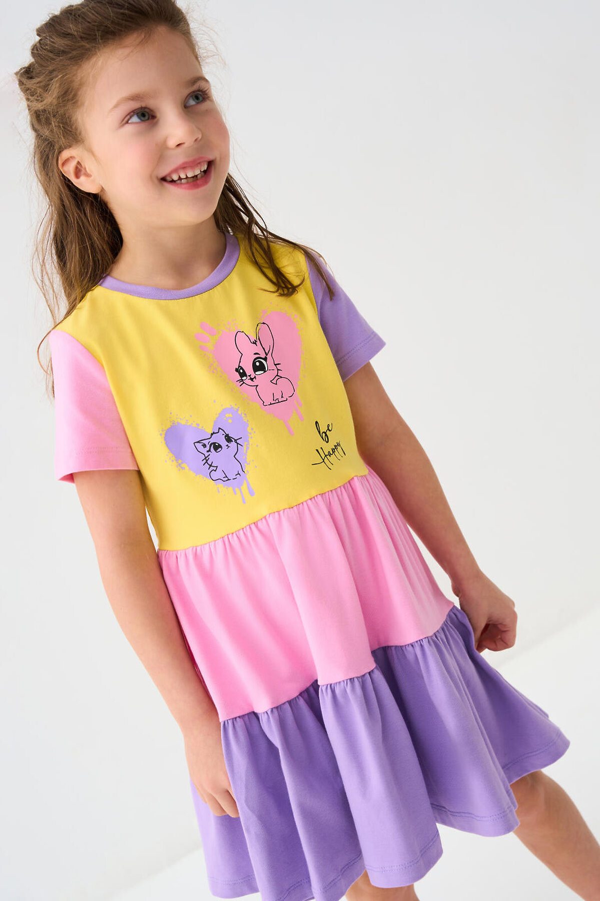 Детское лёгкое платье для девочки. Выполнено из мягкого хлопкового трикотажа джерси. Юбка двухъярусная с оборками. На груди — милый принт с изображением зайчика и котёнка в сердцах. Платье длиной выше колена, с удобной круглой горловиной.