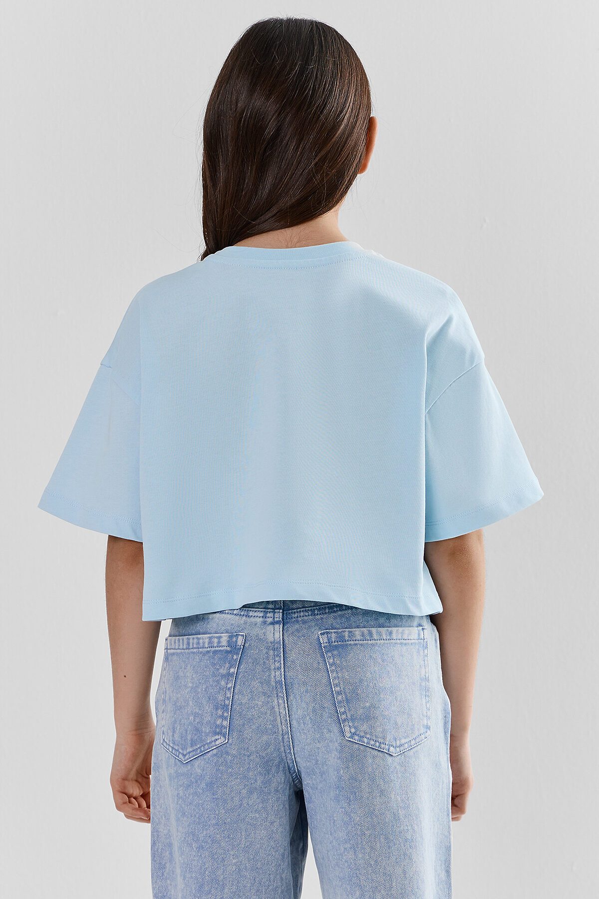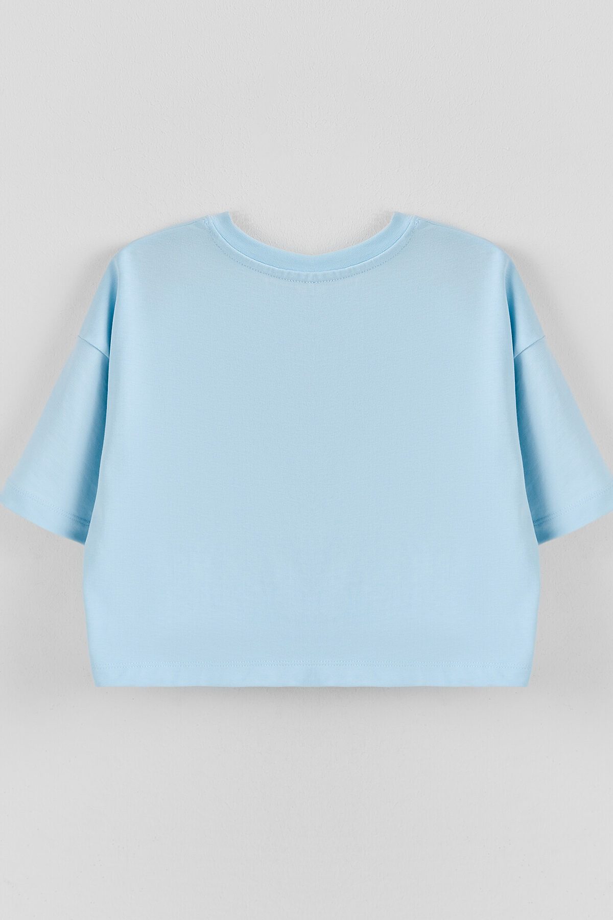 Футболка прямого силуэта укороченная. Перед и спинка цельнокроенные. Рукав втачной, короткий. Горловина круглой формы. Окантована обтачкой из рибаны. Шов втачивания обтачки по спинке закрыт бейкой из основного полотна. Низ рукавов и футболки швом в подгибку.