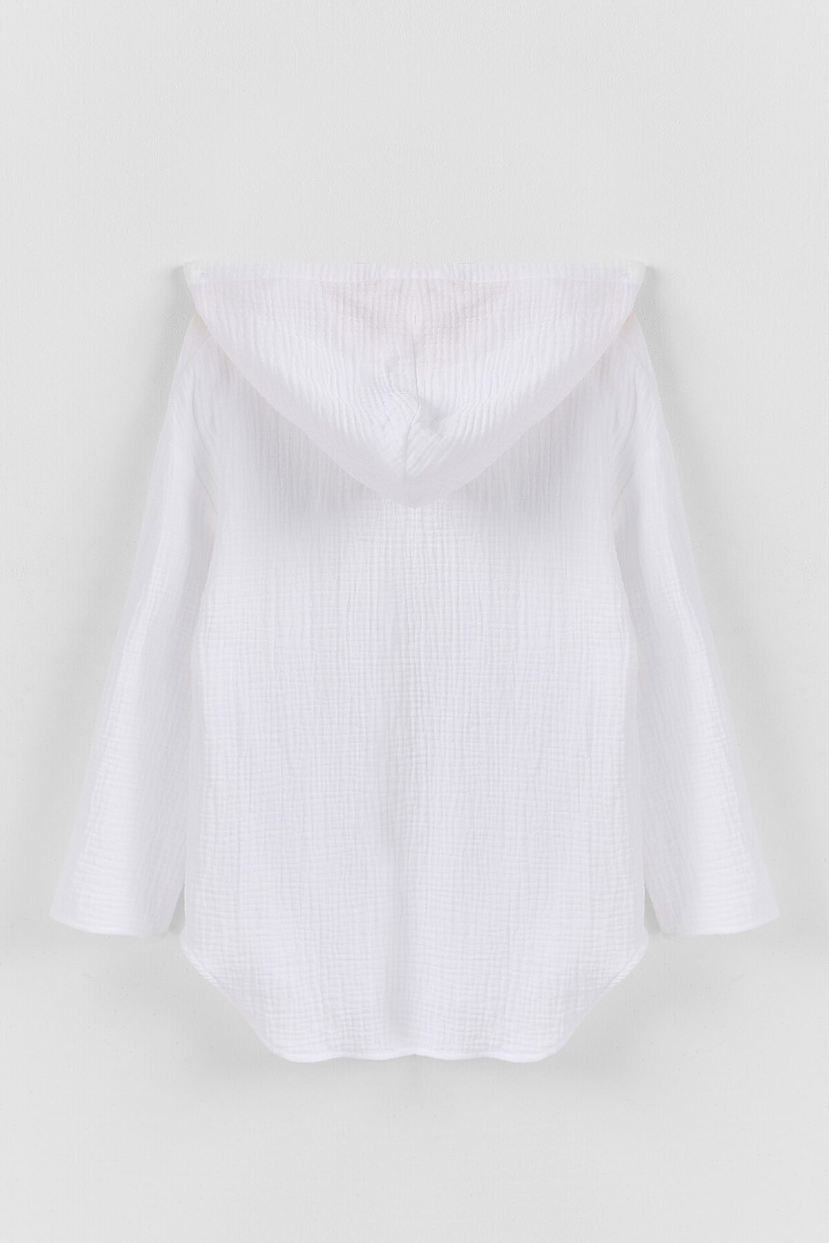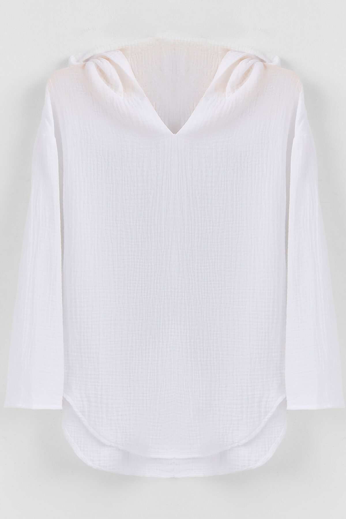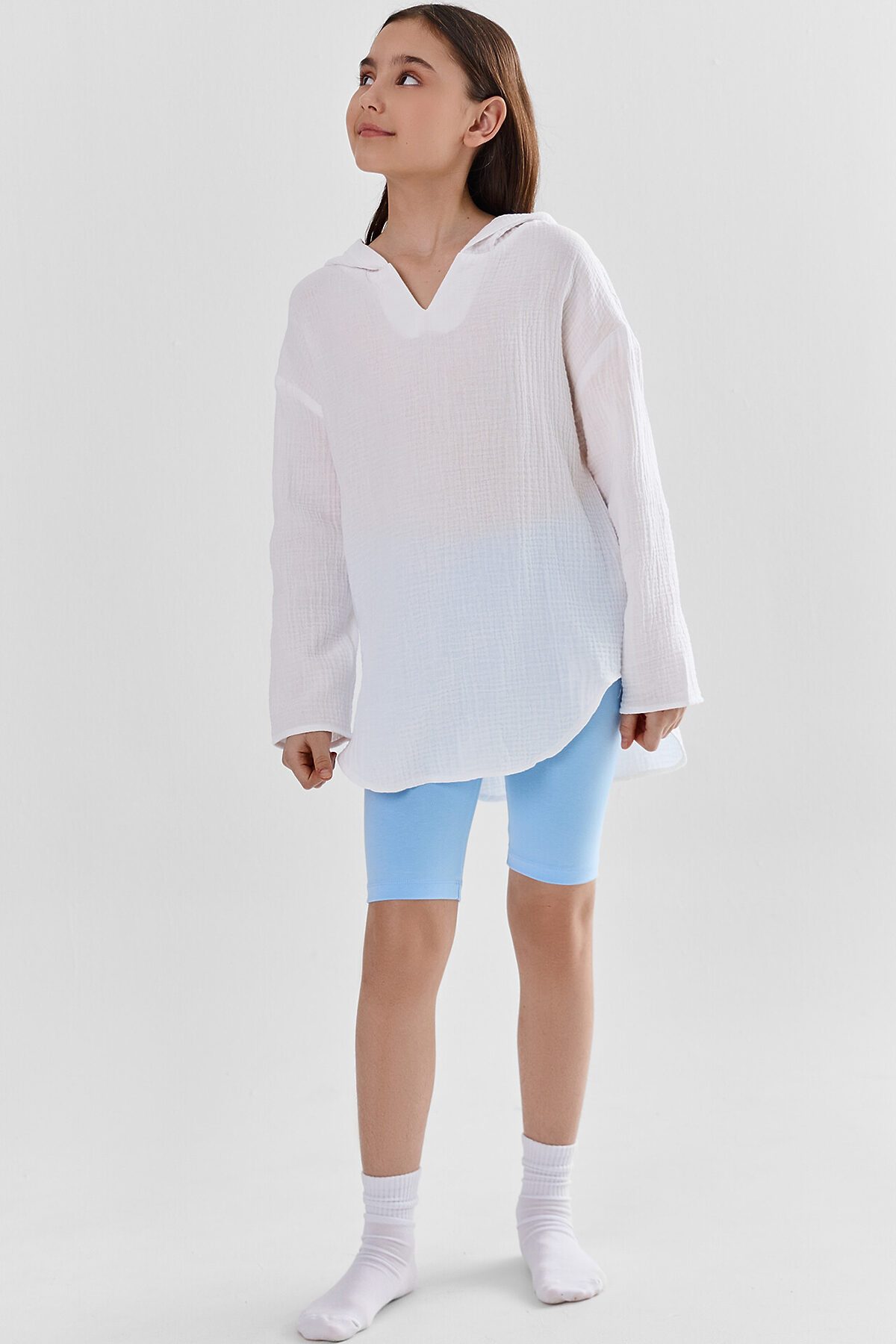 Туника для девочек свободного силуэта с капюшоном, выполнена из муслина. Горловина V-образная. Длина - ниже бедра. Спинка удлиненная. Рукава длинные втачные, линия плеча спущена. Низ изделия и рукавов обработаны в подгибку.