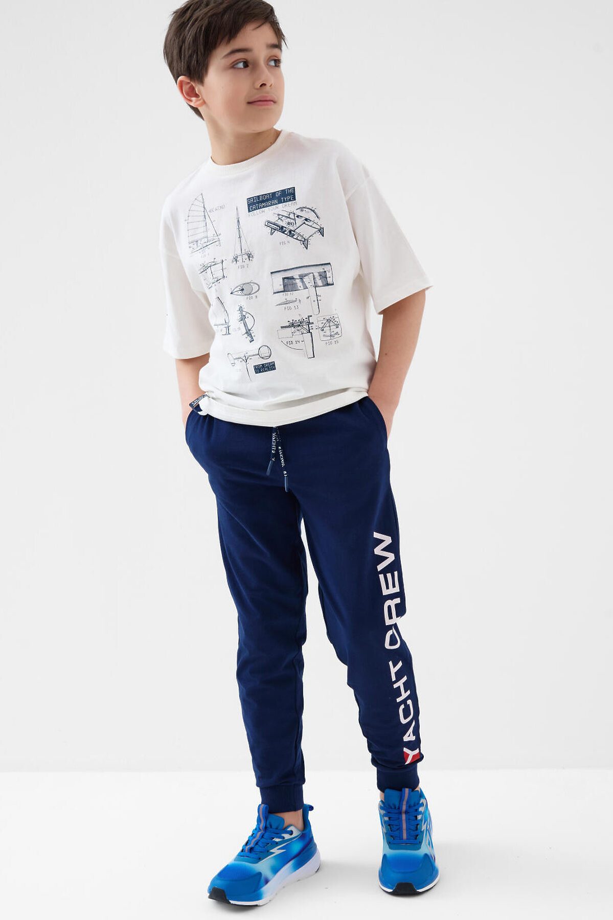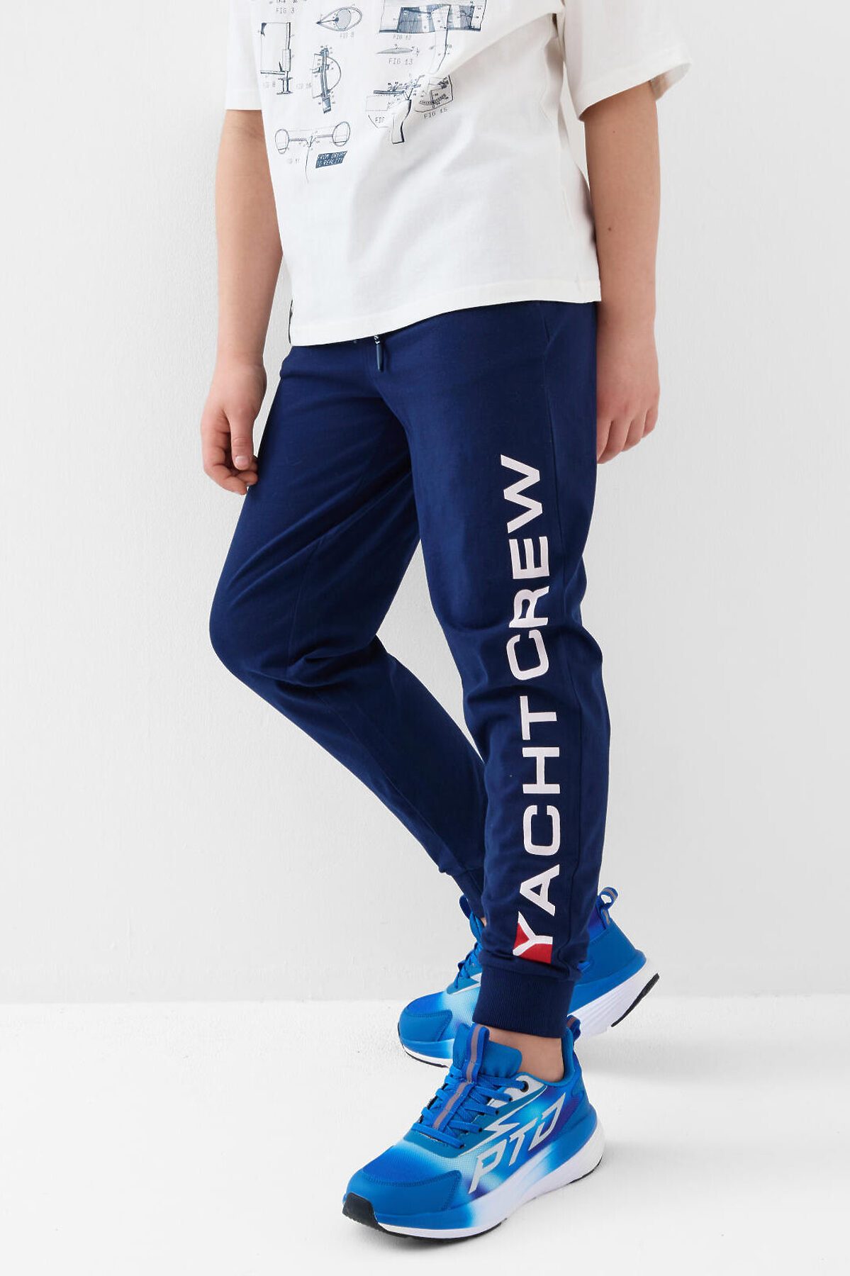 Брюки-джоггеры для мальчика подростка. Выполнены из хлопкового трикотажа джерси. Модель прямого кроя со средней посадкой на талии. Пояс выполнен на резинке, дополнительно регулируется шнурком. По бокам — удобные карманы. В нижней части брючин предусмотрены манжеты на резинке для лучшей фиксации. Брюки украшены принтом.
