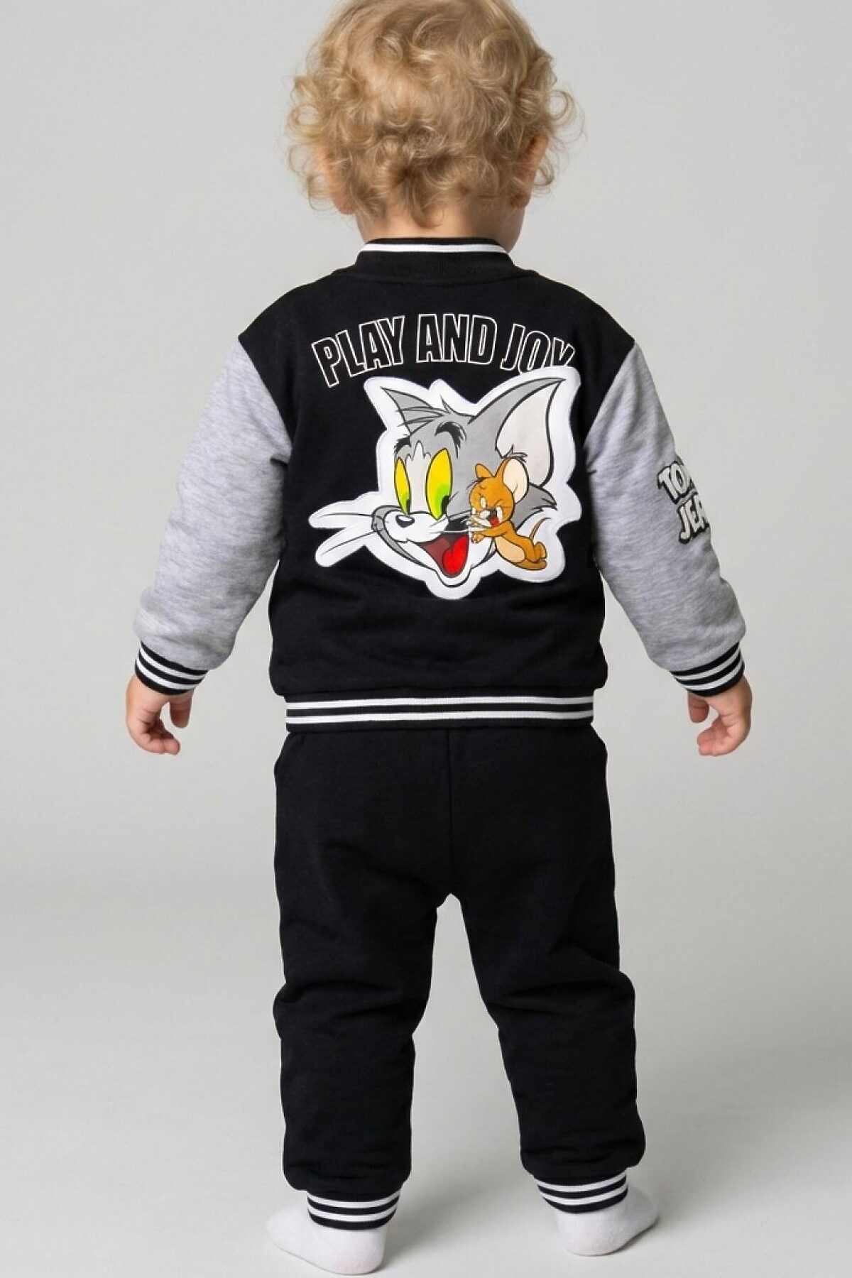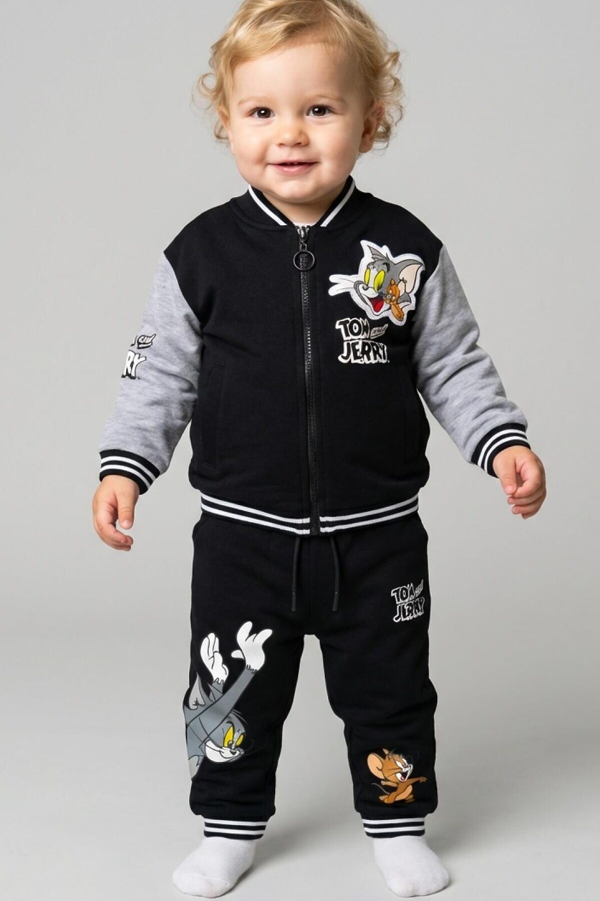 Детский спортивный костюм для мальчика. Комплект выполнен из хлопкового футера и состоит из толстовки на молнии и джогеров на резинке. Толстовка прямого кроя с красочным принтом любимых героев Том и Джерри. Боковые карманы. Манжеты и пояс выполнены из эластичного риба, благодаря чему изделие хорошо держит форму. Брюки джоггеры — комфортные, с эластичным поясом и шнуром для регулировки посадки. Удобные боковые карманы. Низ штанин собран на резинку.