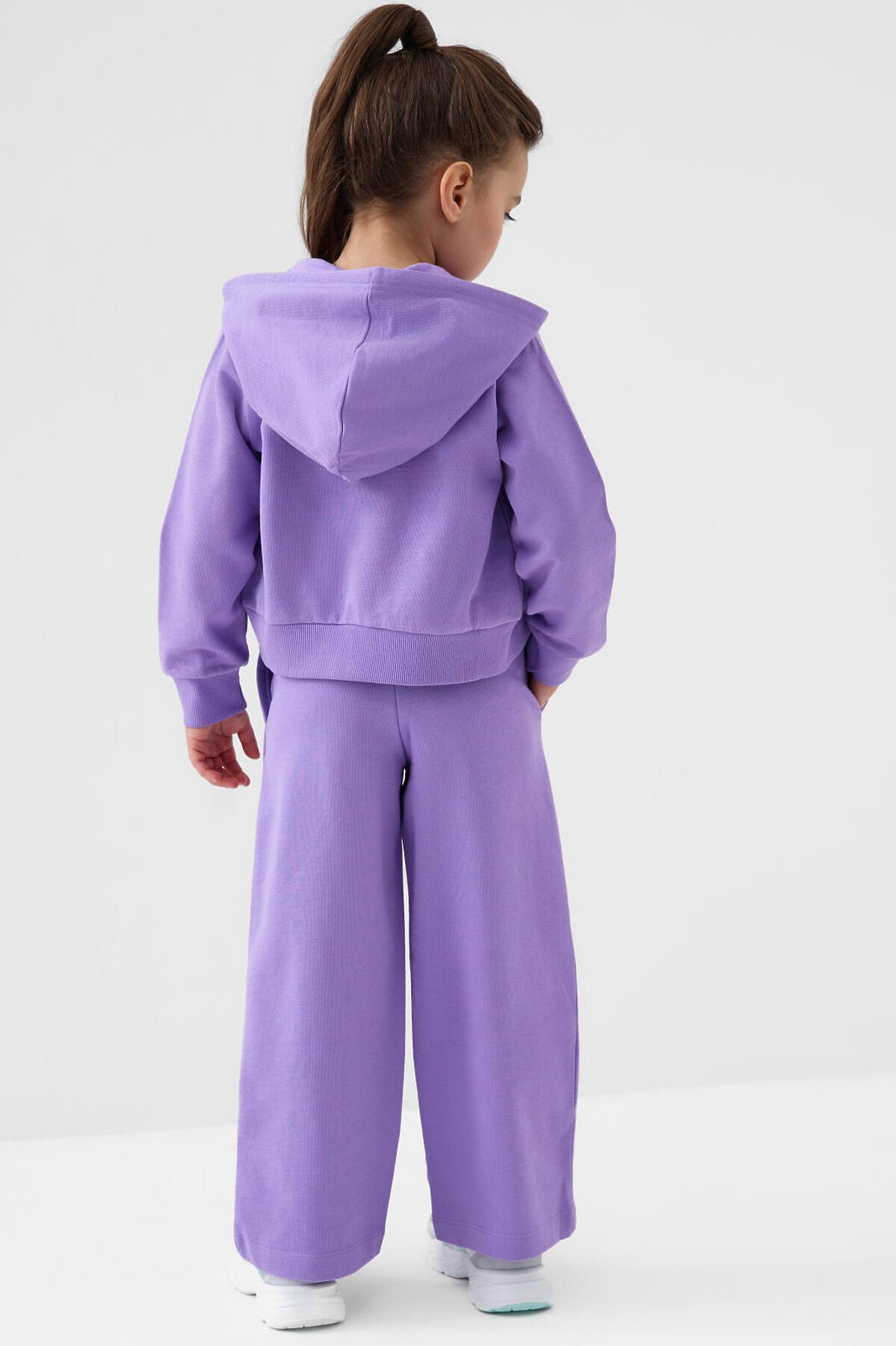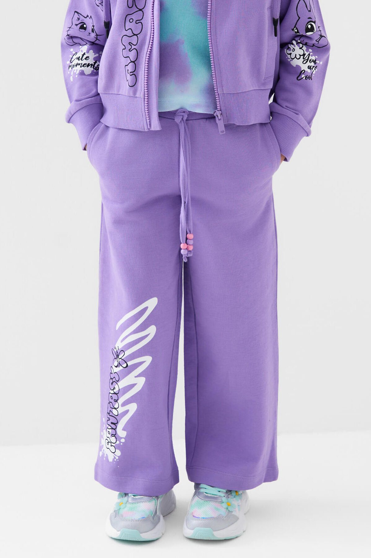Спортивные широкие детские брюки для девочки. Выполнены из мягкого хлопкового трикотажа футер без начеса. Пояс на резинке, для регулировки талии предусмотрен шнур. По бокам расположены карманы. Декоративные принты и бусины на шнуре для регулировки посадки.