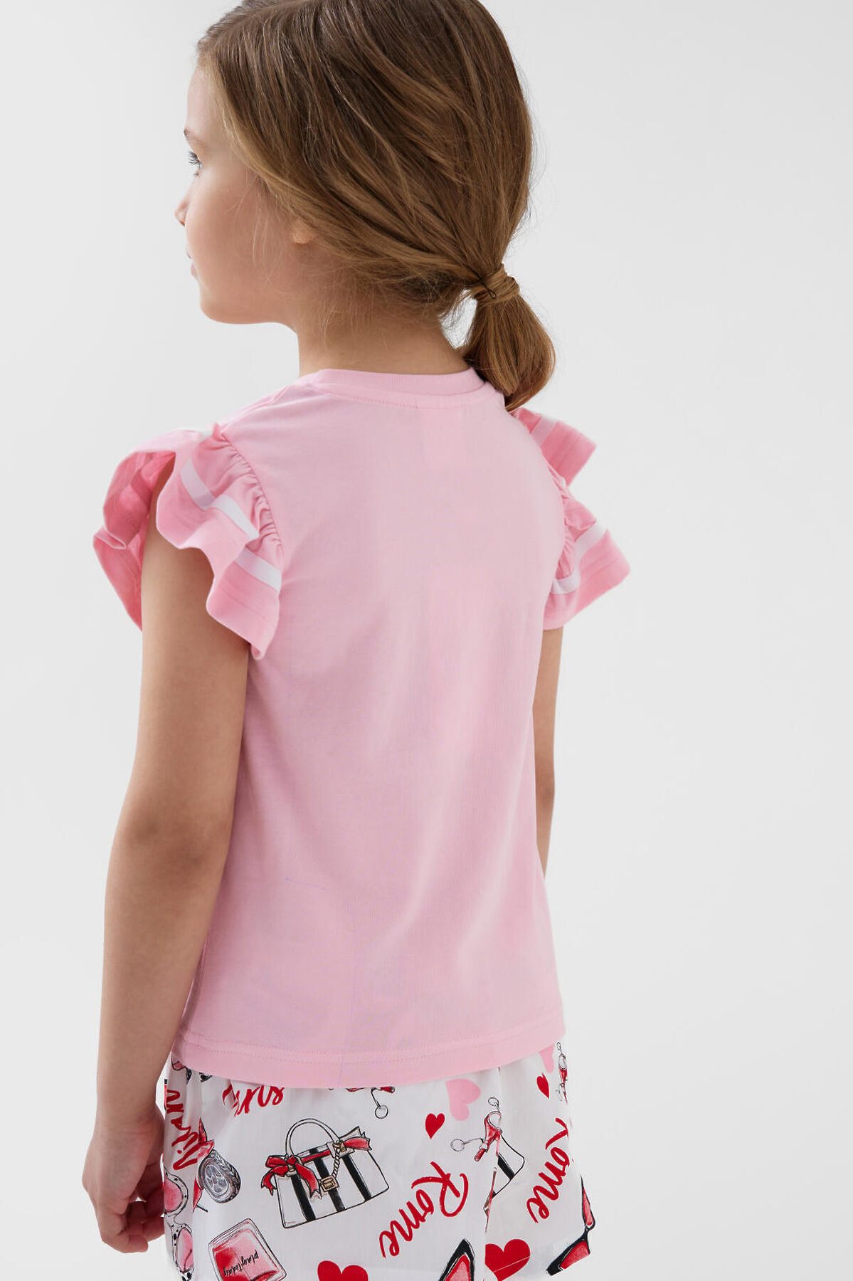 Детская футболка для девочки. Модель прямого кроя, выполнена из эластичного хлопкового трикотажа джерси. Спереди - крупный красочный принт. Горловина круглая. Рукава-крылышки.