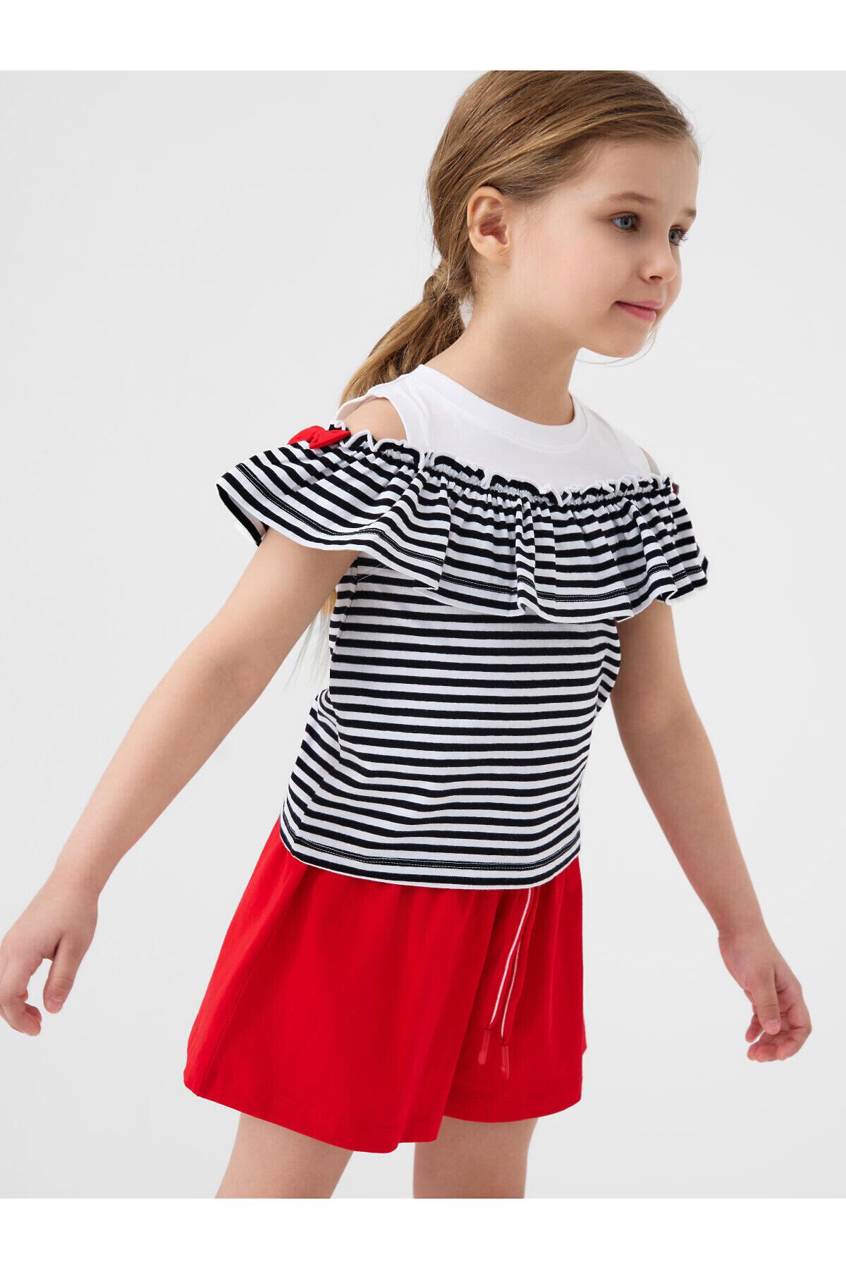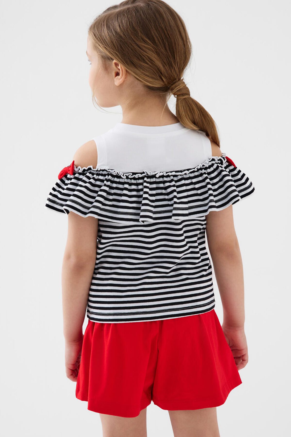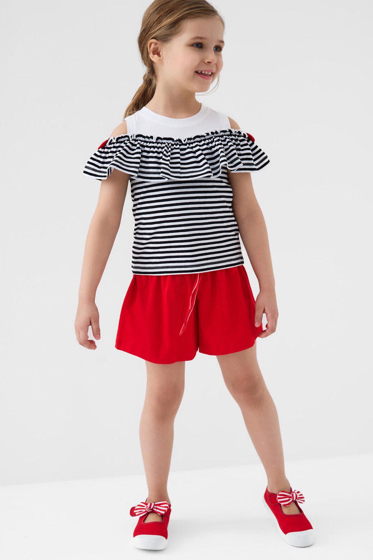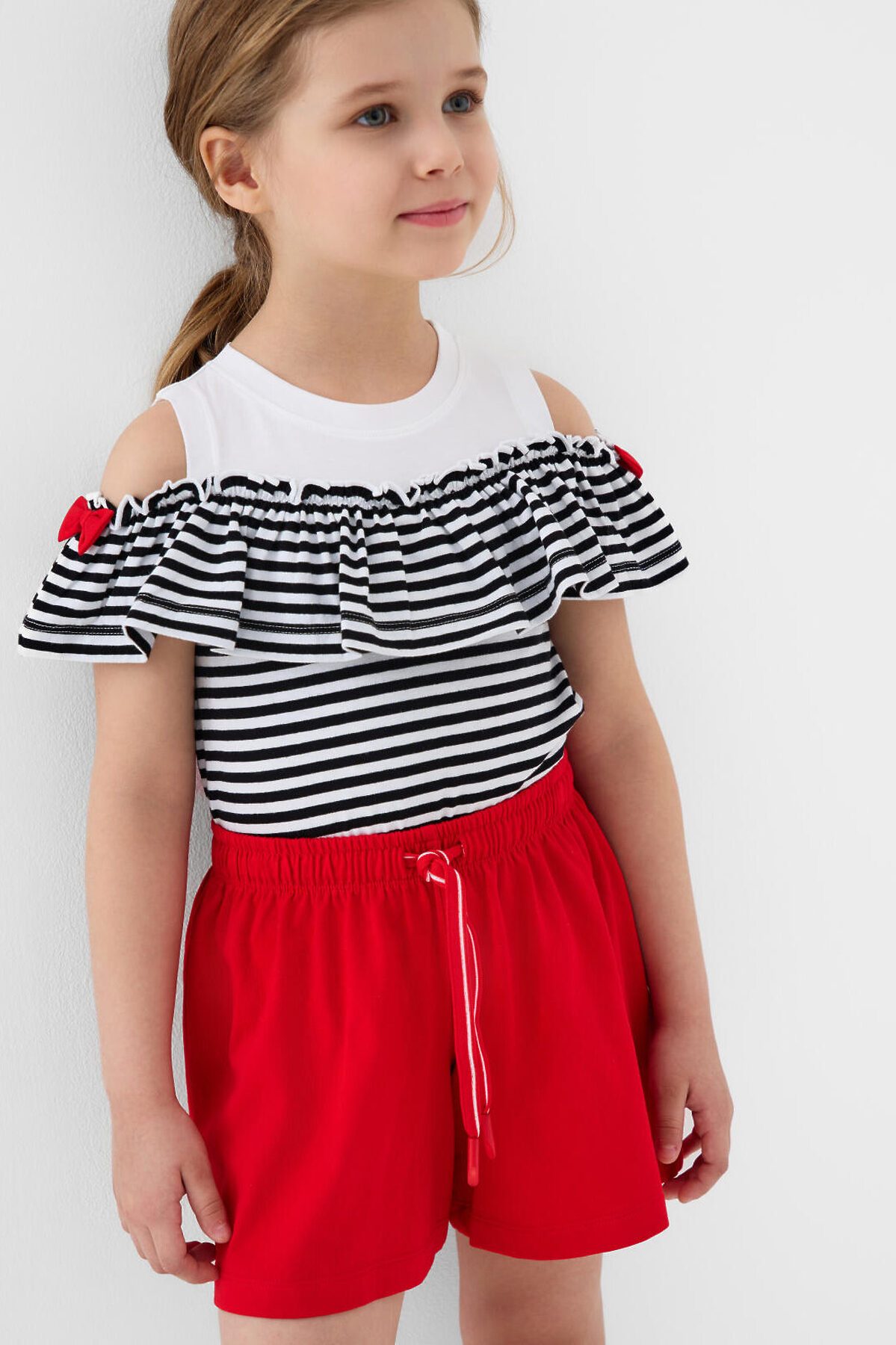 Детский костюм для девочки. Состоит из футболки с коротким рукавом и шорт. Выполнен из хлопкового трикотажа. Футболка прямого кроя, с рюшей и декоративными бантами. Шорты свободные, хорошо сидят на талии благодаря эластичному поясу и регулирующему шнурку.
