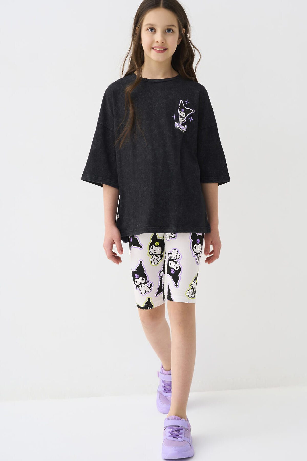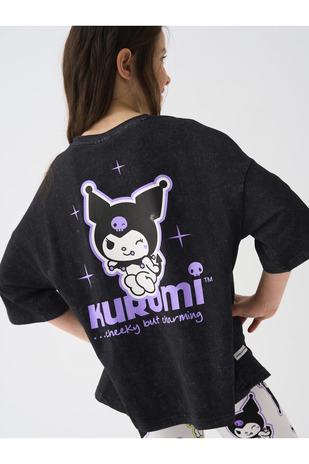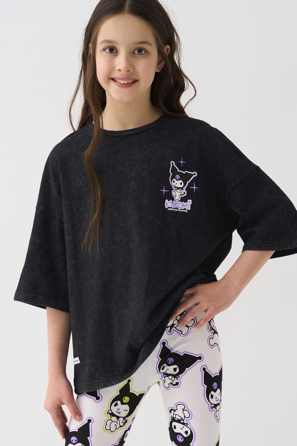 Футболка оверсайз для девочки подростка. Модель выполнена из меланжевого хлопкового трикотажа джерси. На груди и спинке расположен крупный принт с любимым персонажем Куроми.