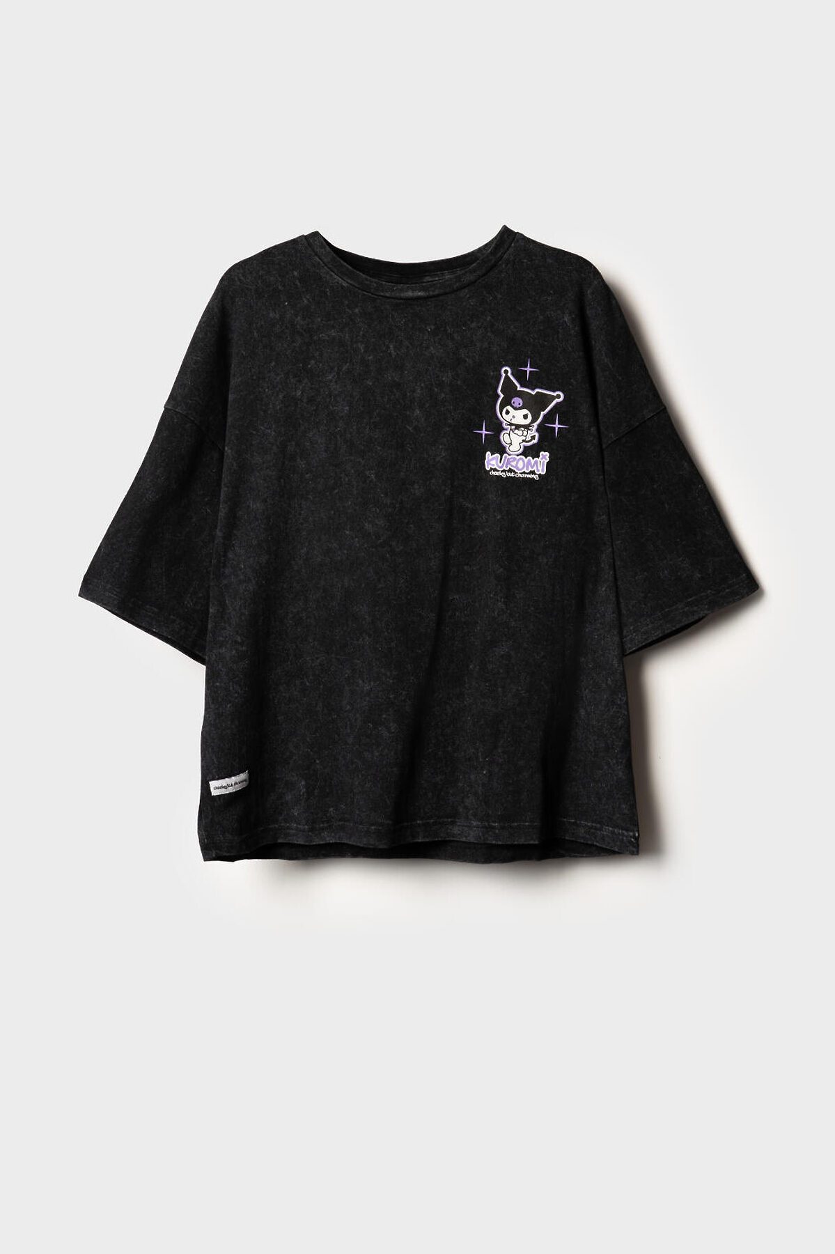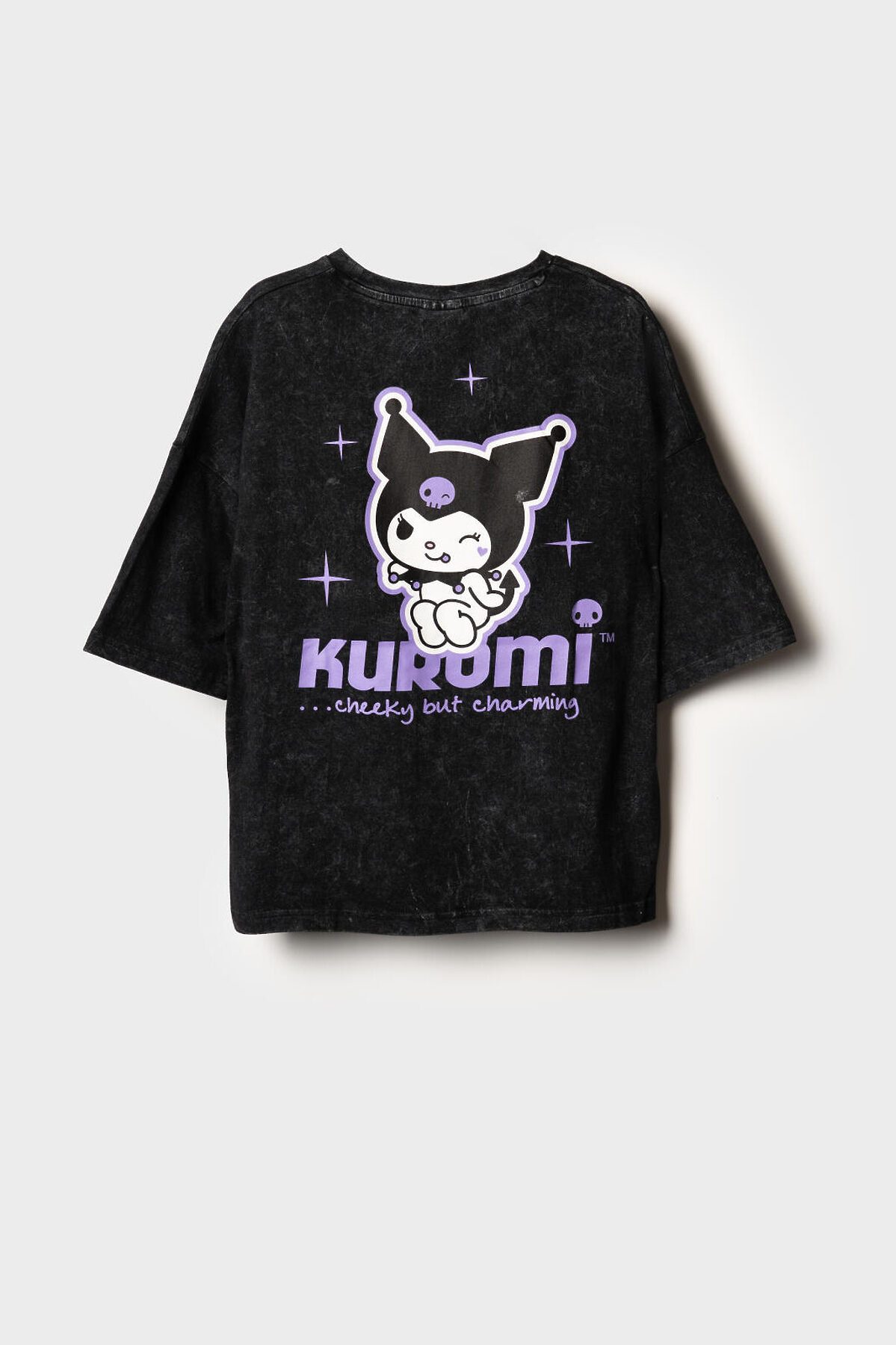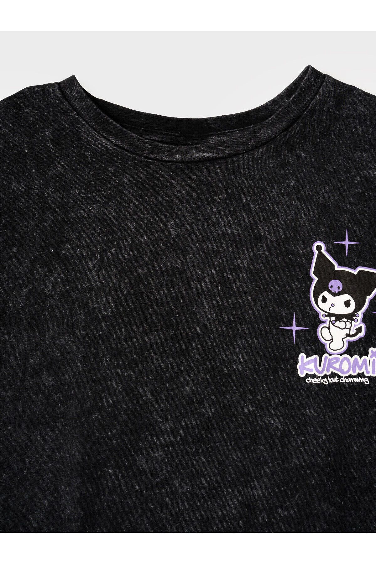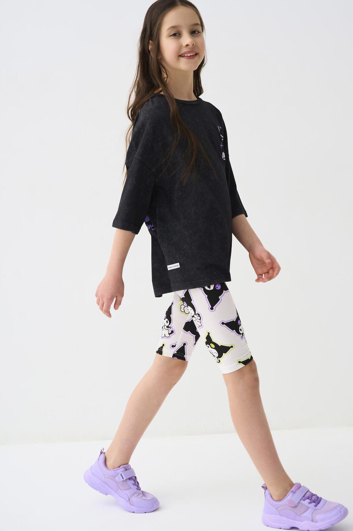 Футболка оверсайз для девочки подростка. Модель выполнена из меланжевого хлопкового трикотажа джерси. На груди и спинке расположен крупный принт с любимым персонажем Куроми.