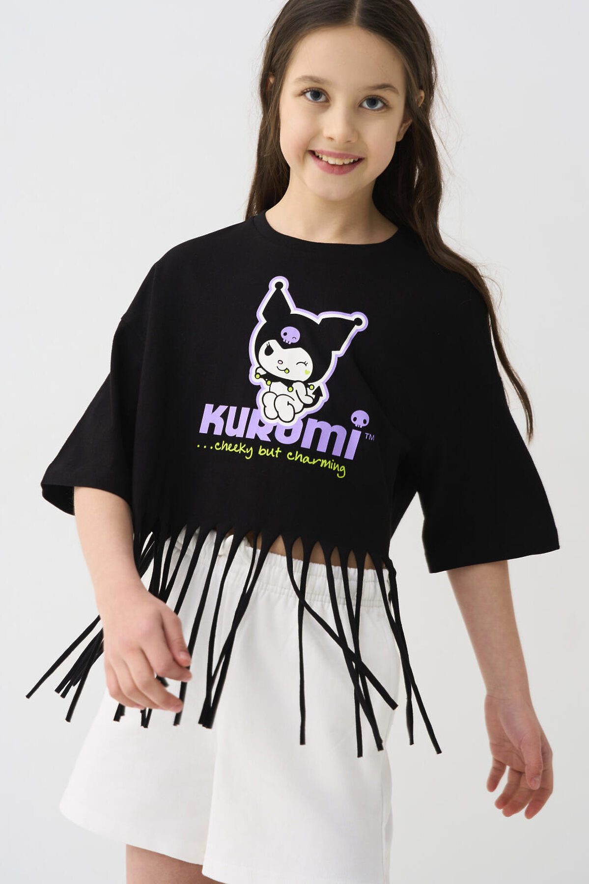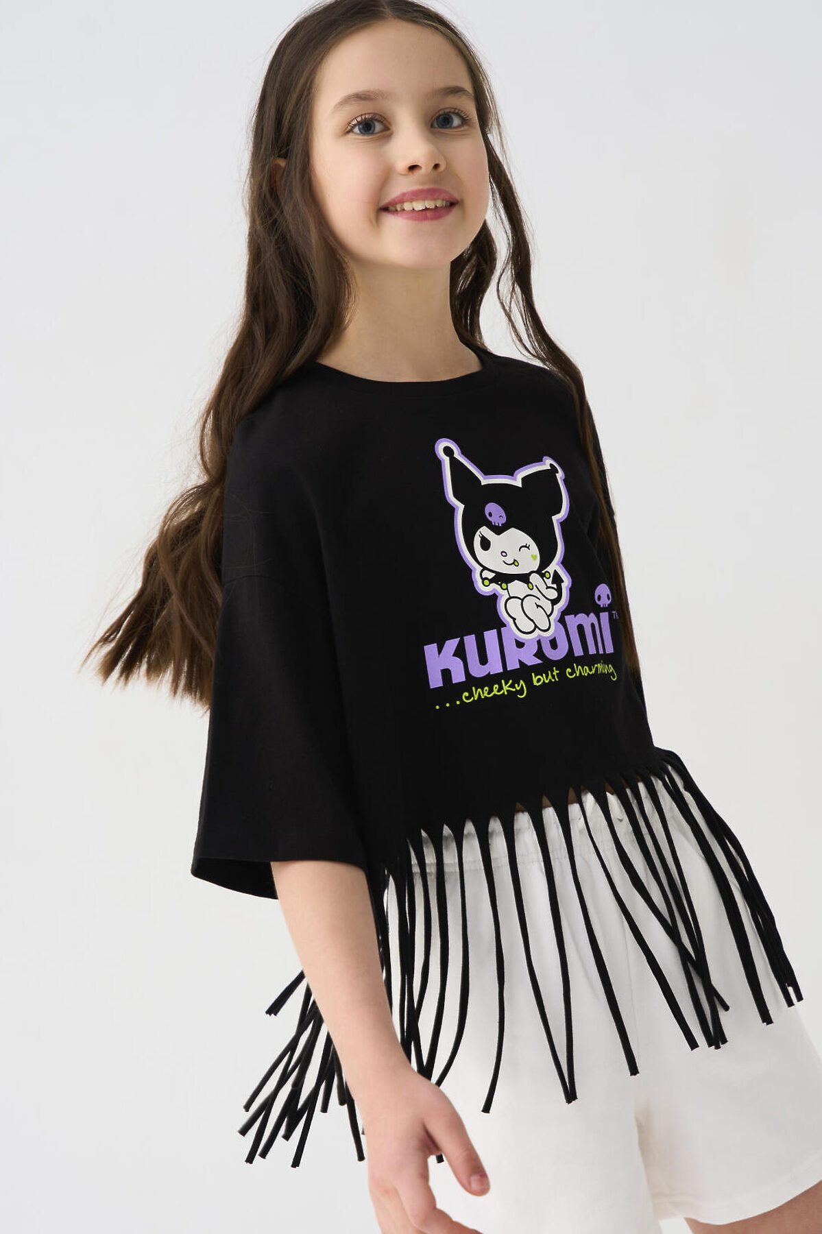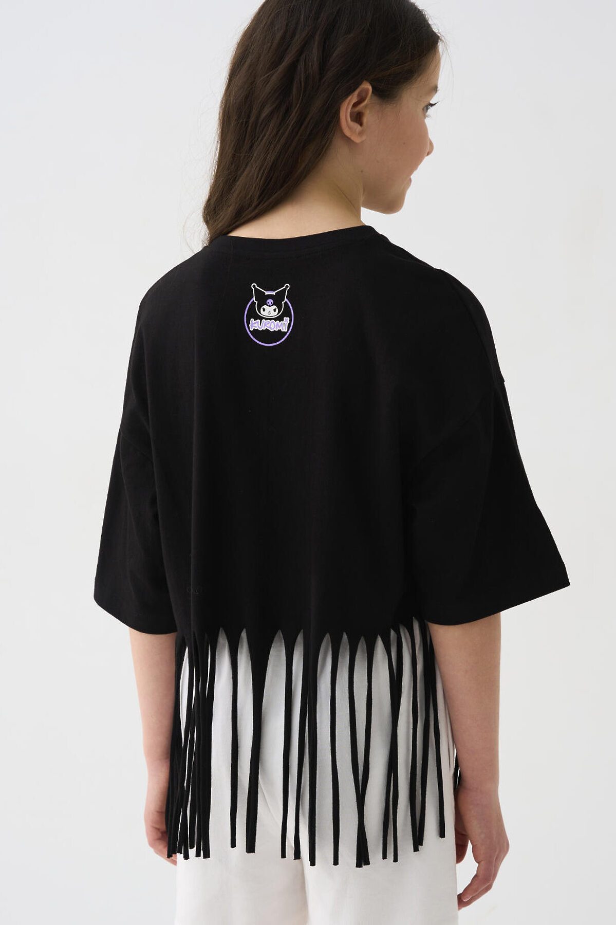 Футболка оверсайз для девочки подростка. Модель укороченная, выполнена из меланжевого хлопкового трикотажа джерси. На груди расположен крупный принт с любимым персонажем Куроми. По низу декоративная бахрома.