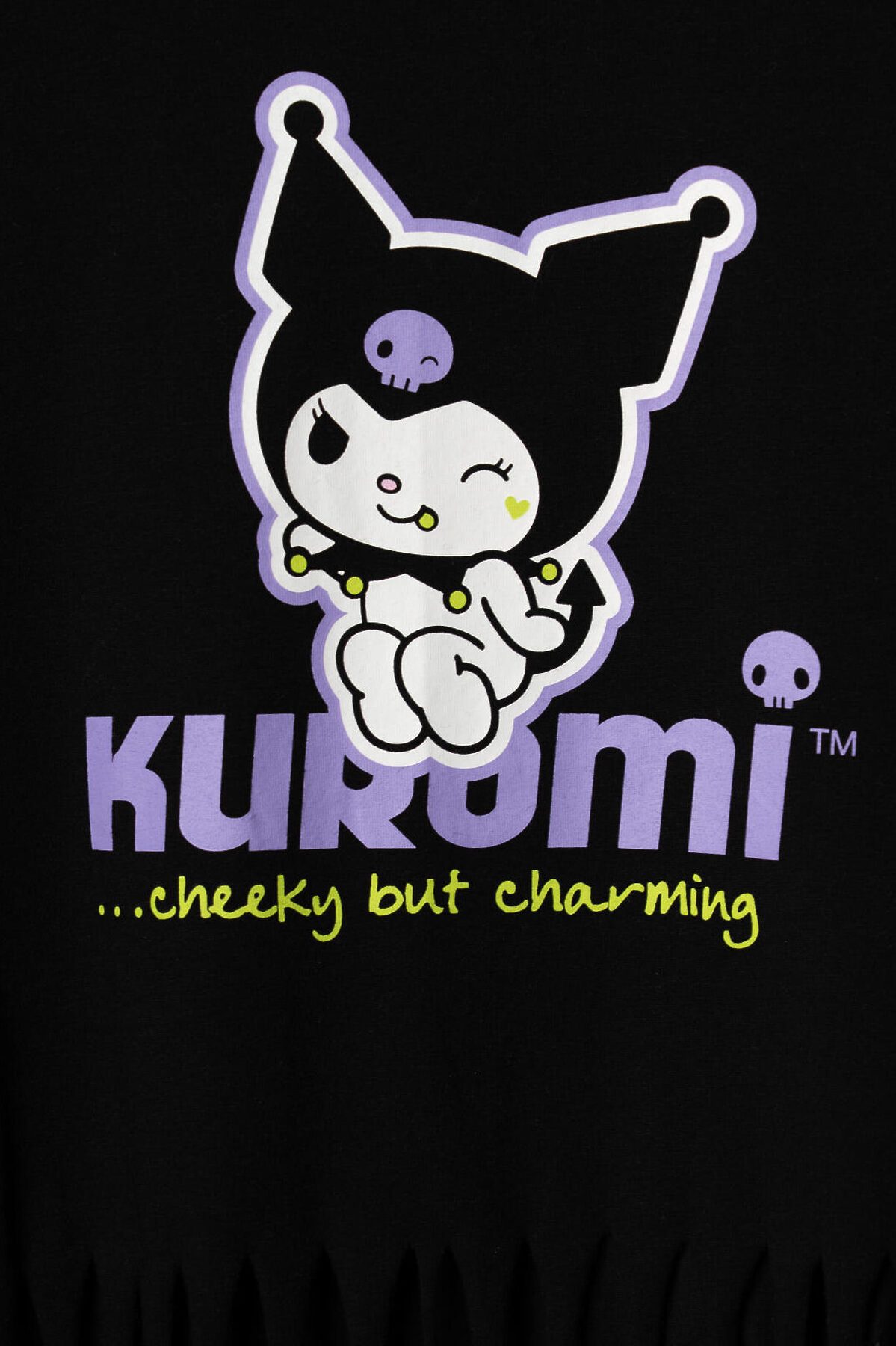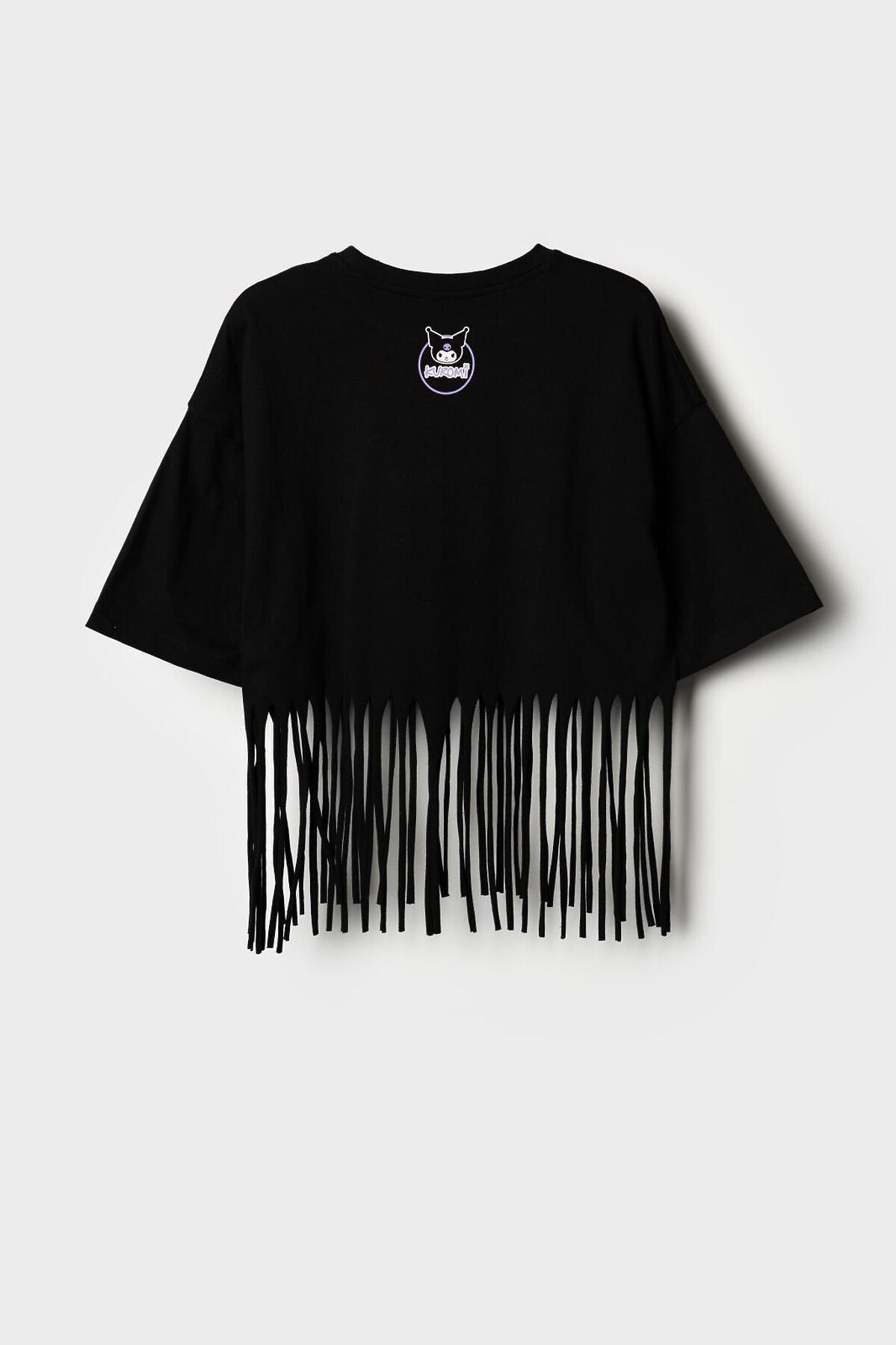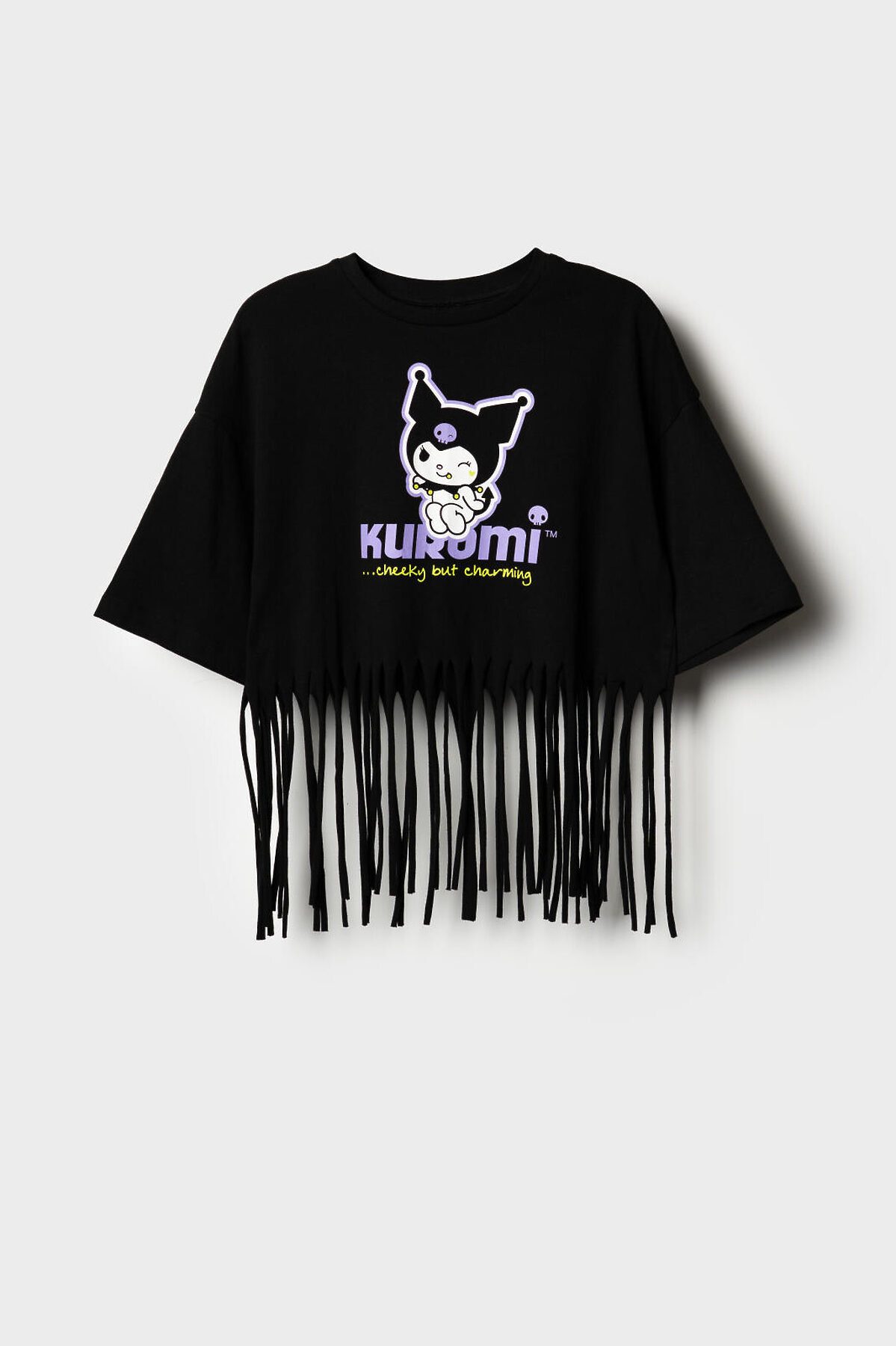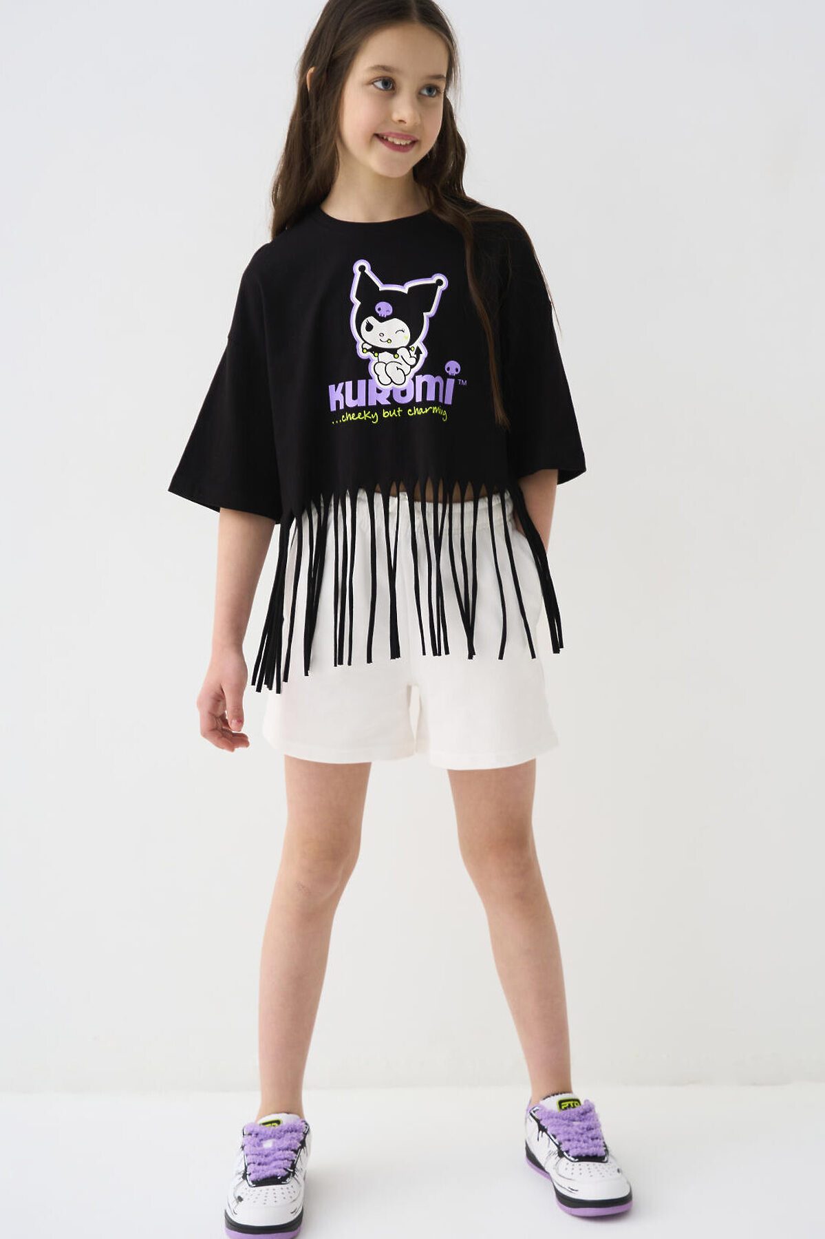 Футболка оверсайз для девочки подростка. Модель укороченная, выполнена из меланжевого хлопкового трикотажа джерси. На груди расположен крупный принт с любимым персонажем Куроми. По низу декоративная бахрома.
