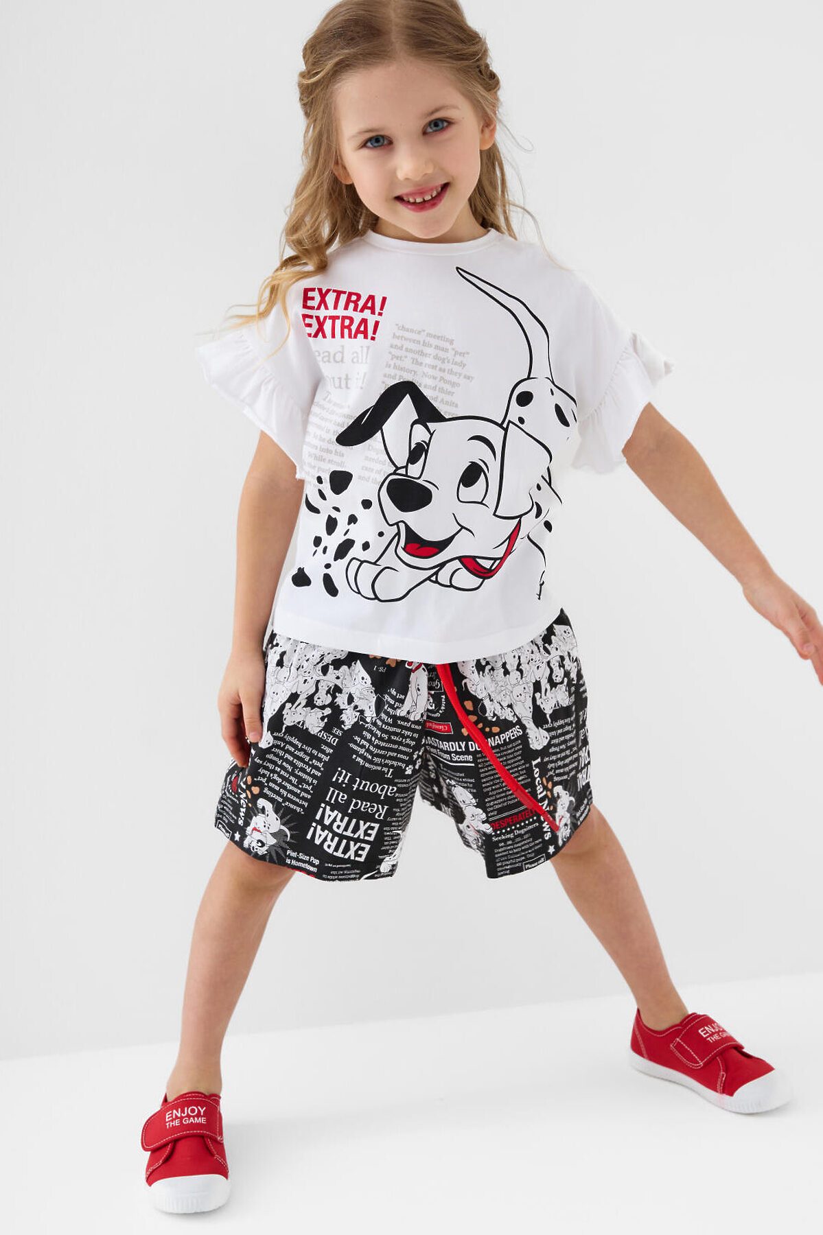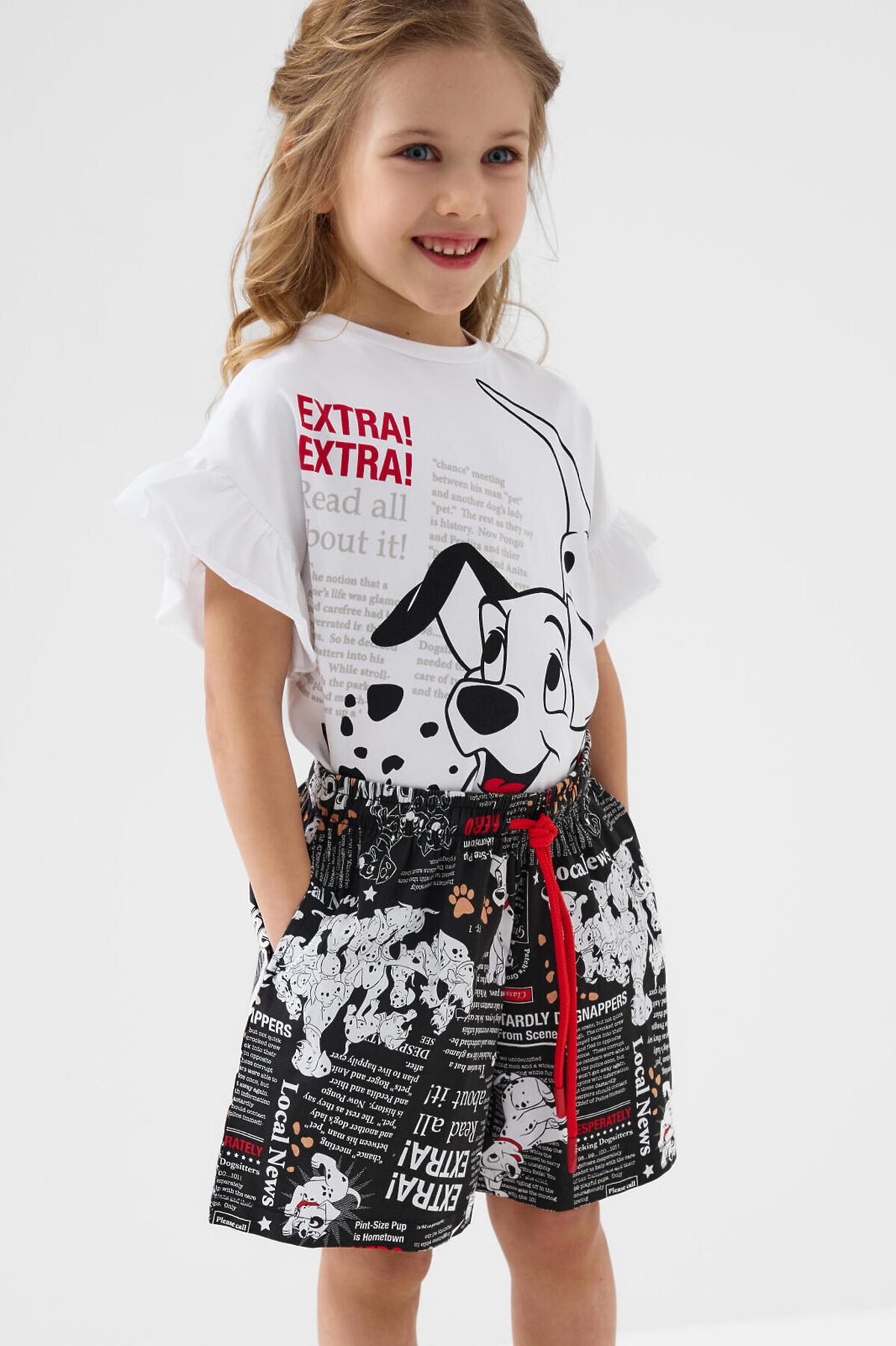 Детский костюм для девочки. Состоит из футболки с коротким рукавом и шорт. Выполнен из хлопкового трикотажа. Футболка свободного кроя, с красочным принтом с любимыми мультяшными персонажами "101 далматинец". Декоративные сборки по рукавам. Шорты свободные, хорошо сидят на талии благодаря эластичному поясу и регулирующему шнурку. Удобные боковые карманы.