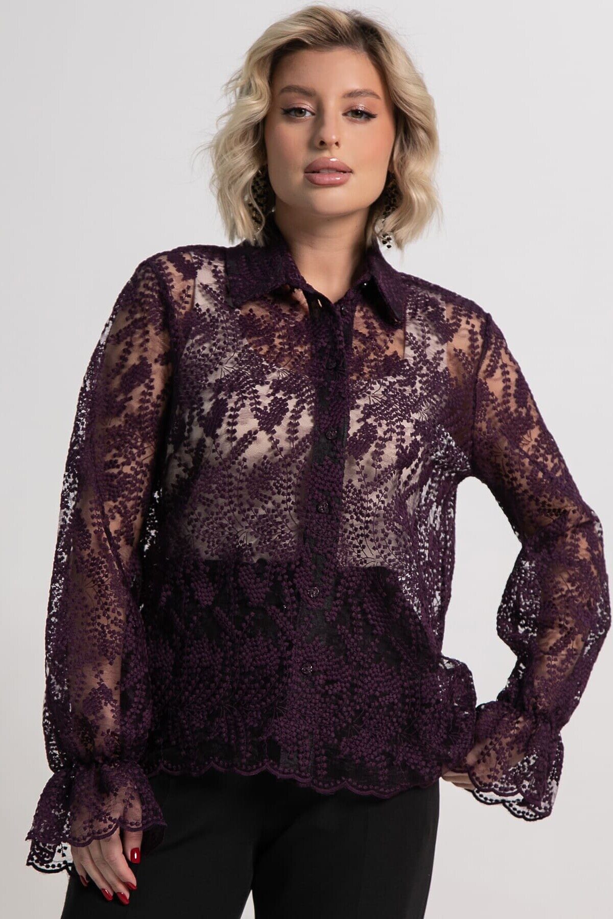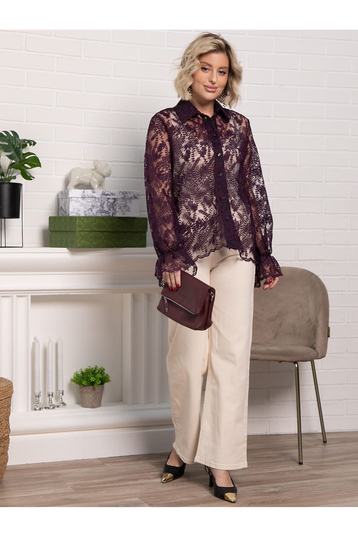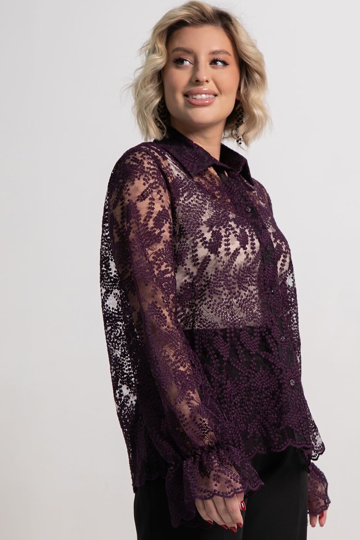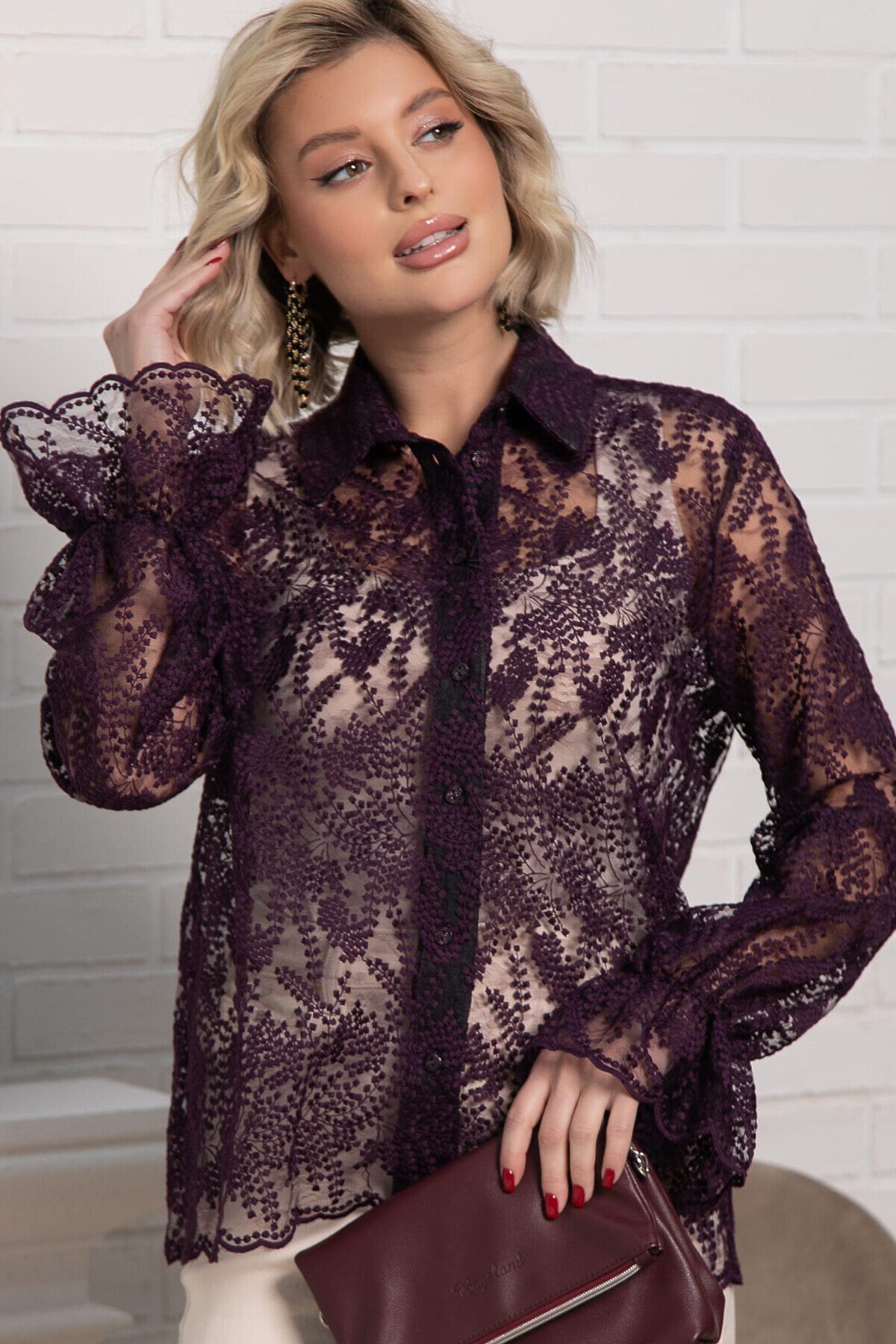 Позвольте себе окунуться в мир утонченной элегантности с нашей великолепной фиолетовой блузкой из кружевной ткани. Это не просто предмет одежды, а настоящее произведение искусства, созданное для того, чтобы подчеркнуть вашу женственность и неповторимый стиль. Погружение в роскошь: Цвет, пленяющий взгляд: Глубокий, насыщенный фиолетовый оттенок этой блузки придает ей особую магию. Он ассоциируется с роскошью, таинственностью и изысканностью, мгновенно привлекая внимание и создавая незабываемый образ. Нежность кружева: Искусно выполненное кружево становится главным украшением блузки. Его тонкие узоры, словно паутинка, создают завораживающий эффект, добавляя образу легкости, воздушности и чувственности. Выбирайте между классическими цветочными мотивами или более современными геометрическими узорами – каждая деталь продумана до мелочей.