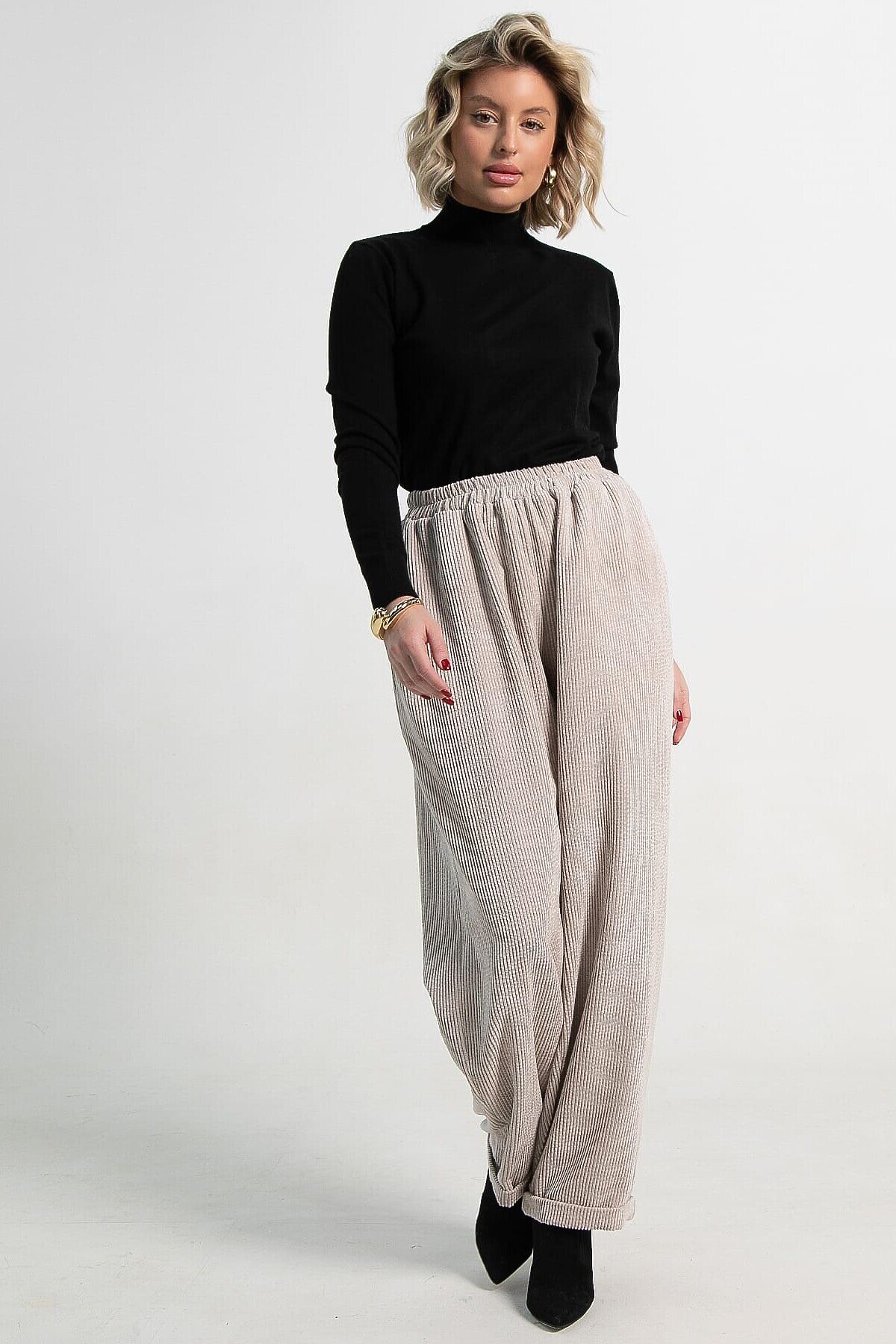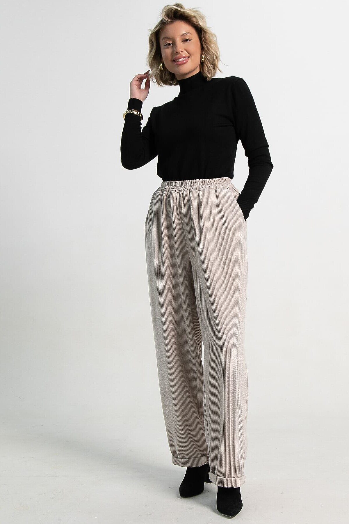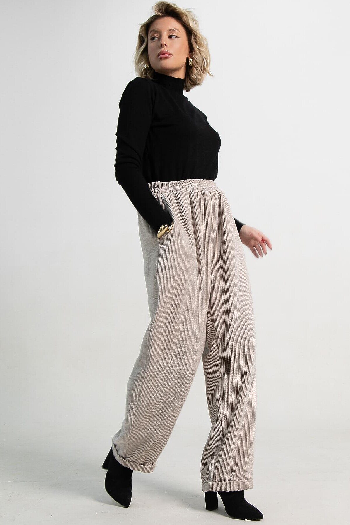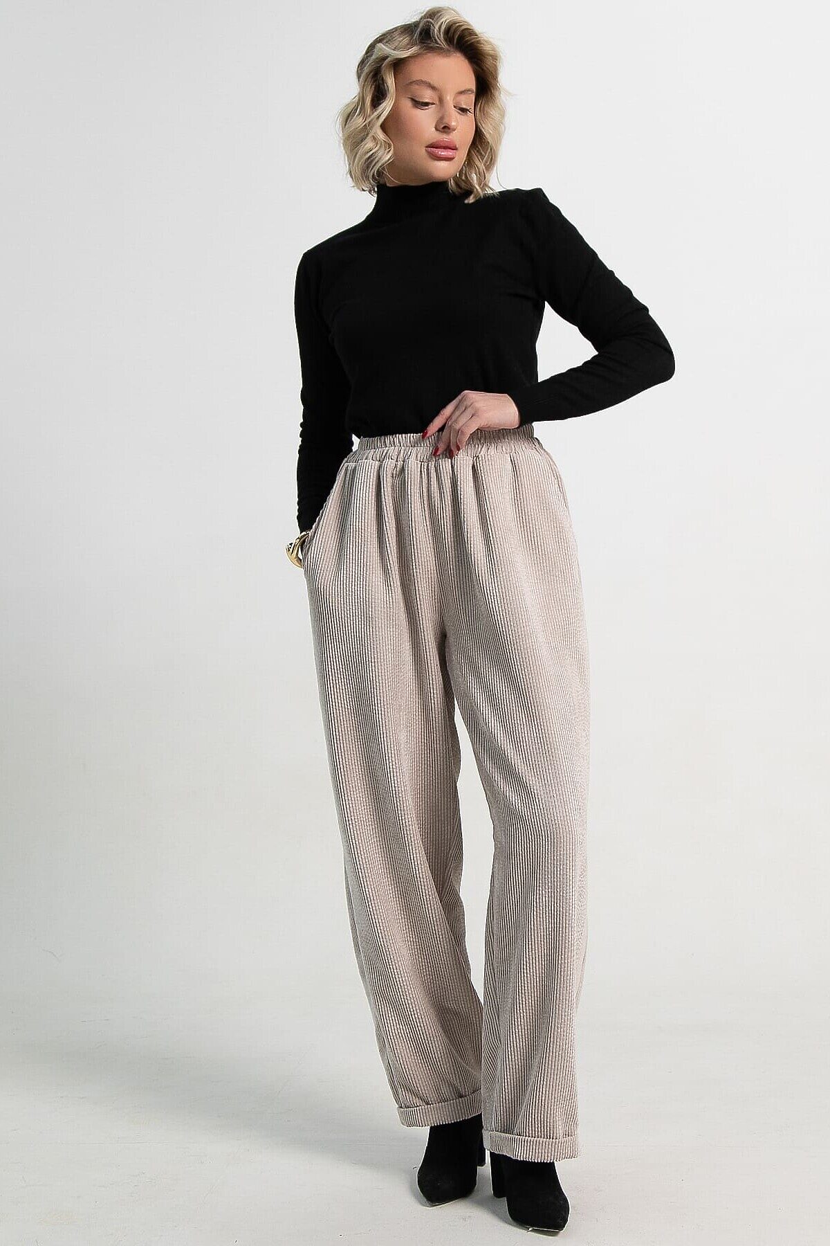 Мягкие женские брюки из вельвета в молочном цвете — идеальное сочетание удобства и элегантности. Эластичная резинка на талии и удобные карманы по бокам обеспечивают комфорт. Аккуратный отворот внизу придает образу завершенность и легкость.