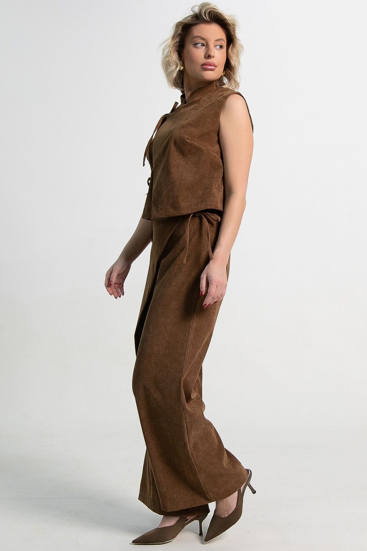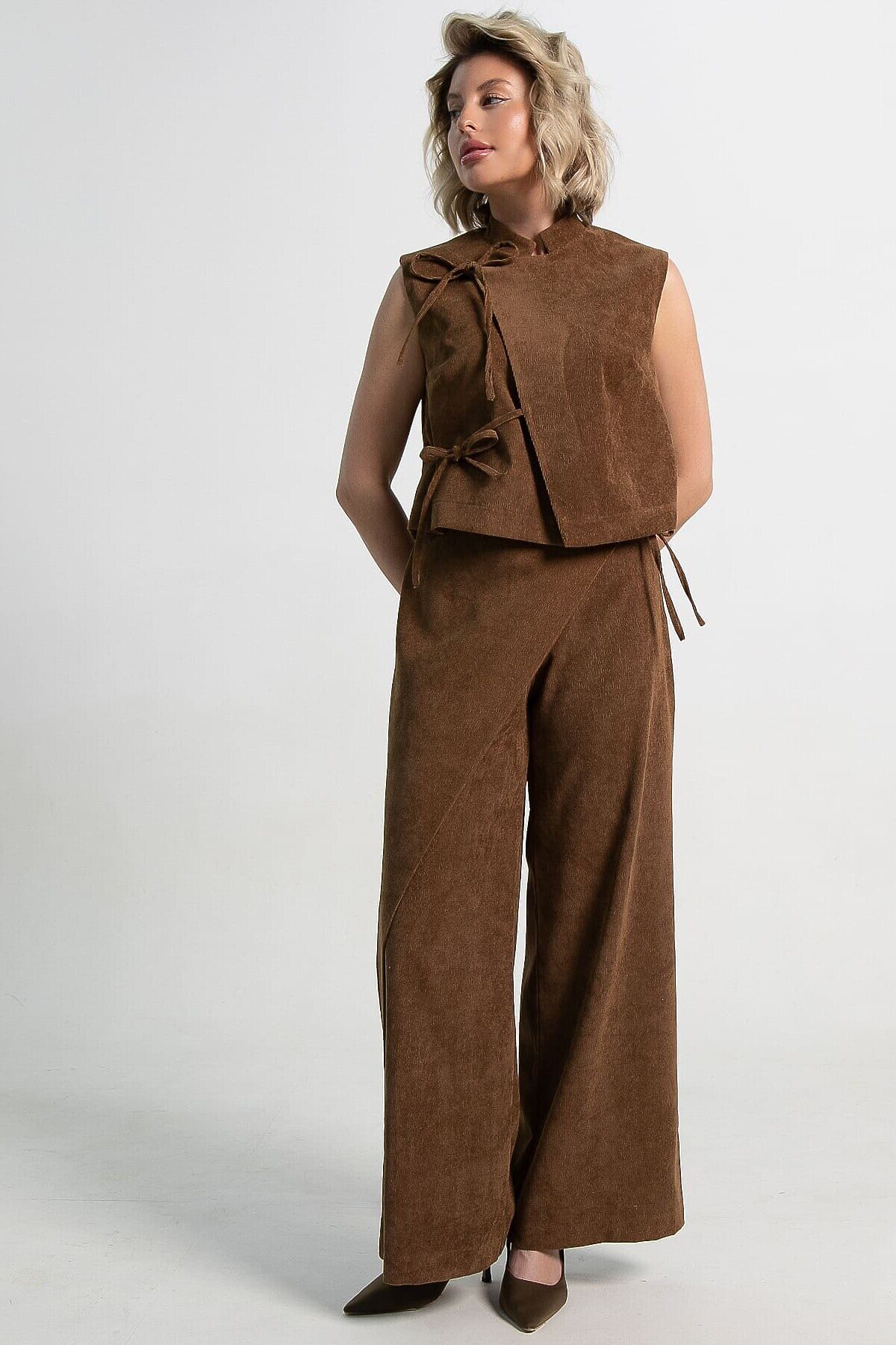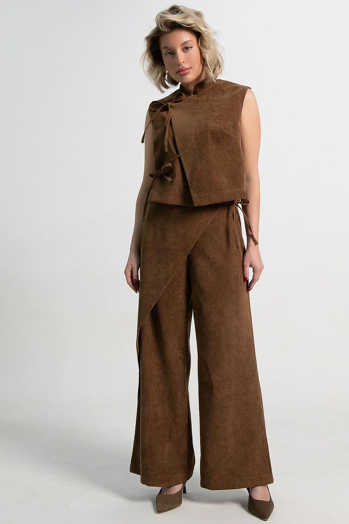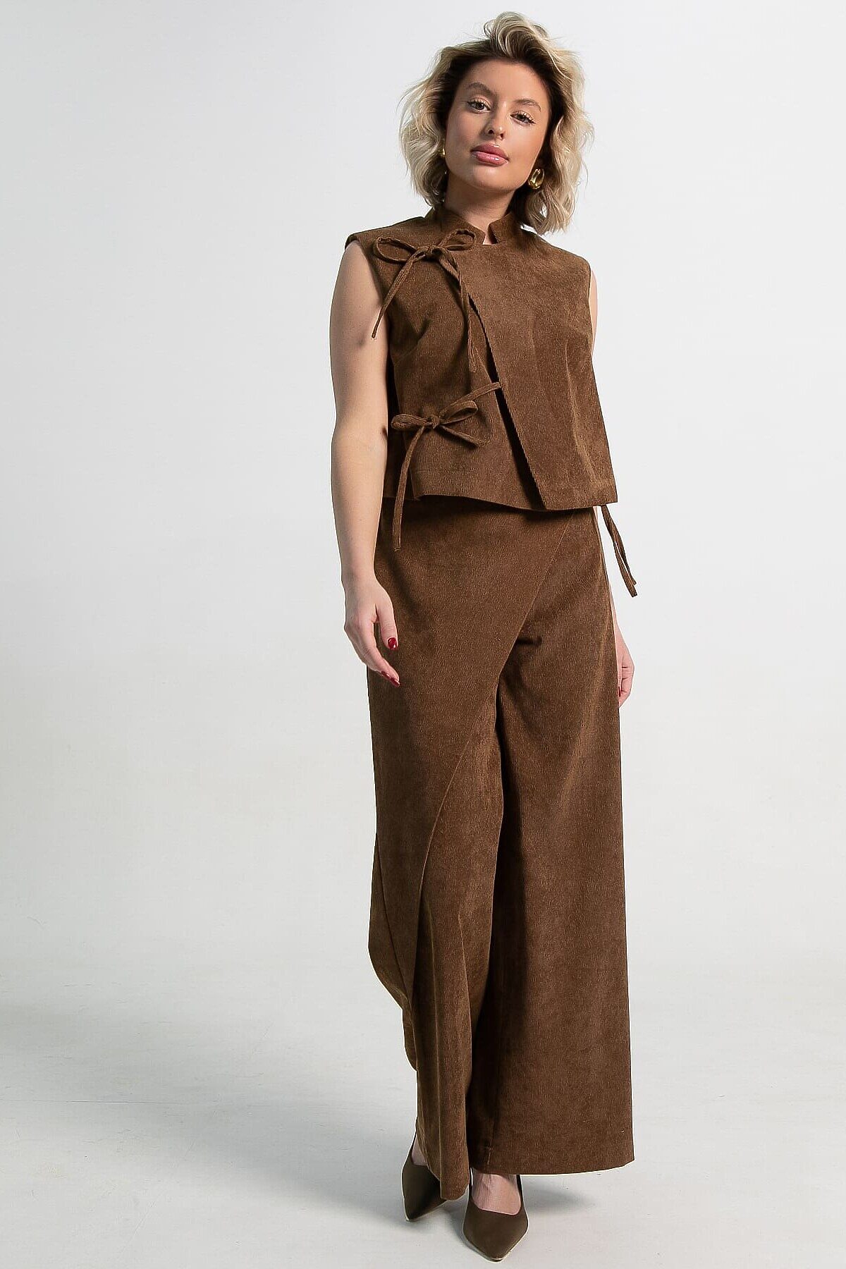 • Широкие брюки-палаццо с запахом: Комфорт встречается с элегантностью. Свободный крой дарит свободу движений, а асимметричный запах на брюках создает эффектный силуэт и добавляет образу динамики.