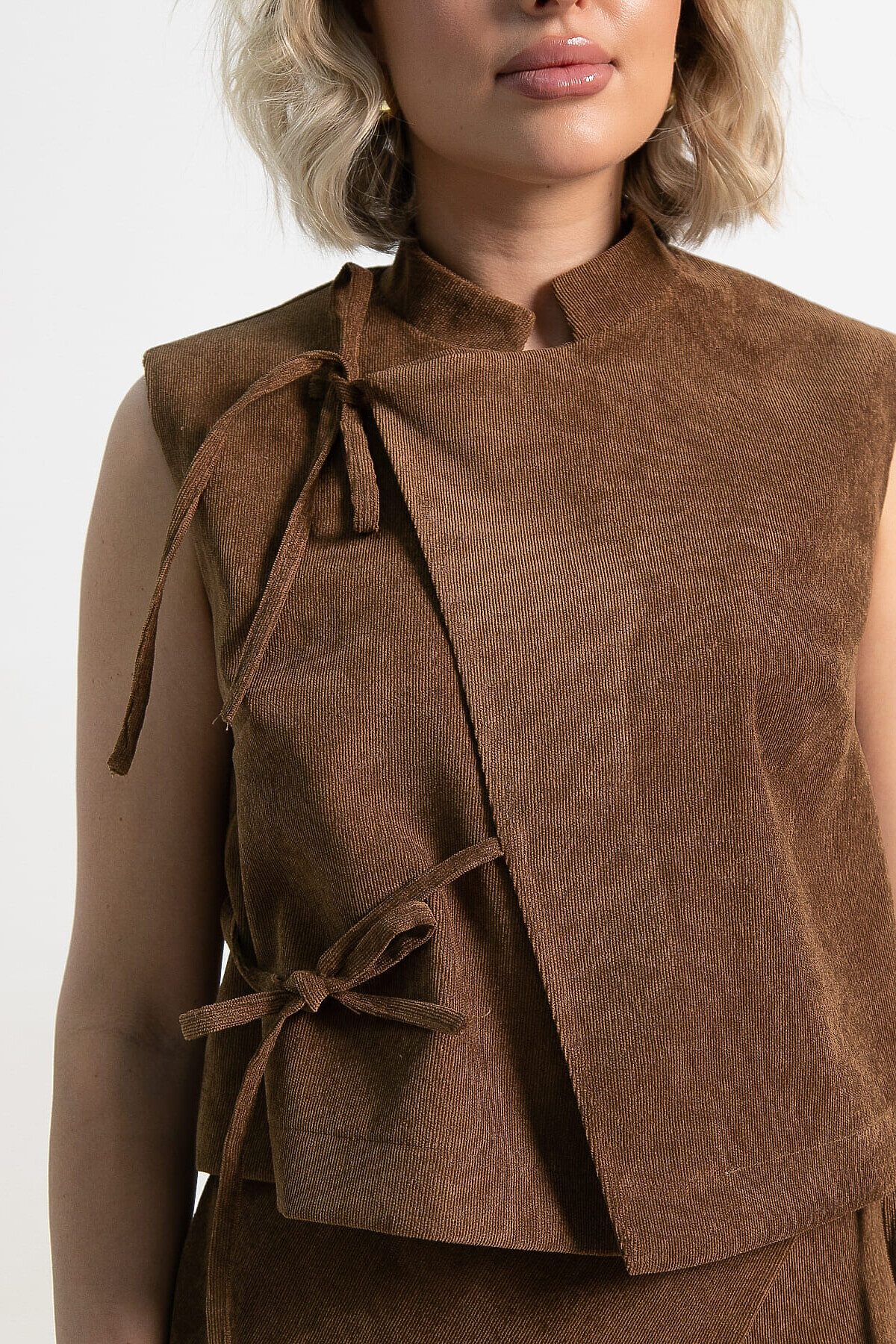 • Асимметричный жилет с воротником-стойкой: Этот элемент придает образу загадочность и изысканность, напоминая традиционные кимоно. Деликатные завязки добавляют шарм и позволяют регулировать посадку.