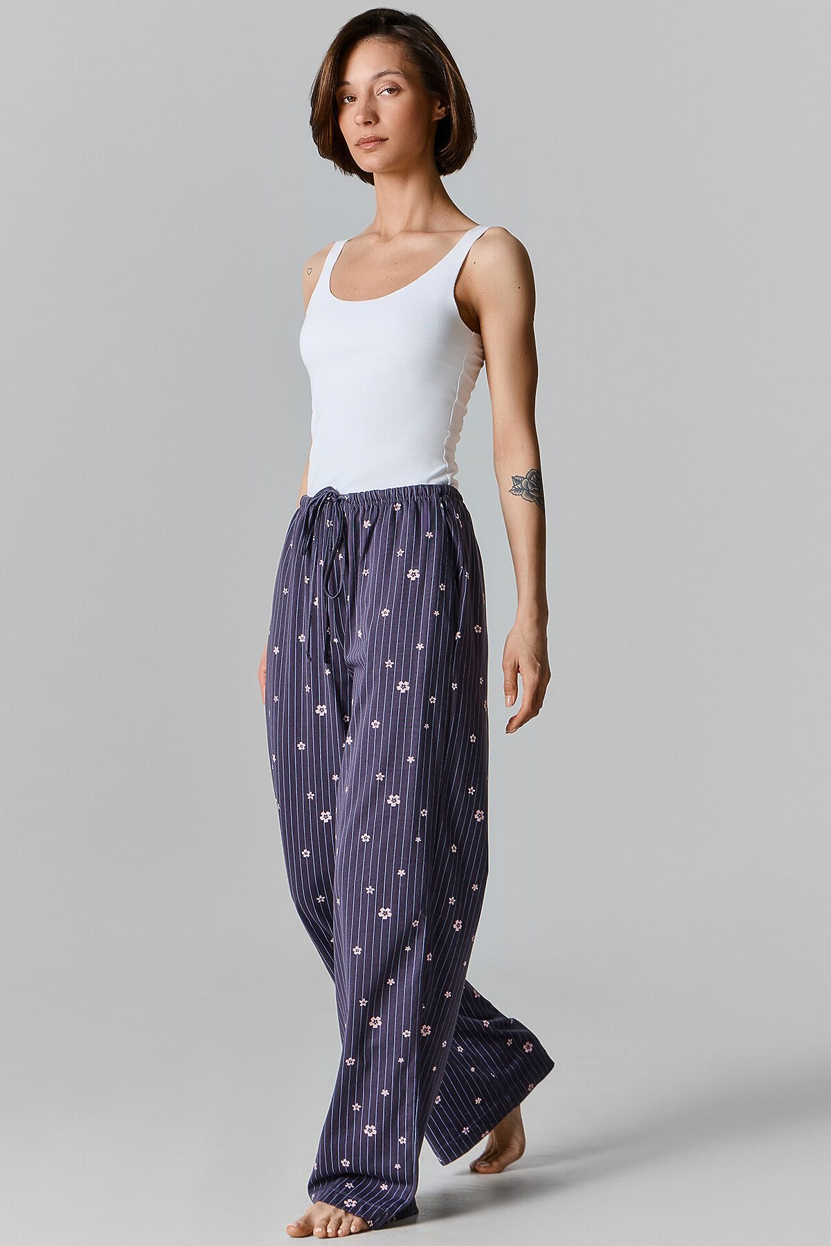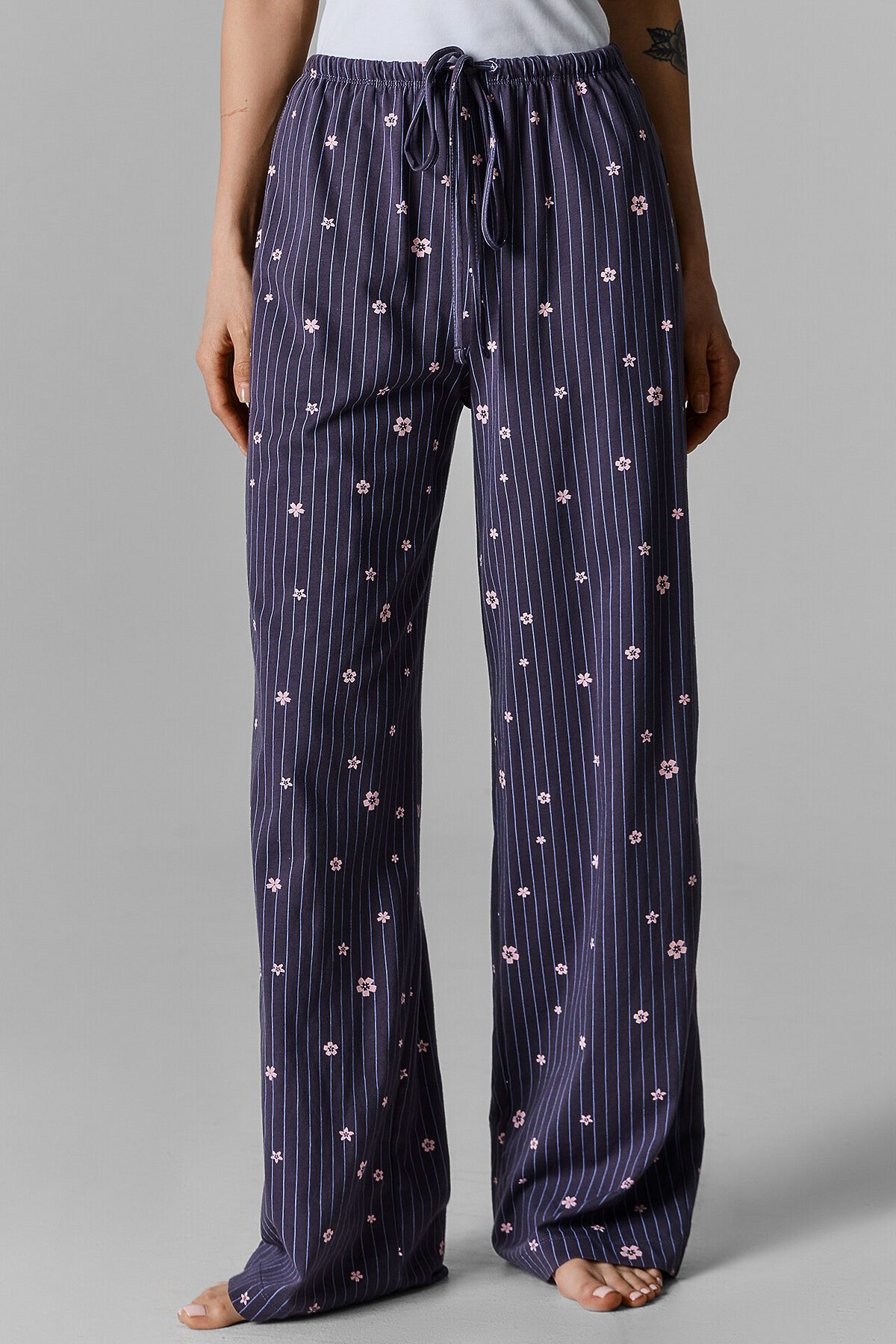 Женские домашние брюки с высокой посадкой — это свобода и уют, воплощенные в мягком хлопковом трикотаже. Свободный силуэт не стесняет движений, позволяя расслабиться и чувствовать себя максимально комфортно, будь то утро выходного дня или вечер после насыщенного дня. Эластичный пояс на кулиске адаптируется под фигуру, аккуратно фиксируя посадку без давления. Боковые карманы-хулиганы добавляют нотку игривости и функциональности — в них удобно спрятать мелочи, а сам акцент делает модель чуть более живой и непринужденной. Обработка низа швом в подгибку подчеркивает аккуратность исполнения и устойчивость изделия к деформации. Брюки выполнены из хлопковой кулирки — дышащего и приятного к телу материала, который дарит ощущение мягкости и естественности.