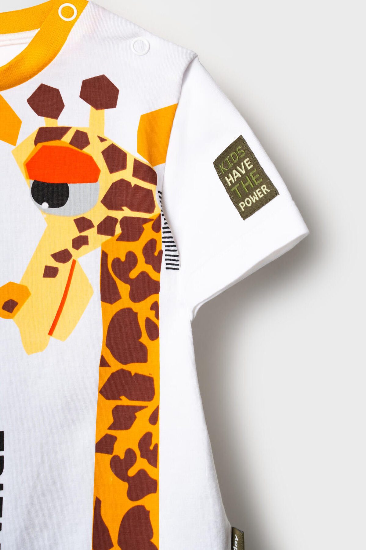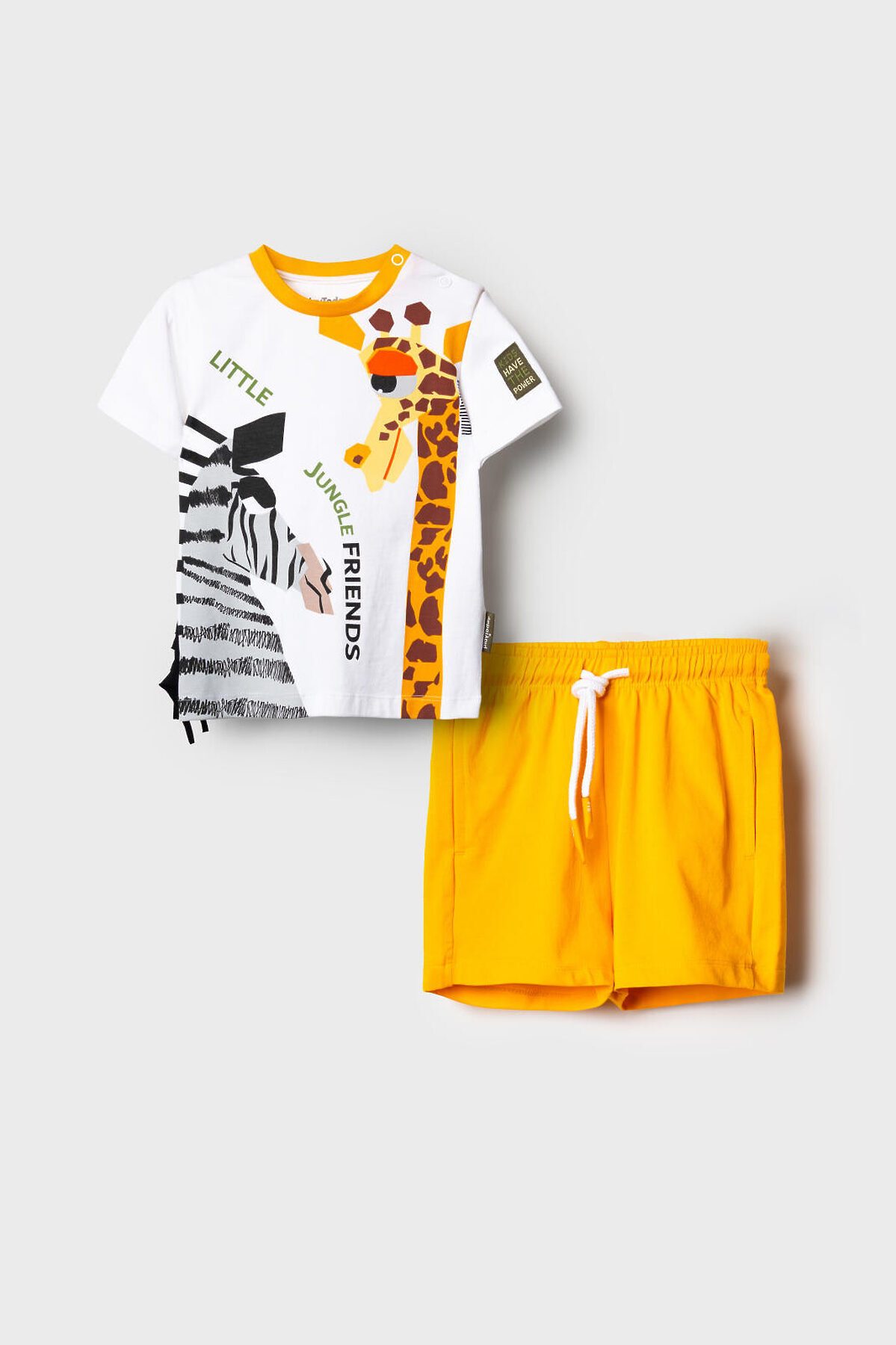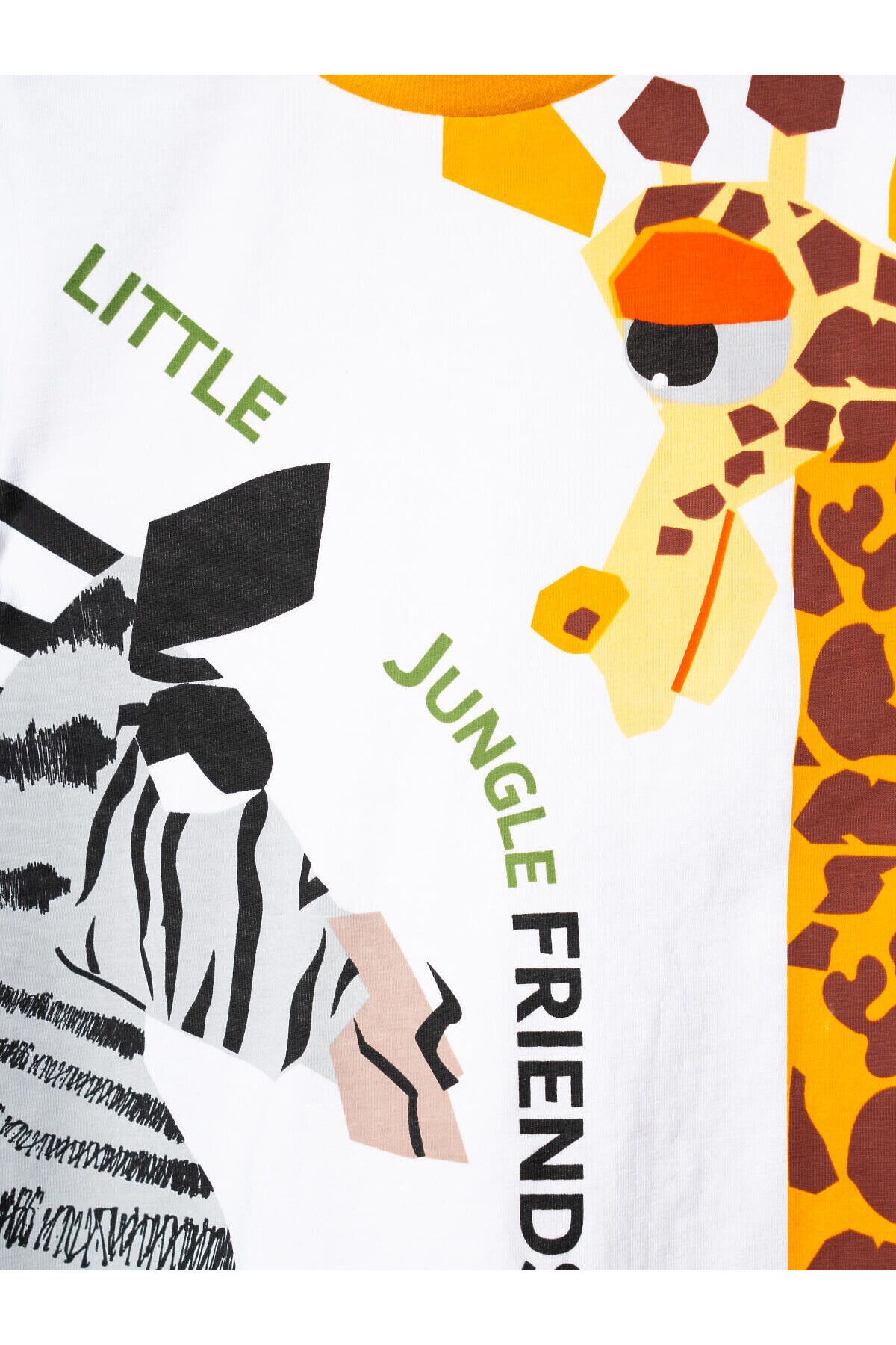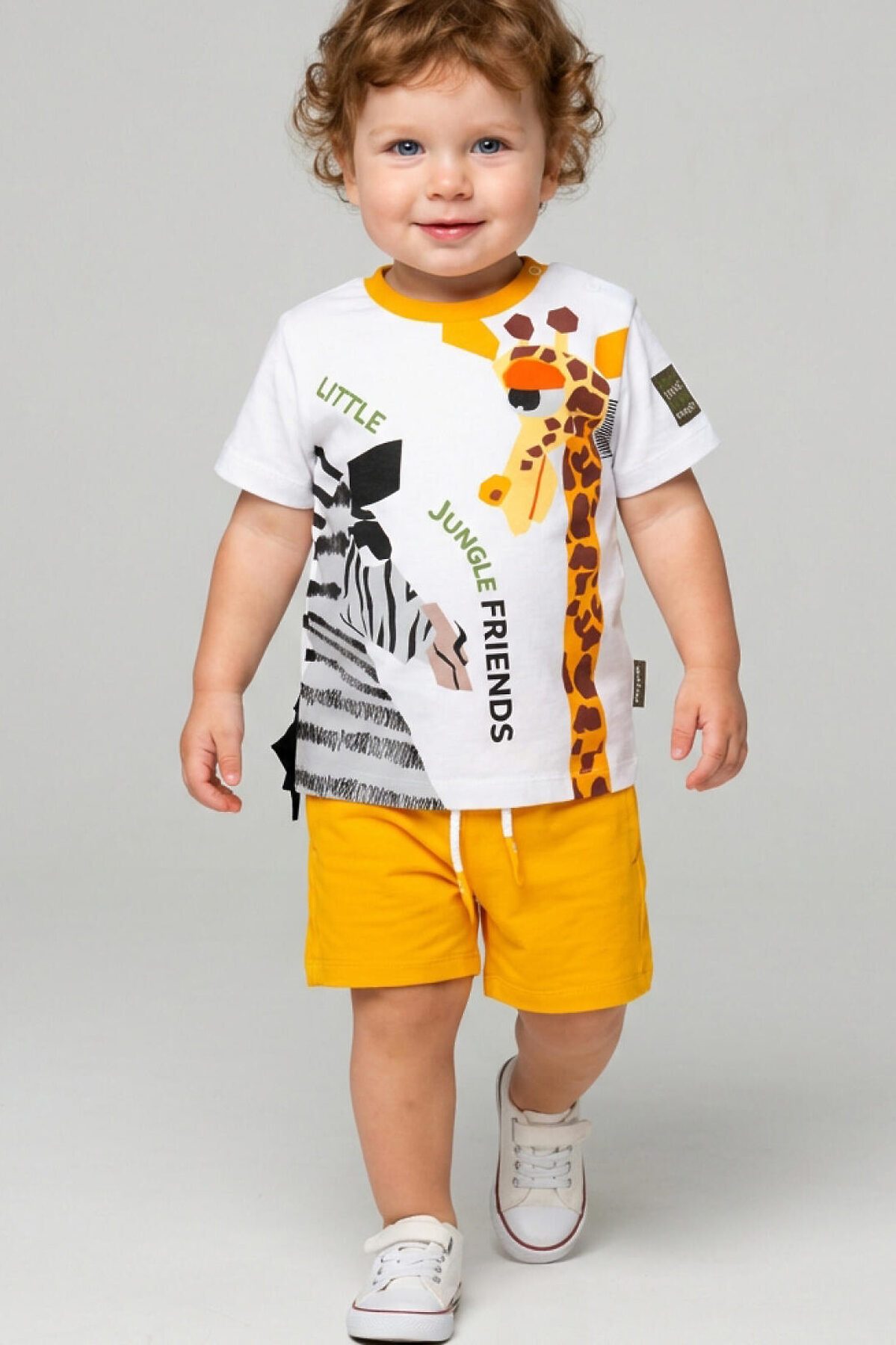 Детский костюм для мальчика. Состоит из футболки и шорт. Выполнен из хлопкового трикотажа. Футболка прямого кроя, с коротким рукавом. На плече застежка на кнопки для удобного переодевания. Яркий принт с милыми животными и нашивка. Декоративная бахрома, имитирующая гриву зебры. Шорты свободные, с эластичным поясом и шнурком для регулировки посадки. По бокам расположены карманы.